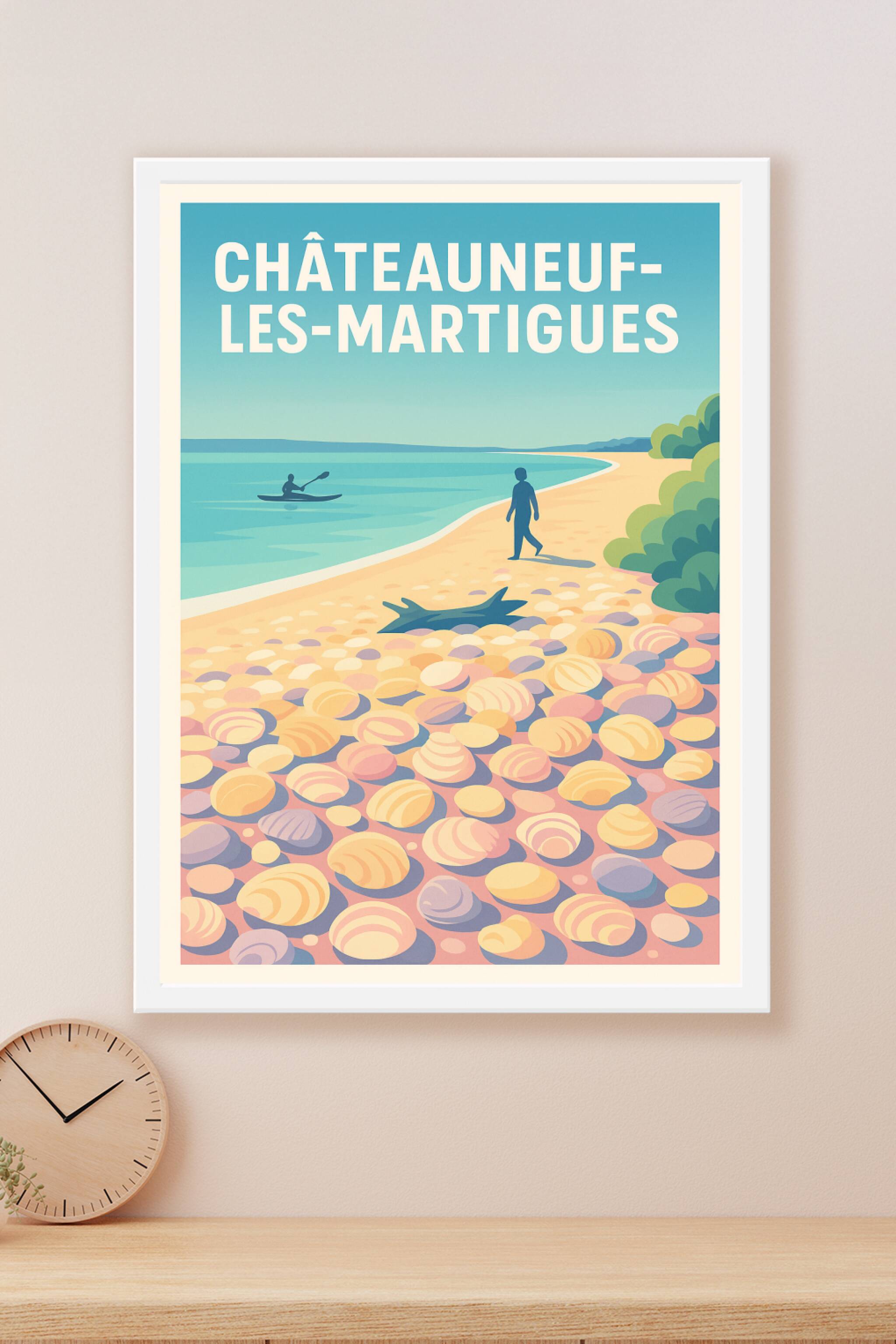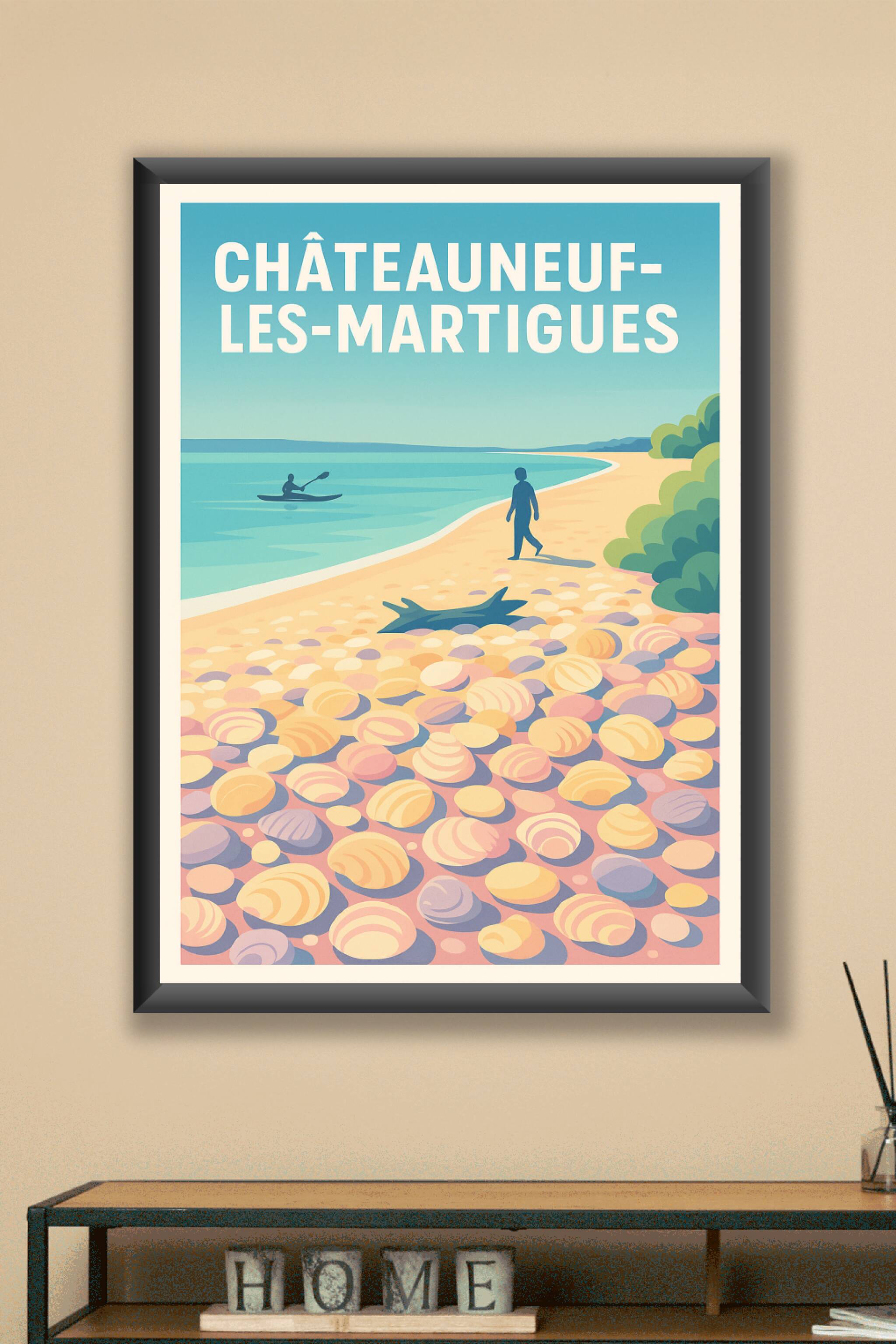 Découvrez la douceur et la sérénité de Châteauneuf-les-Martigues avec cette affiche illustrée représentant une plage paisible parsemée de galets co...