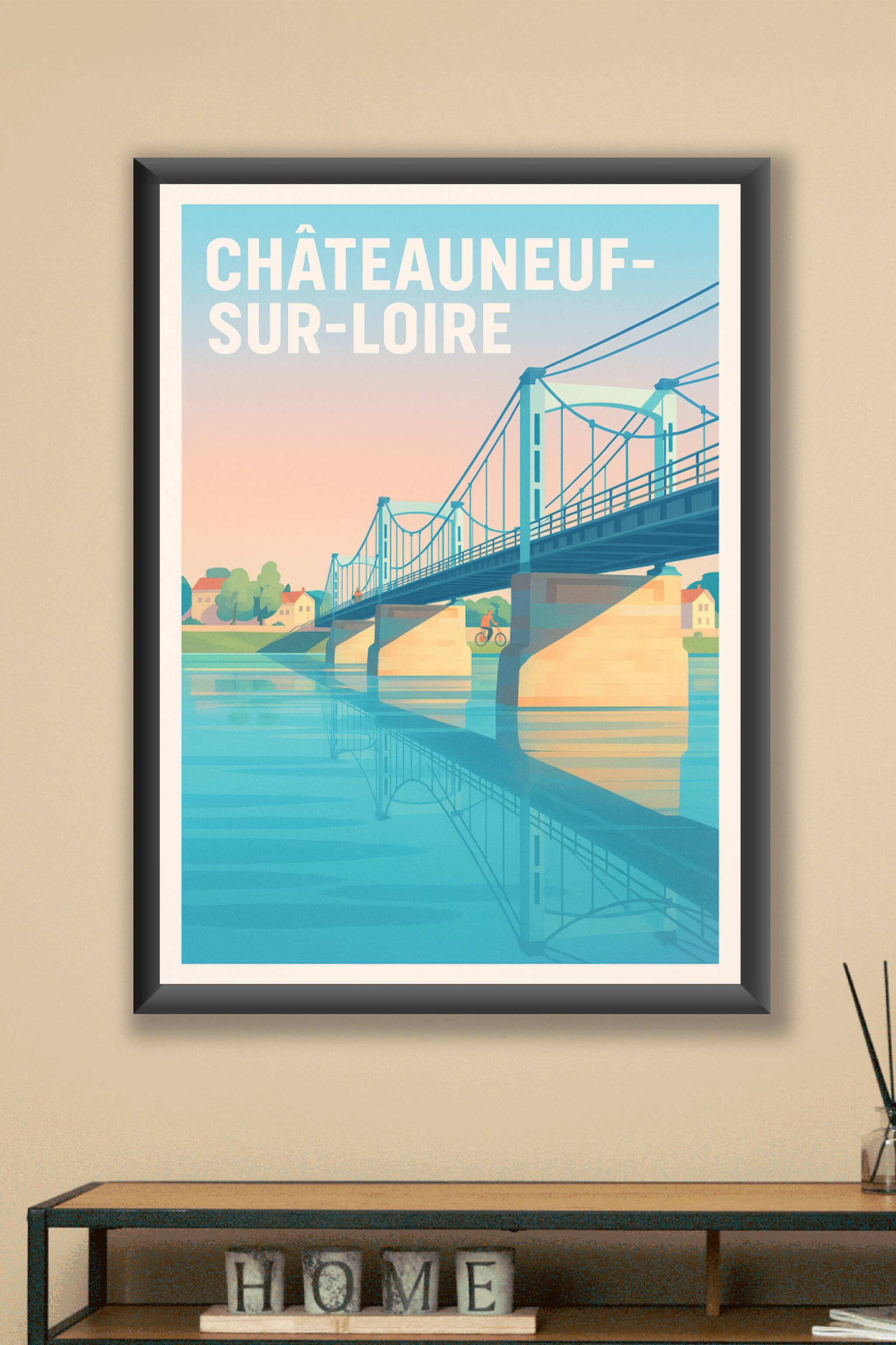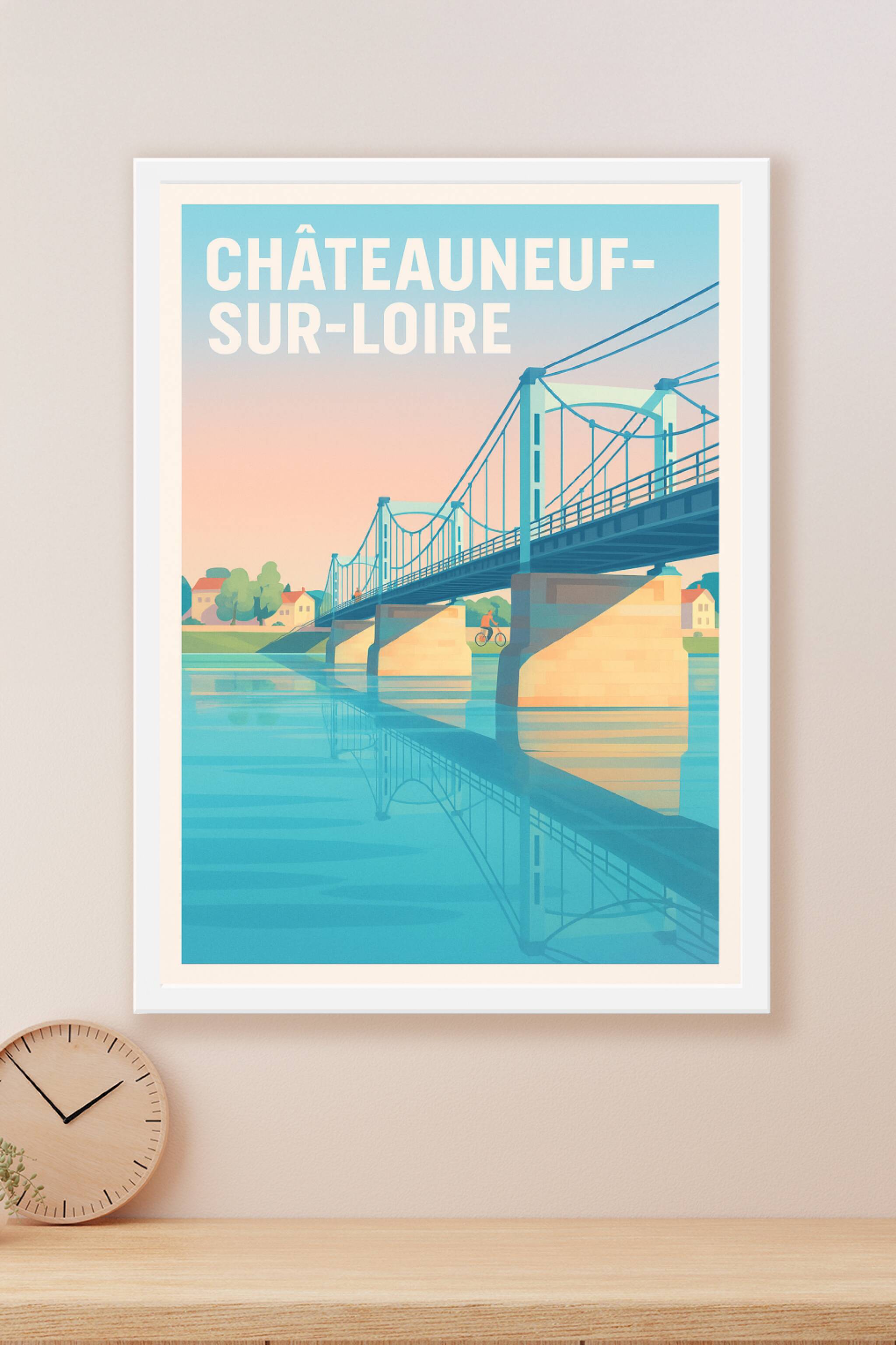 Découvrez ce poster vintage illustrant le célèbre pont suspendu de Châteauneuf-sur-Loire, un symbole d'élégance et de tranquillité au bord de la Lo...