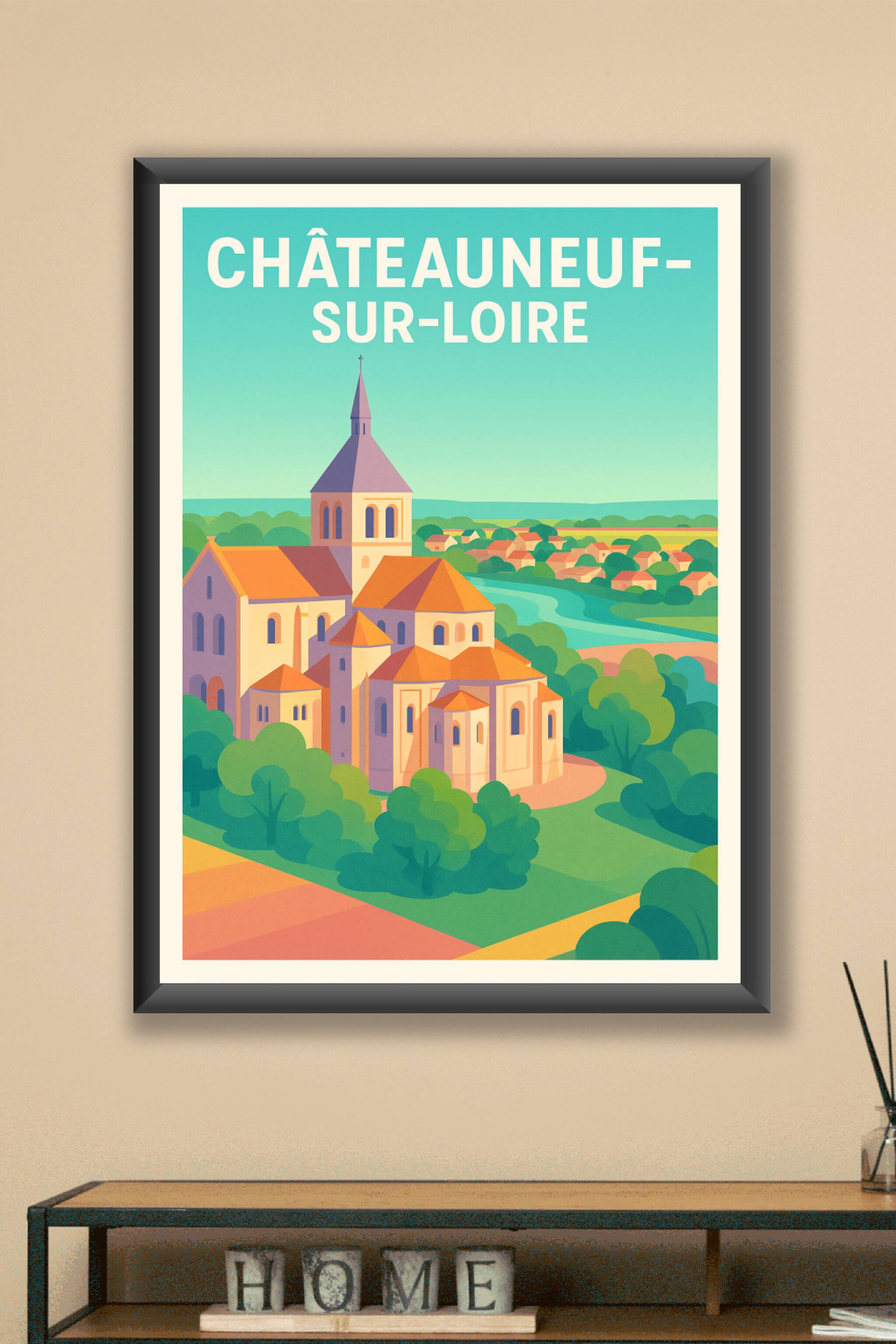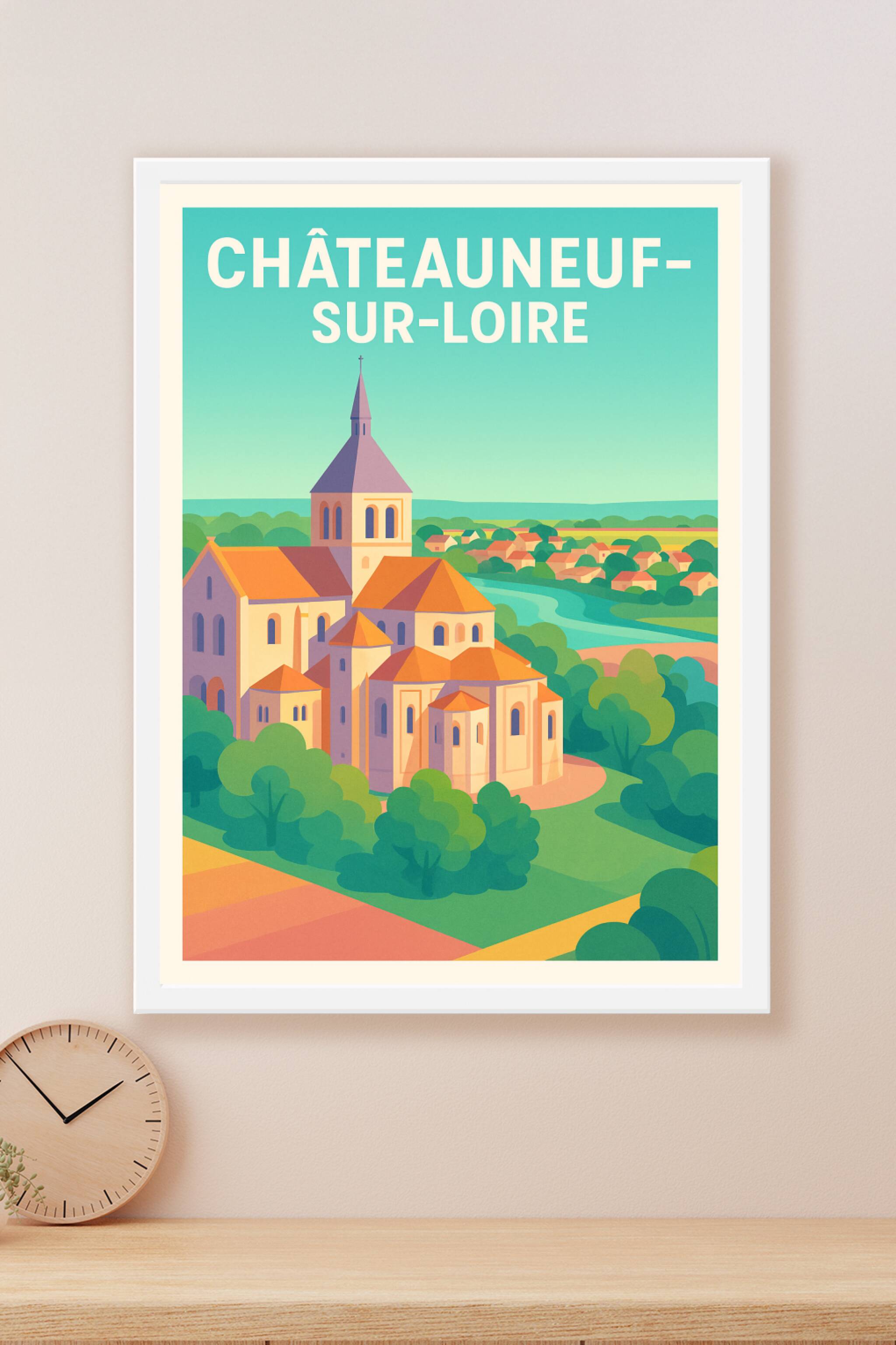 Découvrez l'élégance sereine de Châteauneuf-sur-Loire avec cette affiche artistique illustrant les toits orangés et l'architecture typique de ce jo...
