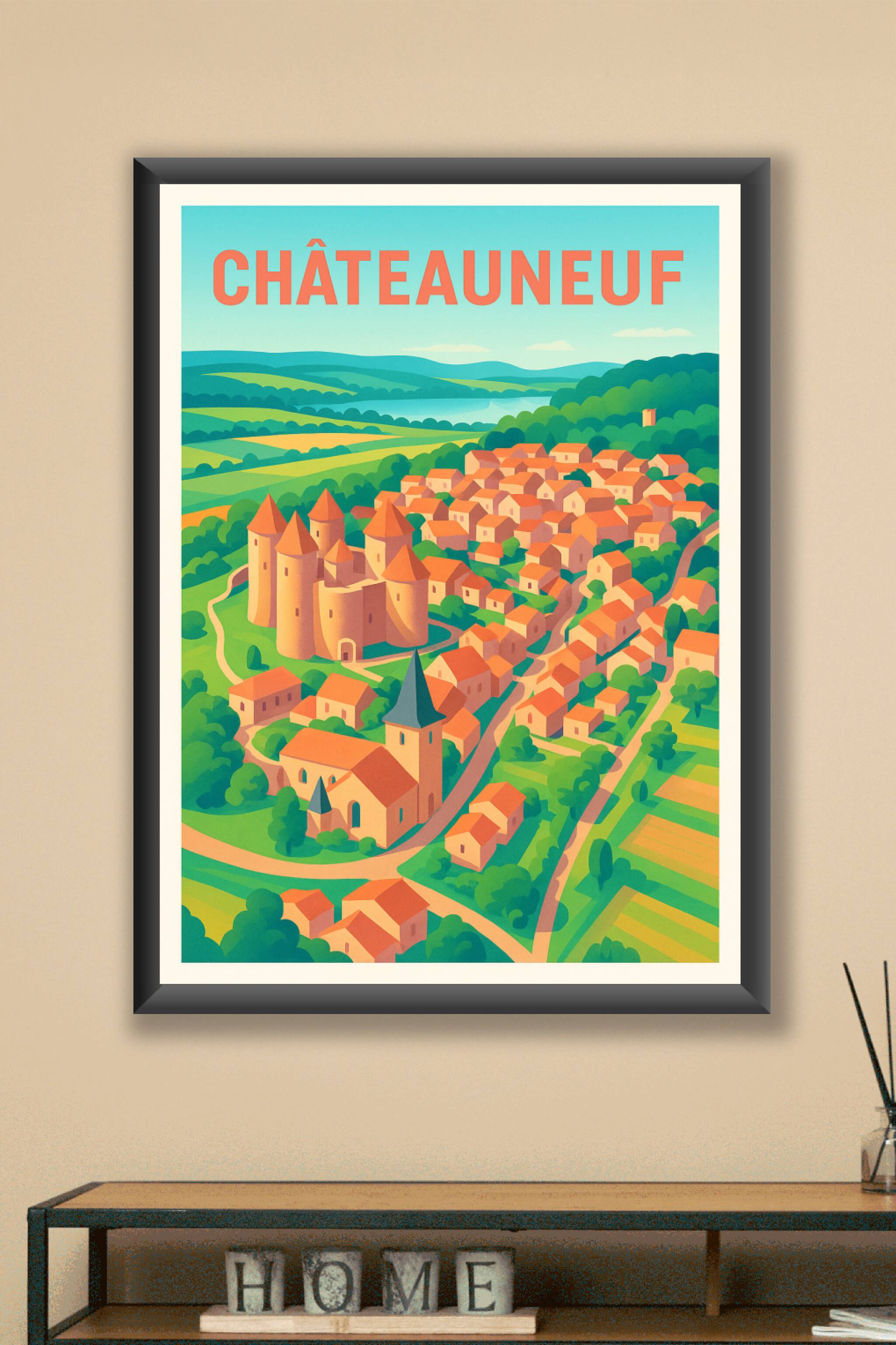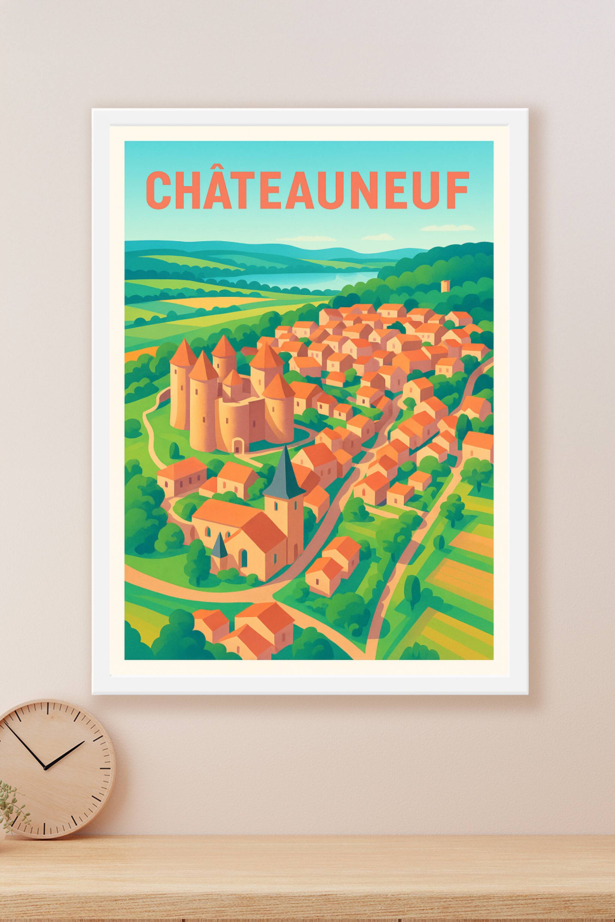 Découvrez le charme intemporel de Châteauneuf à travers cette affiche au style illustratif vibrant et coloré. Ce poster met en scène le village pit...