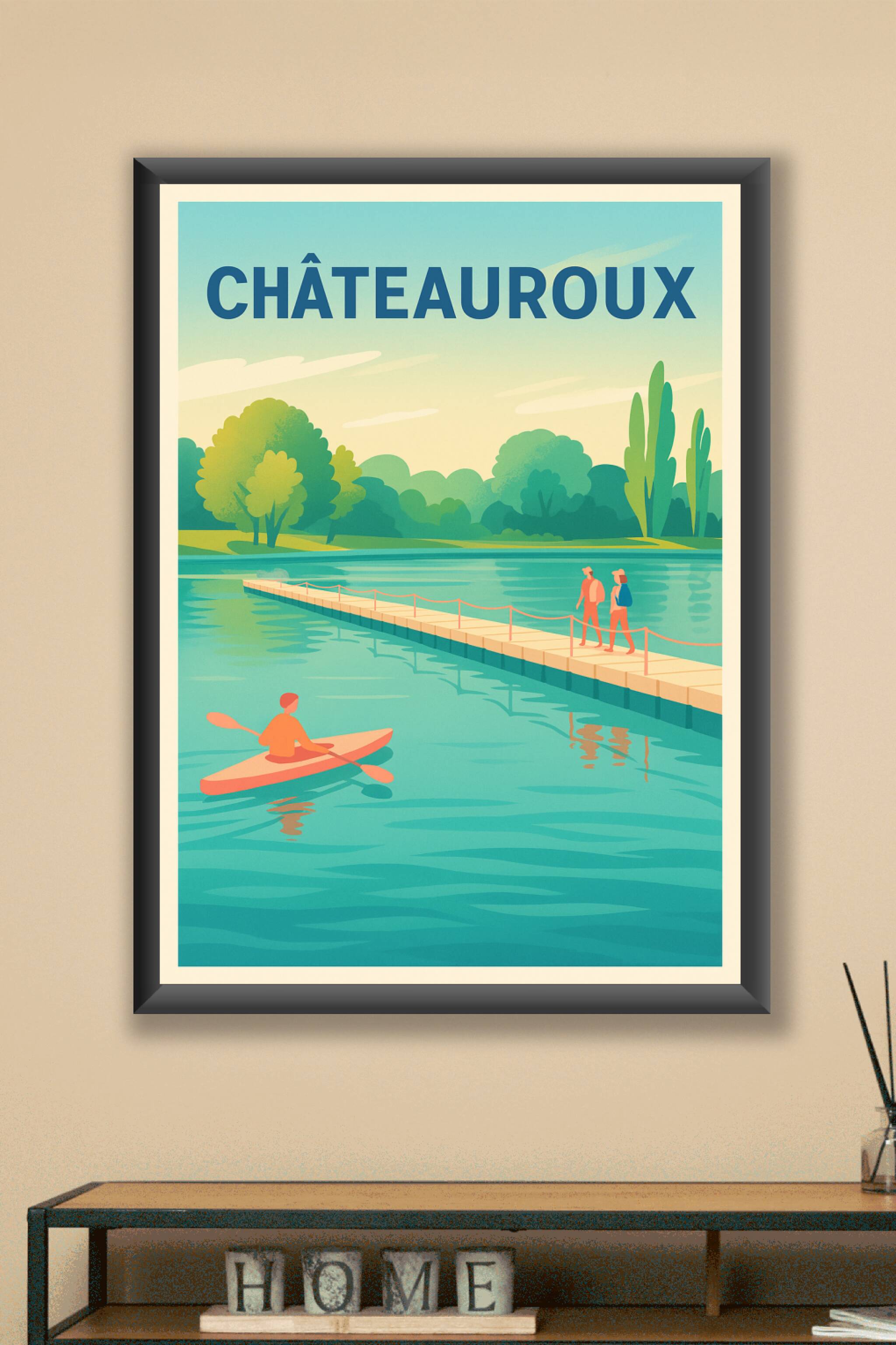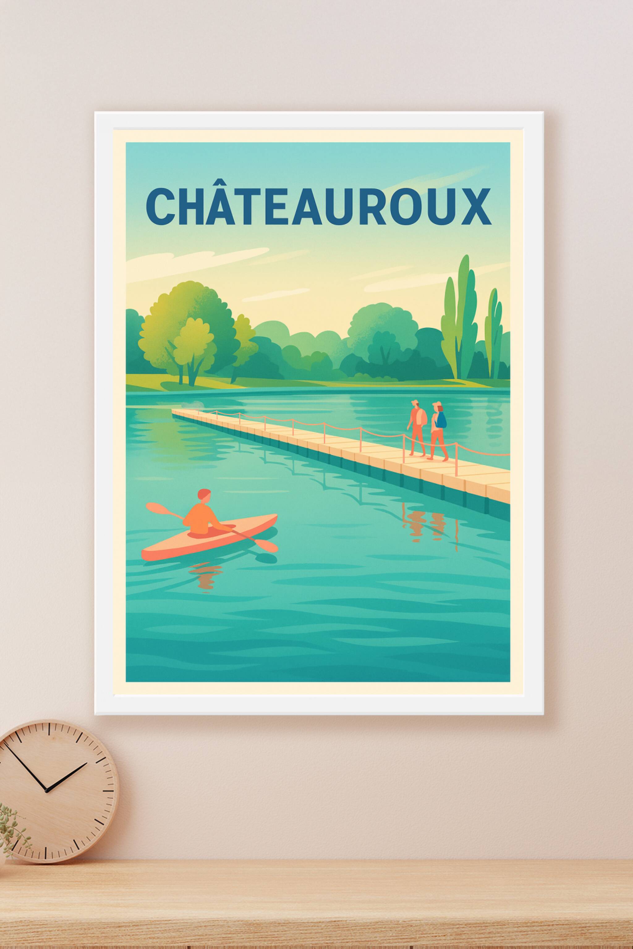 Découvrez la douceur de vivre à Châteauroux avec cette affiche au style vintage, illustrant une scène paisible au bord de l'eau entre marcheurs et ...