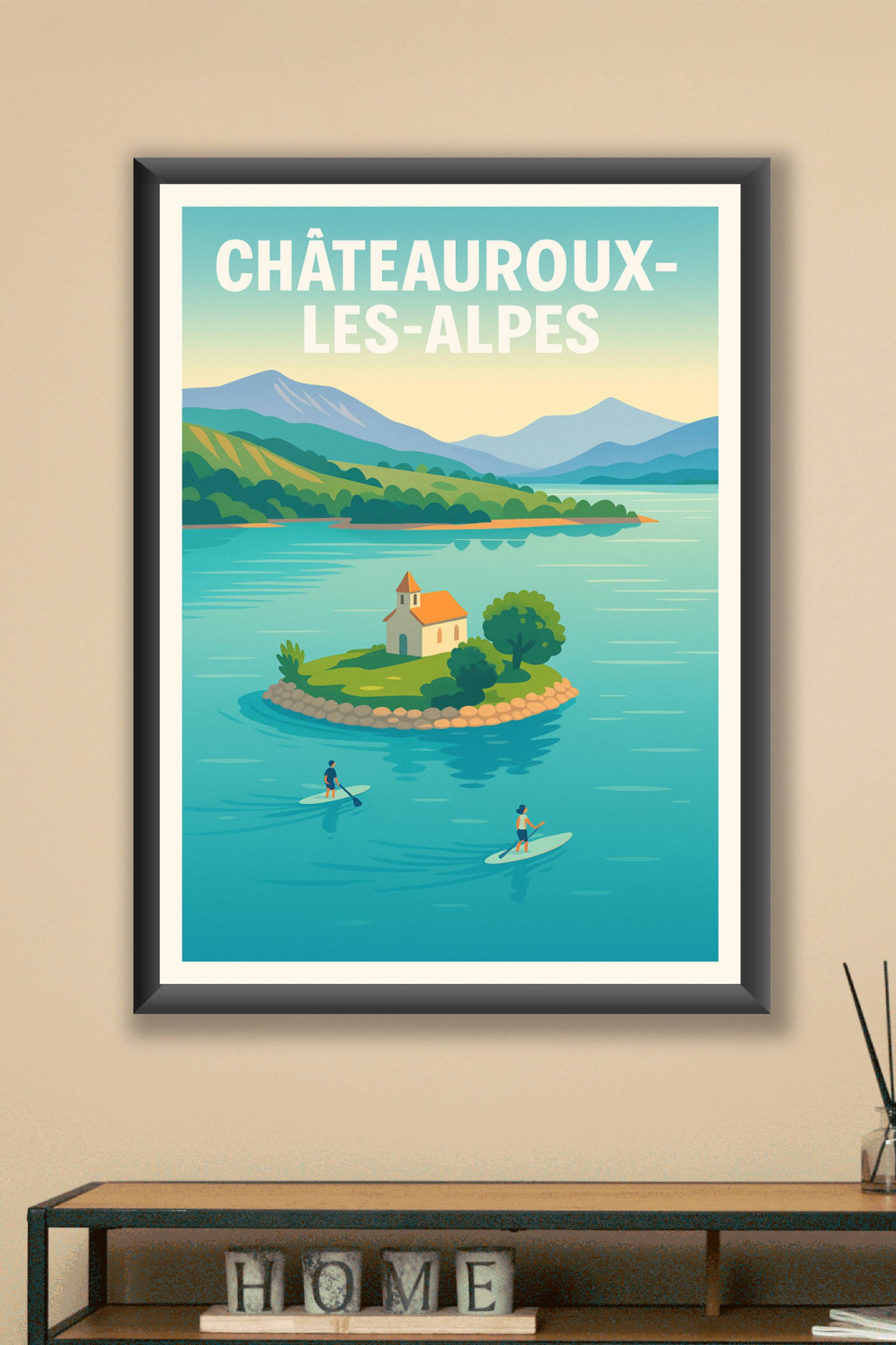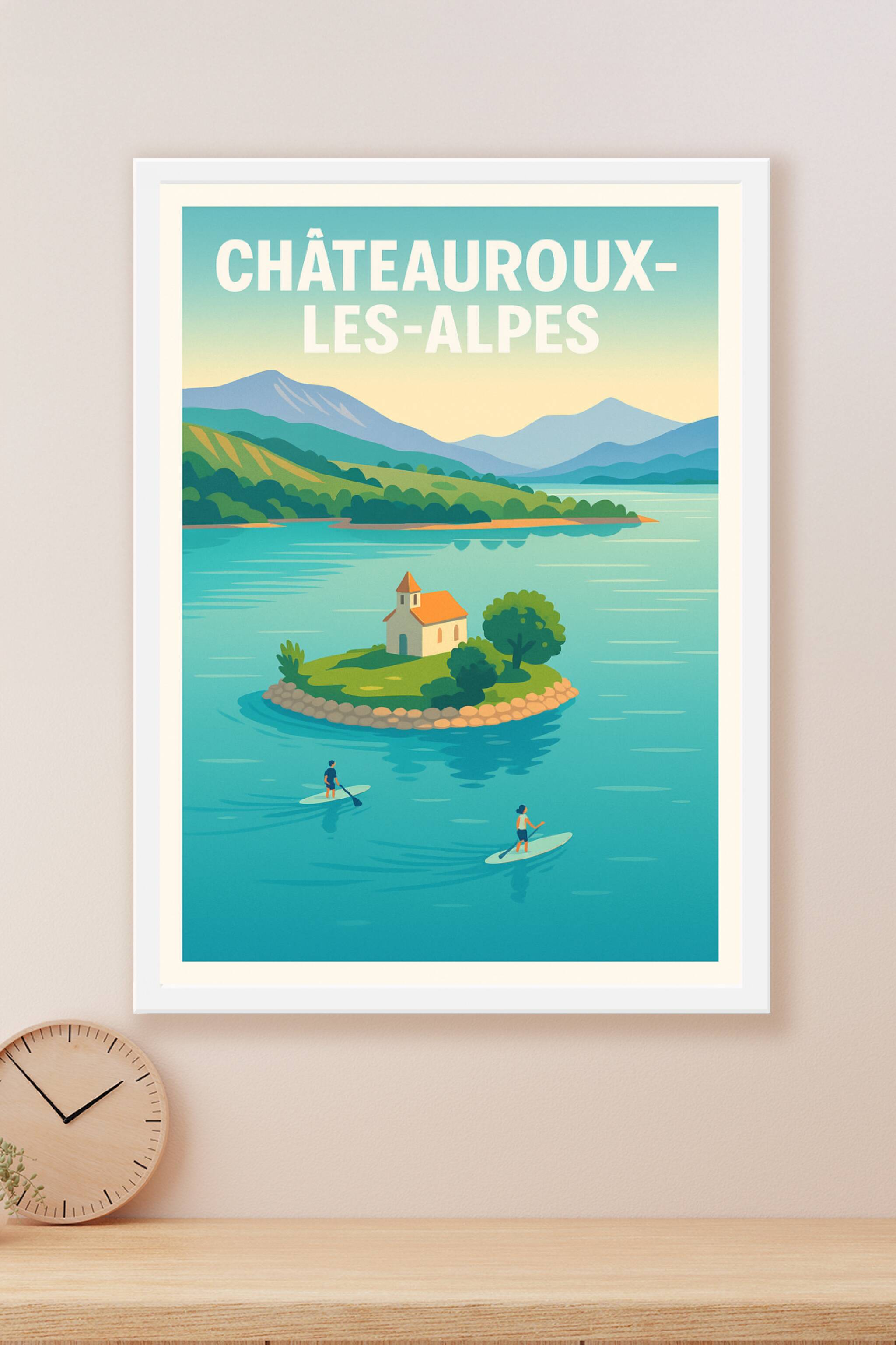 Découvrez la sérénité et la beauté naturelle de Châteauroux-les-Alpes avec cette affiche au style épuré et vintage qui met en scène ses paysages lacustres et montagneux. Cette scène paisible, où deux pagayeurs glissent sur l'eau turquoise autour d'une petite île avec une chapelle, invite à la détente et au rêve. Imprimé en tirage "Fine Art" sur un papier 305g coton d'exception, ce poster garantit une qualité d'image remarquable et des couleurs vibrantes. Disponible en formats A1 à A4, avec ou sans cadre, cette affiche apportera une touche d'évasion et de fraîcheur à votre intérieur. Profitez d'une impression premium 100% fabriquée en France pour sublimer votre décoration ou offrir un cadeau souvenir unique.