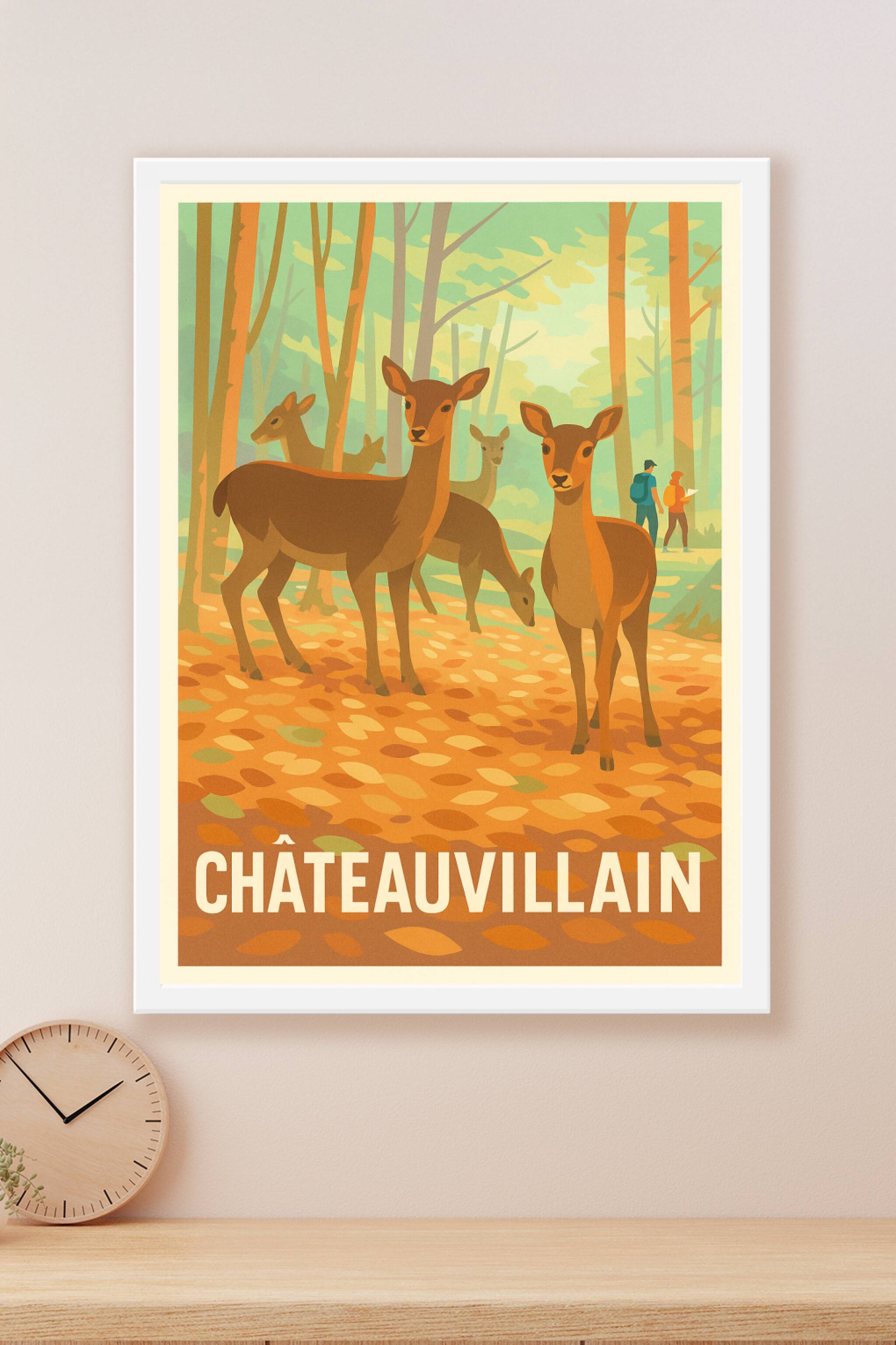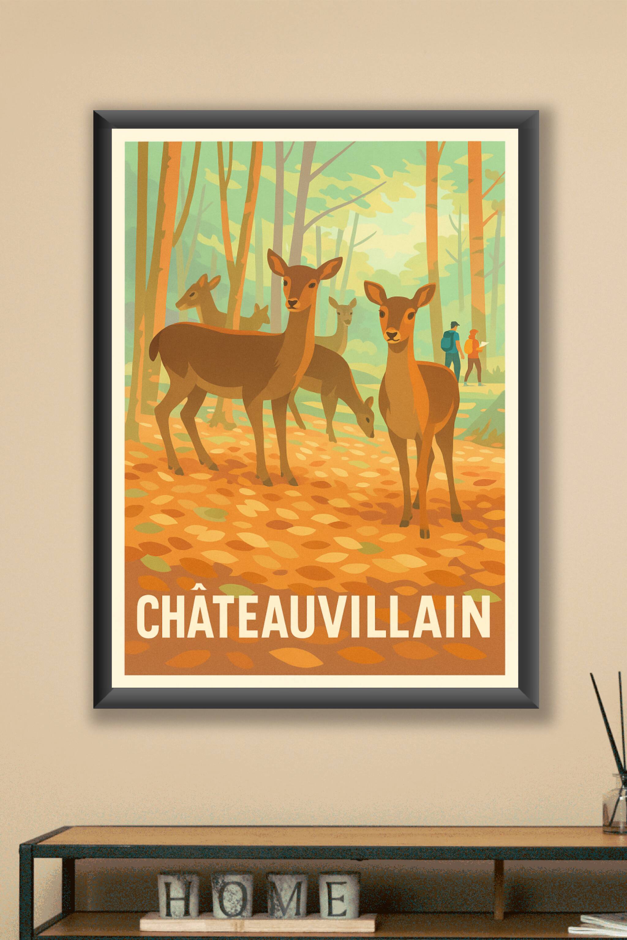 Découvrez la beauté sauvage de Châteauvillain avec cette affiche illustrée qui capture une scène paisible en forêt, mettant en avant des cerfs grac...