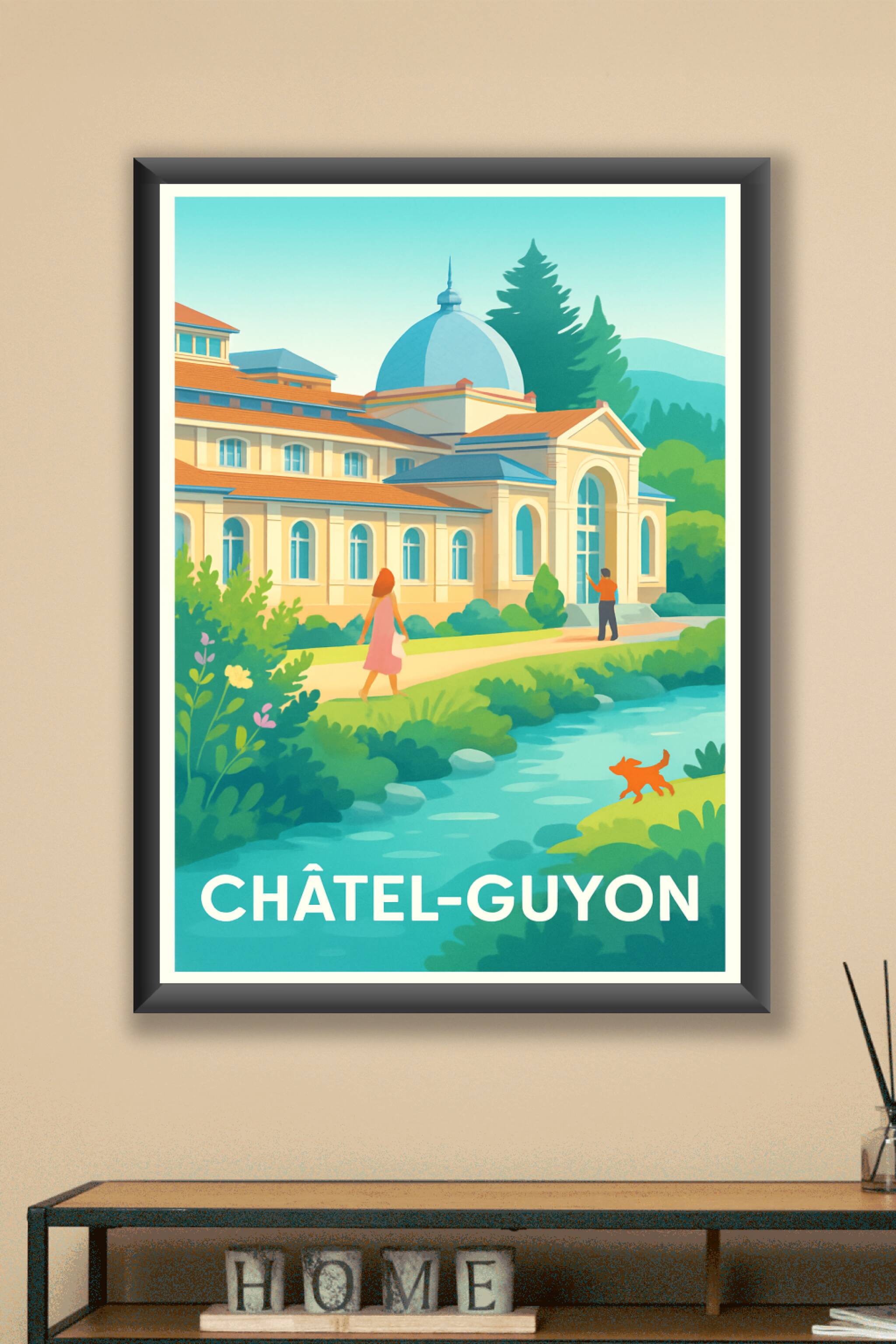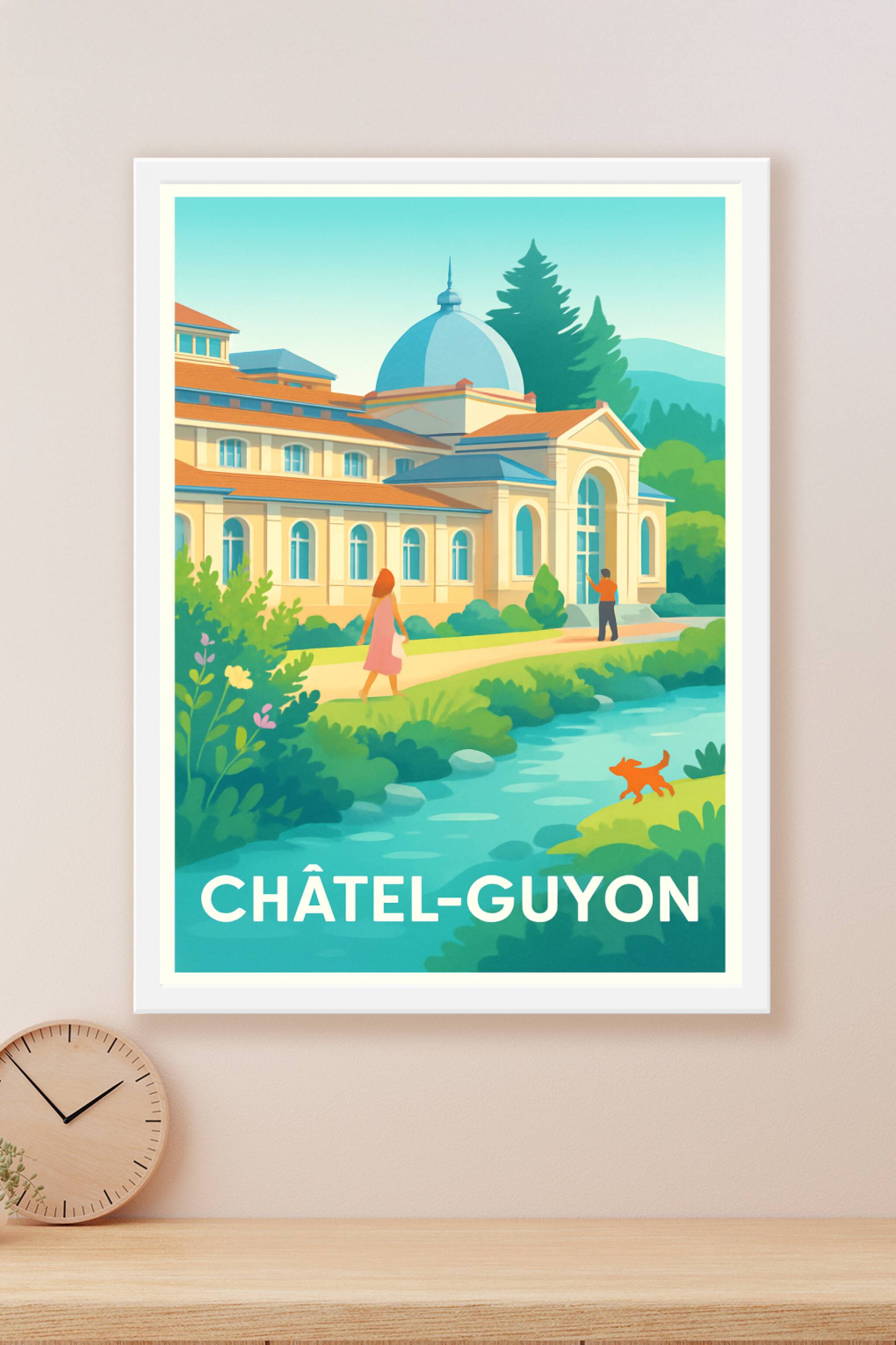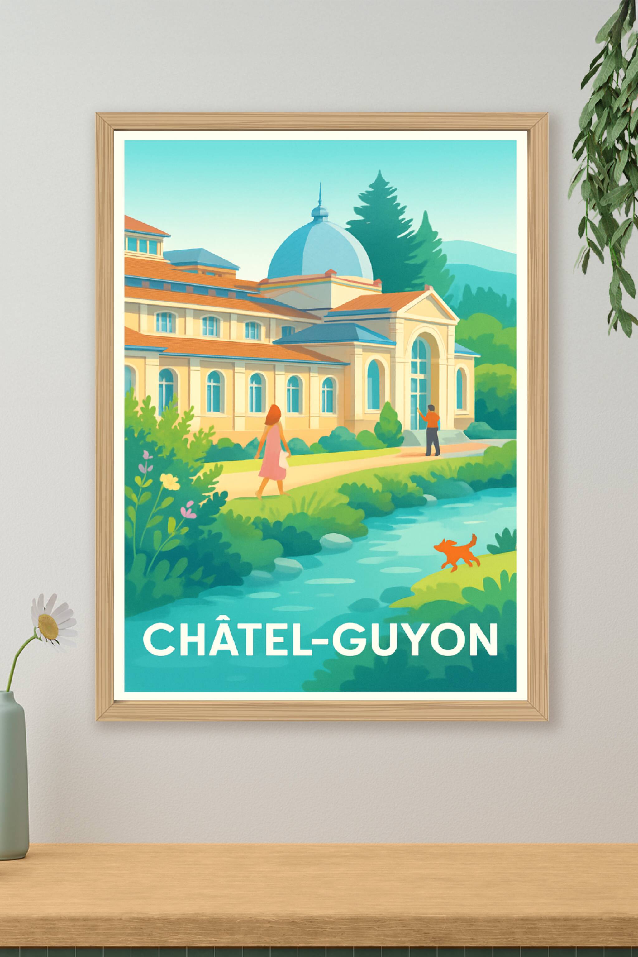 Découvrez la douceur de vivre à Châtel-Guyon avec cette affiche illustrée au style lumineux et apaisant. Ce poster met en valeur un bâtiment emblém...
