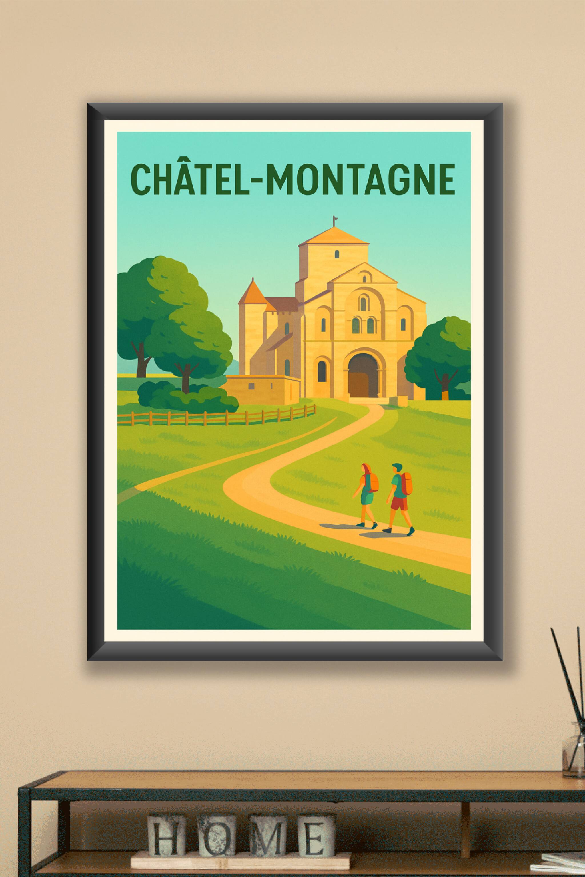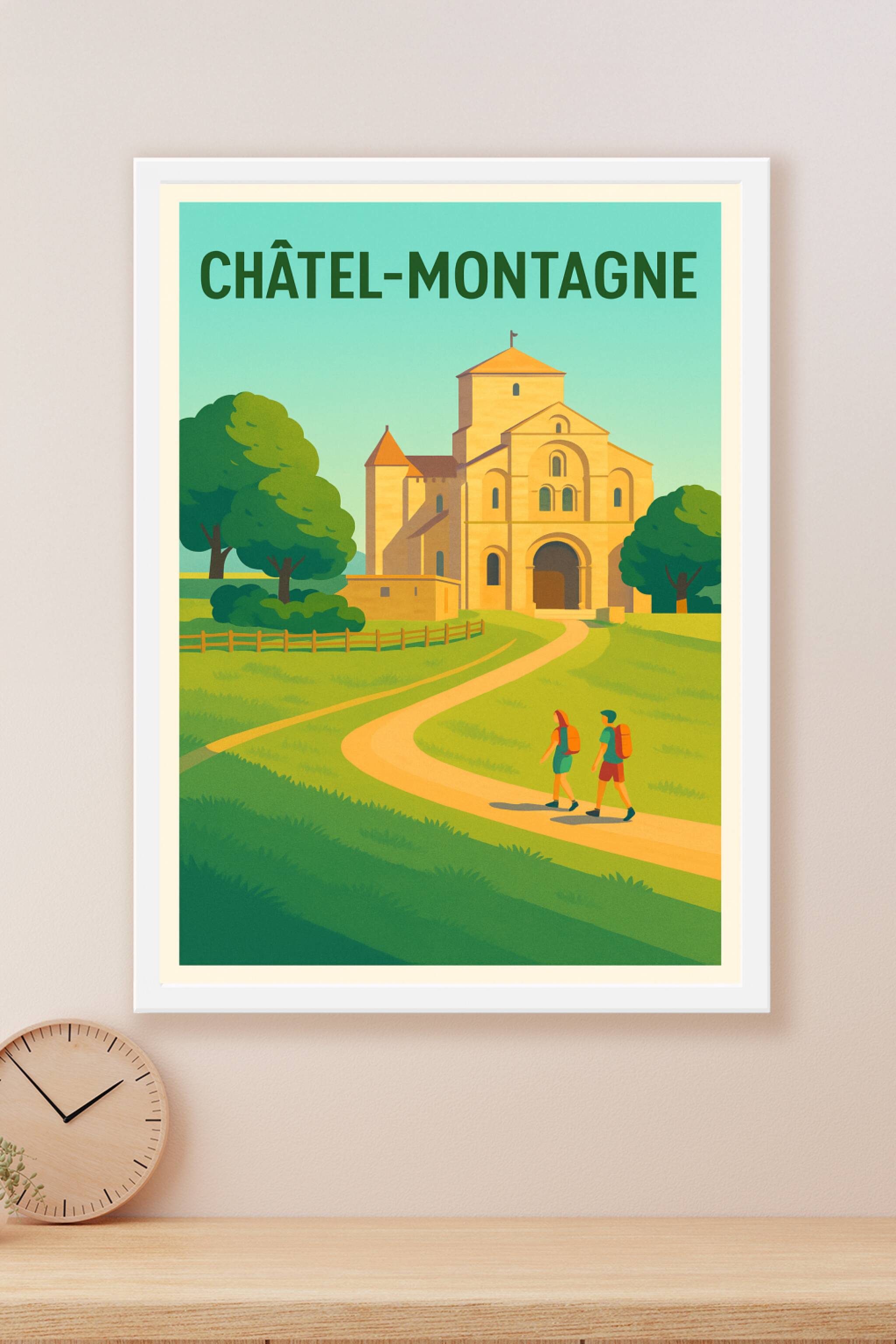 Découvrez la quiétude et la beauté authentique de Châtel-Montagne à travers cette affiche au style vintage et lumineux. Cette représentation picturale met en valeur un monument historique au cœur d'une nature verdoyante, invitant à la promenade et à la découverte. Imprimé en tirage "Fine Art" sur papier 305g coton, ce poster garantit une qualité d'impression exceptionnelle et une grande durabilité. Disponible du format A1 au format A4, avec ou sans cadre, il saura sublimer votre décoration intérieure tout en apportant une touche d'authenticité et de charme régional. Offrez-vous ou offrez à un proche ce poster unique, fabriqué 100% en France, pour capturer l'esprit de la campagne auvergnate.