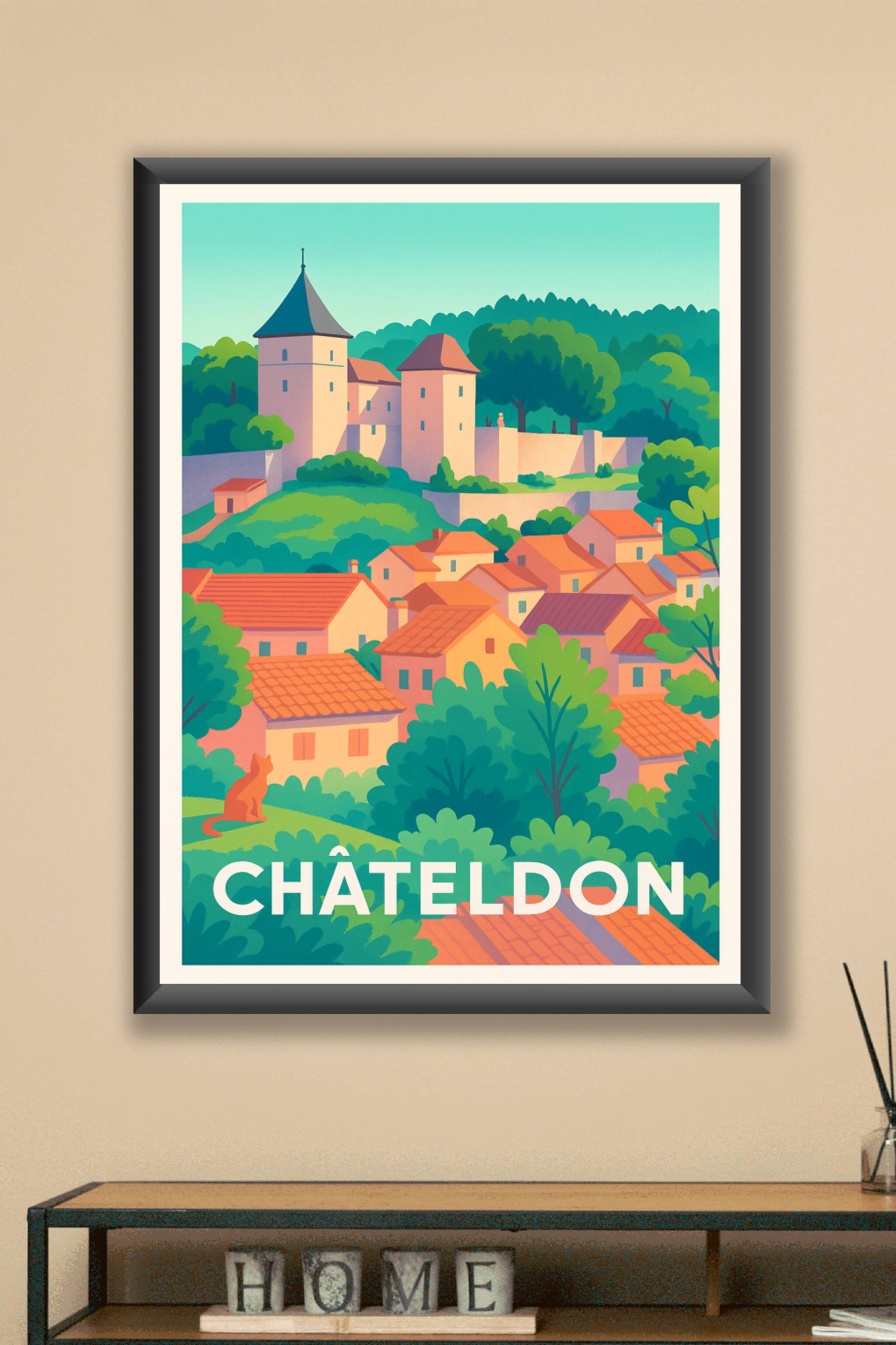 Découvrez l'atmosphère paisible et pittoresque de Châteldon à travers cette affiche illustrée au style coloré et doux. Ce poster met en valeur les ...