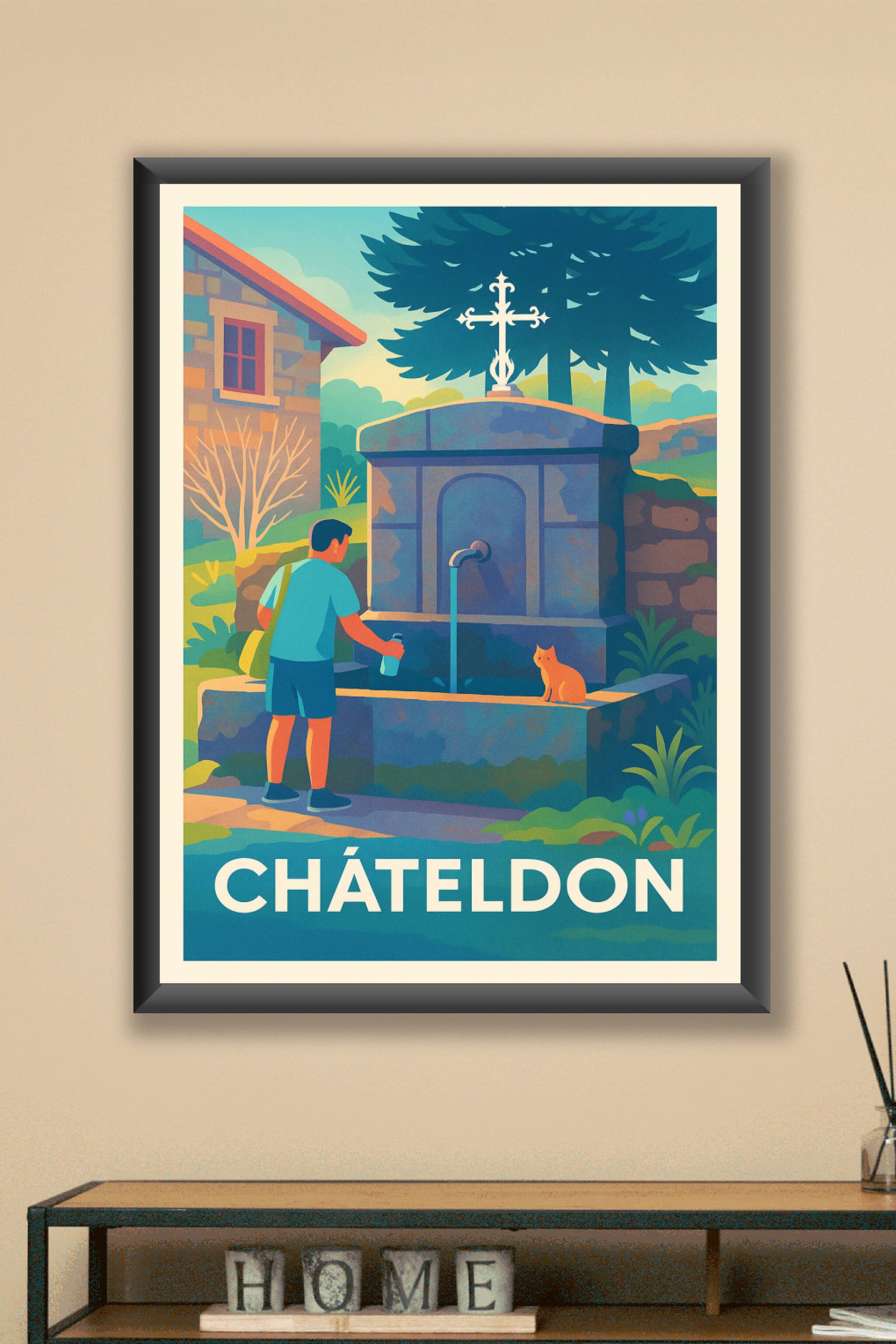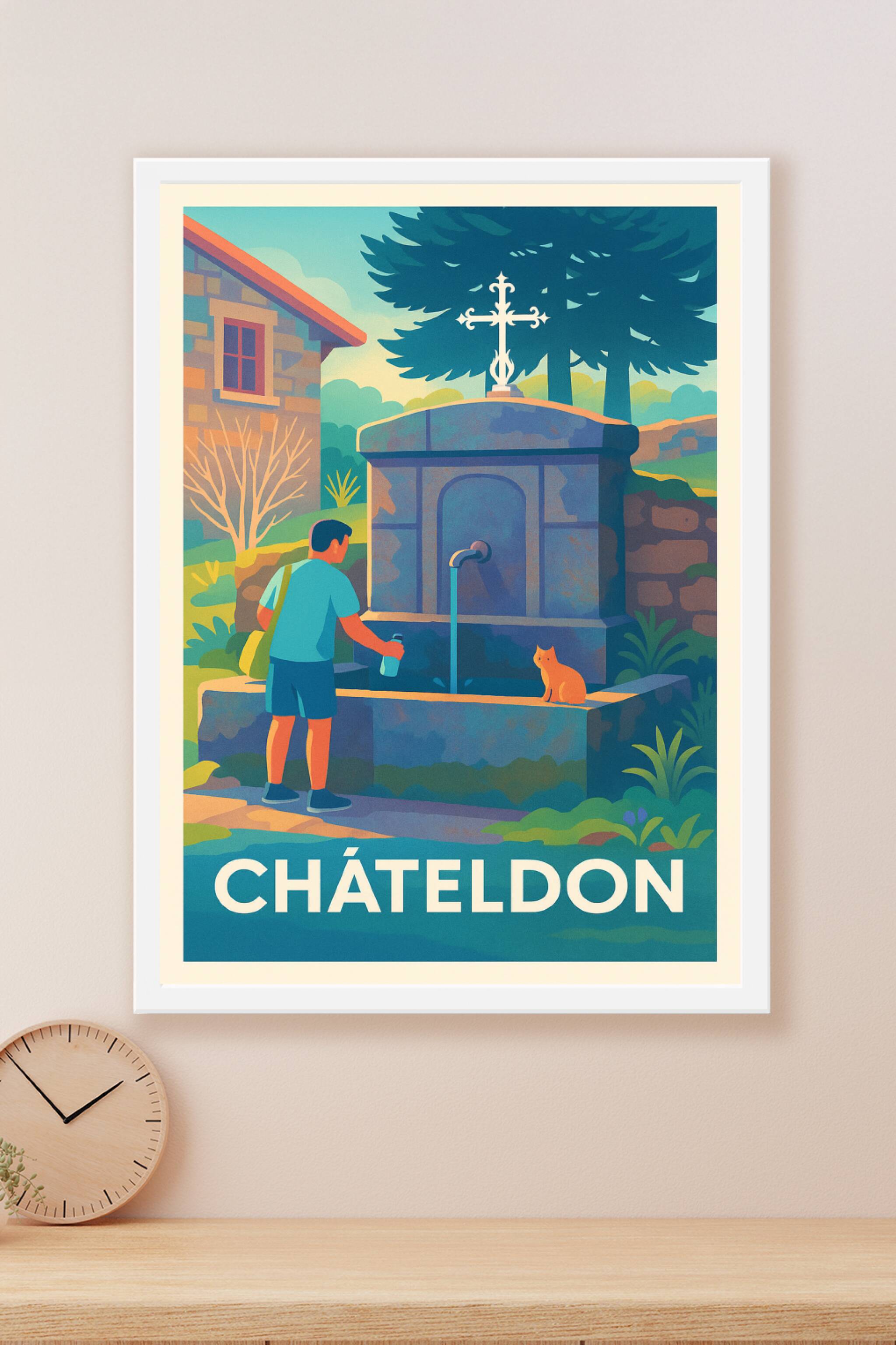 Découvrez la quiétude et le charme intemporel de Châteldon avec cette affiche illustrée mettant en scène une fontaine typique où un promeneur rempl...