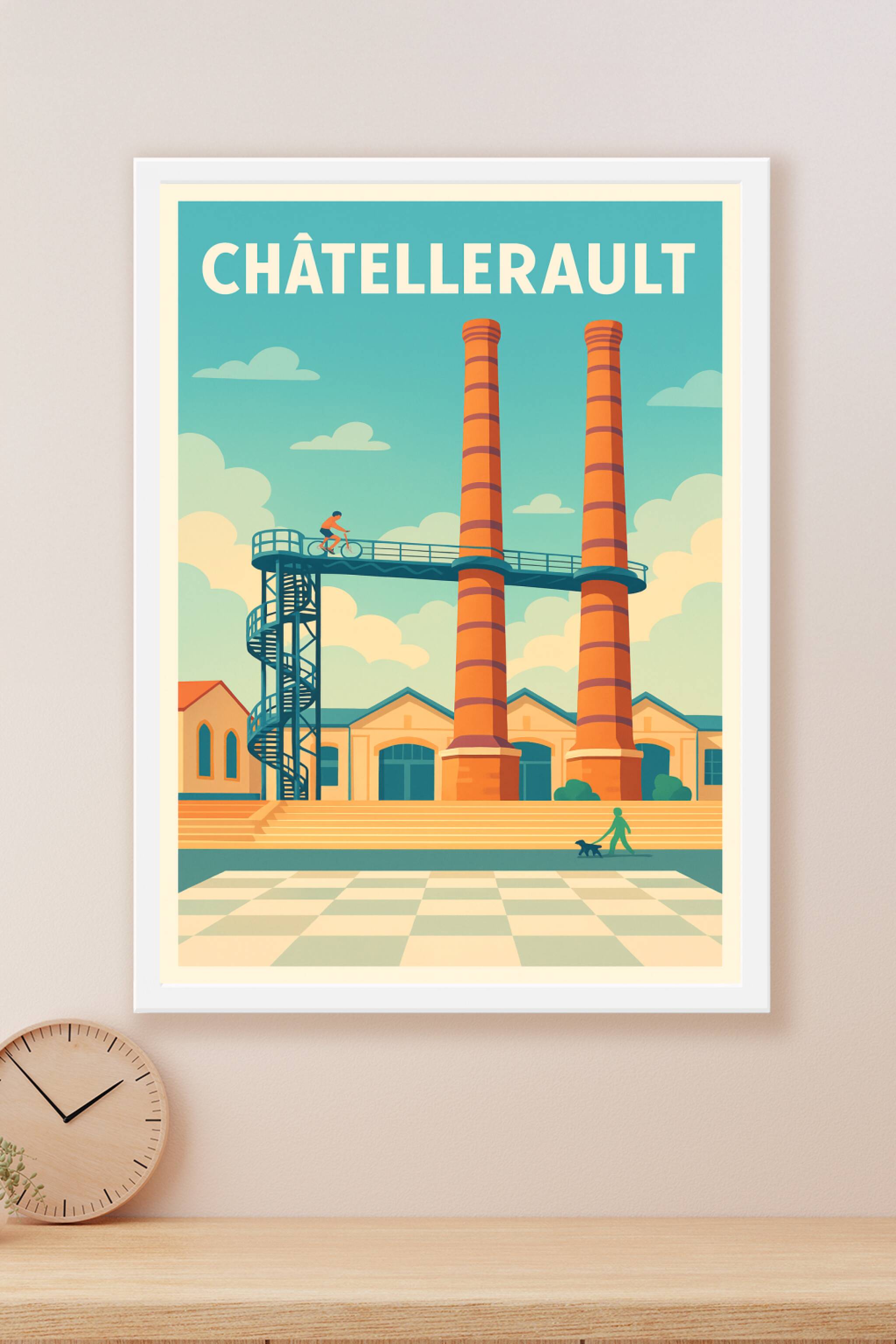 Découvrez l'ambiance unique de Châtellerault à travers cette affiche illustrée mettant en scène ses célèbres cheminées industrielles dans un style ...