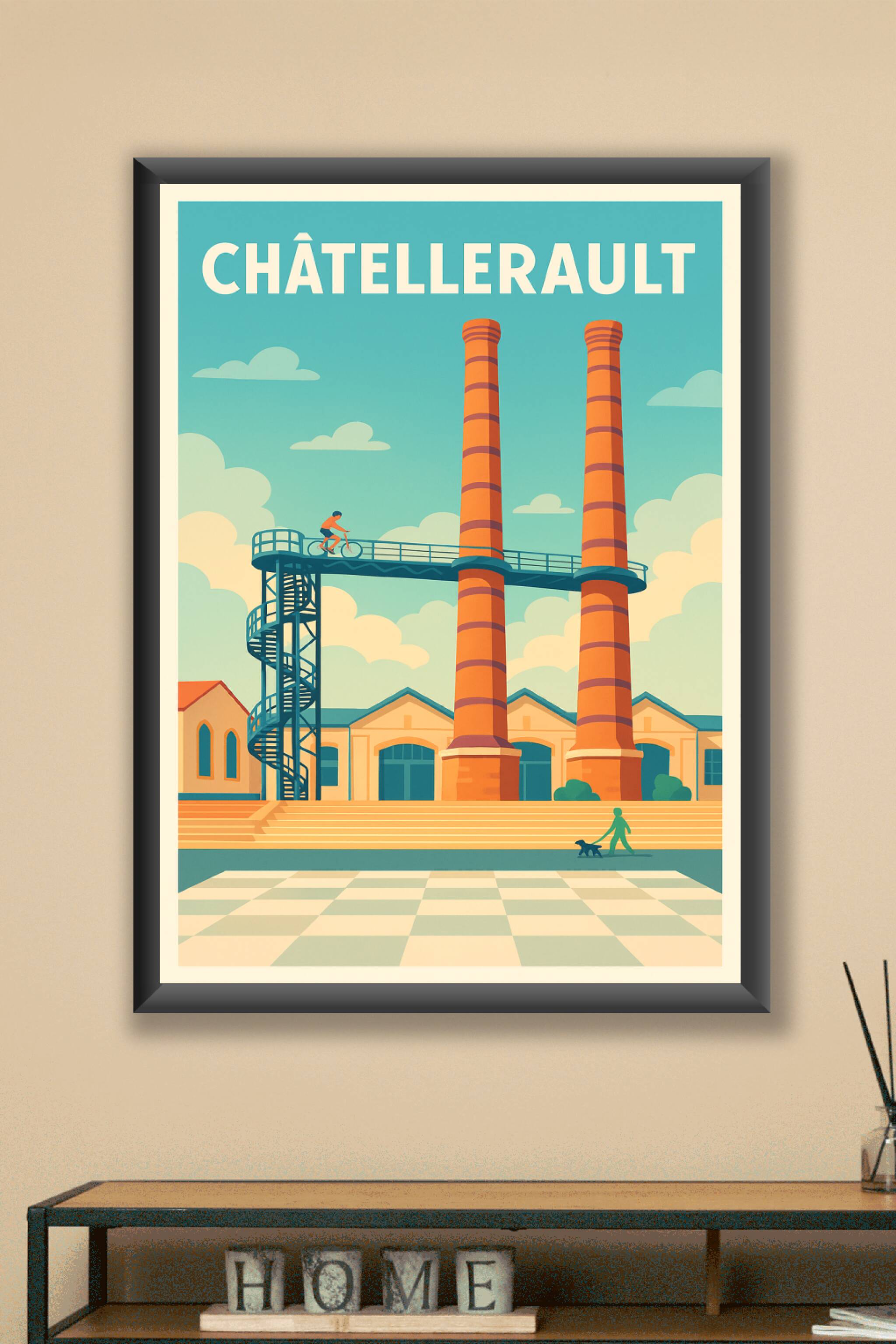 Découvrez l'ambiance unique de Châtellerault à travers cette affiche illustrée mettant en scène ses célèbres cheminées industrielles dans un style lumineux et moderne. Ce poster évoque à la fois l'héritage industriel de la ville et une vie urbaine dynamique, symbolisée par le cycliste et la promenade avec un chien.Cette affiche est disponible en tirage "Fine Art" sur papier 305g coton, offrant une qualité d'impression exceptionnelle et des couleurs vives. Choisissez la dimension qui s'adapte le mieux à votre intérieur, du format A1 au format A4, avec ou sans cadre.Parfait pour sublimer votre décoration ou faire un cadeau raffiné, ce poster allie design contemporain et hommage à Châtellerault, avec une impression 100% fabriquée en France.