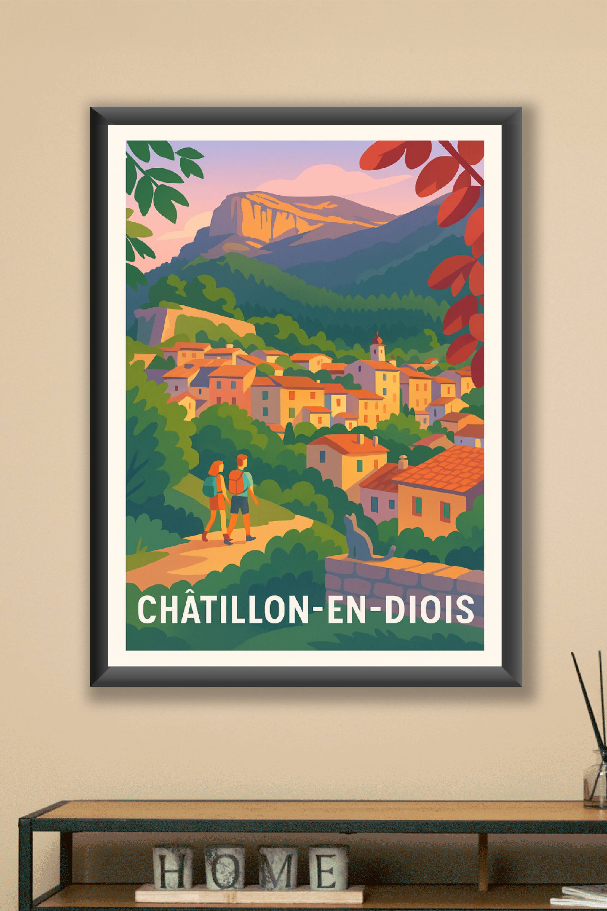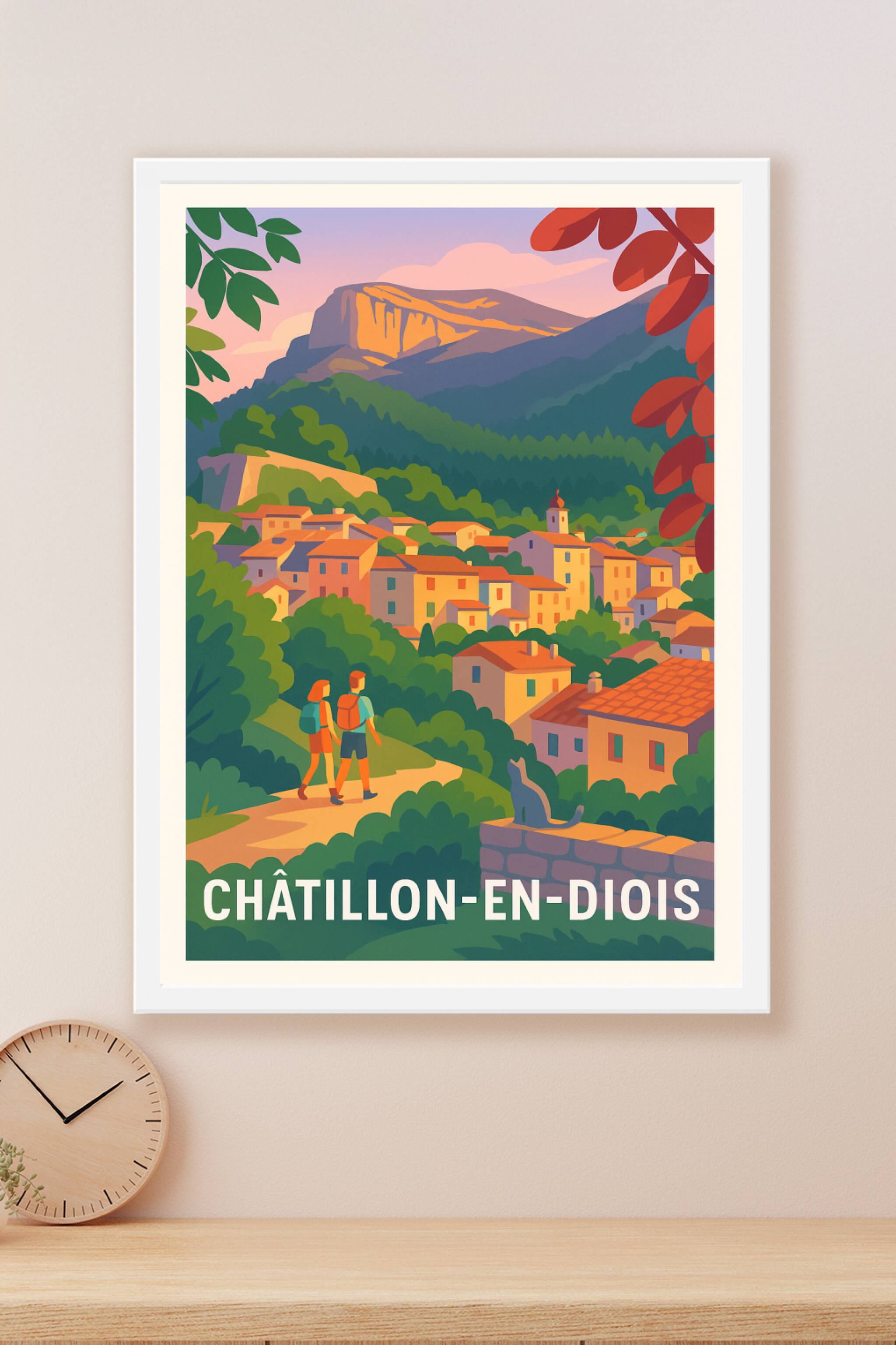 Laissez-vous transporter par cette affiche illustrée représentant le charmant village de Châtillon-en-Diois, niché entre montagnes et verdure, baig...