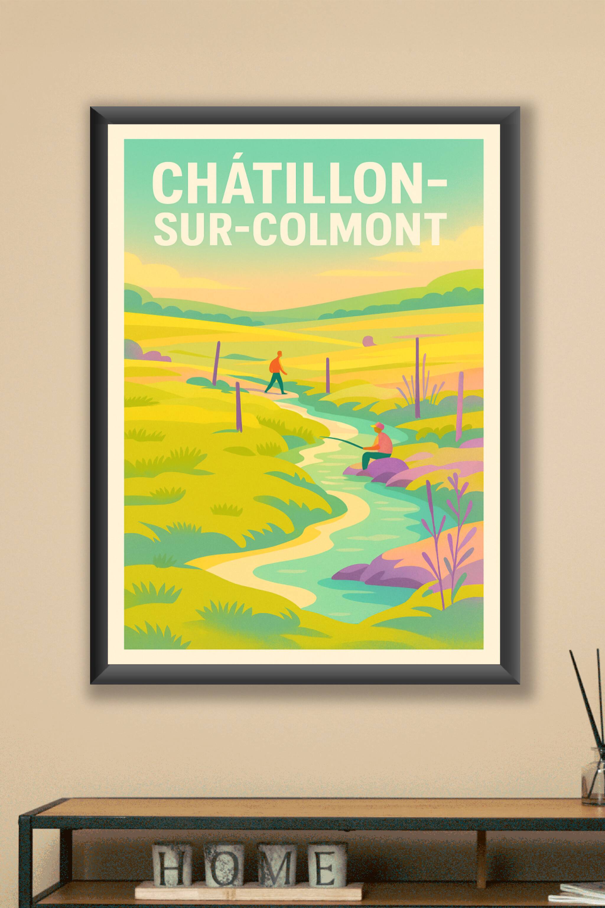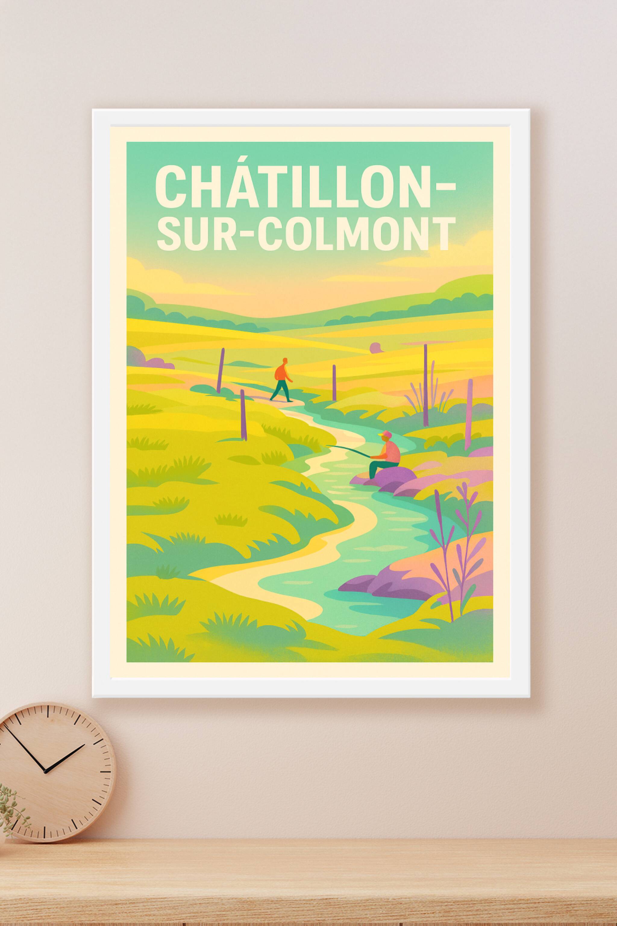 Découvrez la douceur et la sérénité de Châtillon-sur-Colmont avec cette affiche illustrée mettant en scène un paysage champêtre où coule une rivière paisible. Un promeneur et un pêcheur viennent animer cette scène bucolique baignée de couleurs douces et apaisantes. Ce poster est imprimé en tirage "Fine Art" sur un papier 305g coton de haute qualité, garantissant des couleurs éclatantes et une durabilité exceptionnelle. Disponible en formats A1 à A4, avec ou sans cadre, cette affiche apportera une touche de calme et de nature à votre intérieur. Profitez d'une impression premium 100% fabriquée en France pour offrir ou décorer avec raffinement un espace de vie ou de travail.