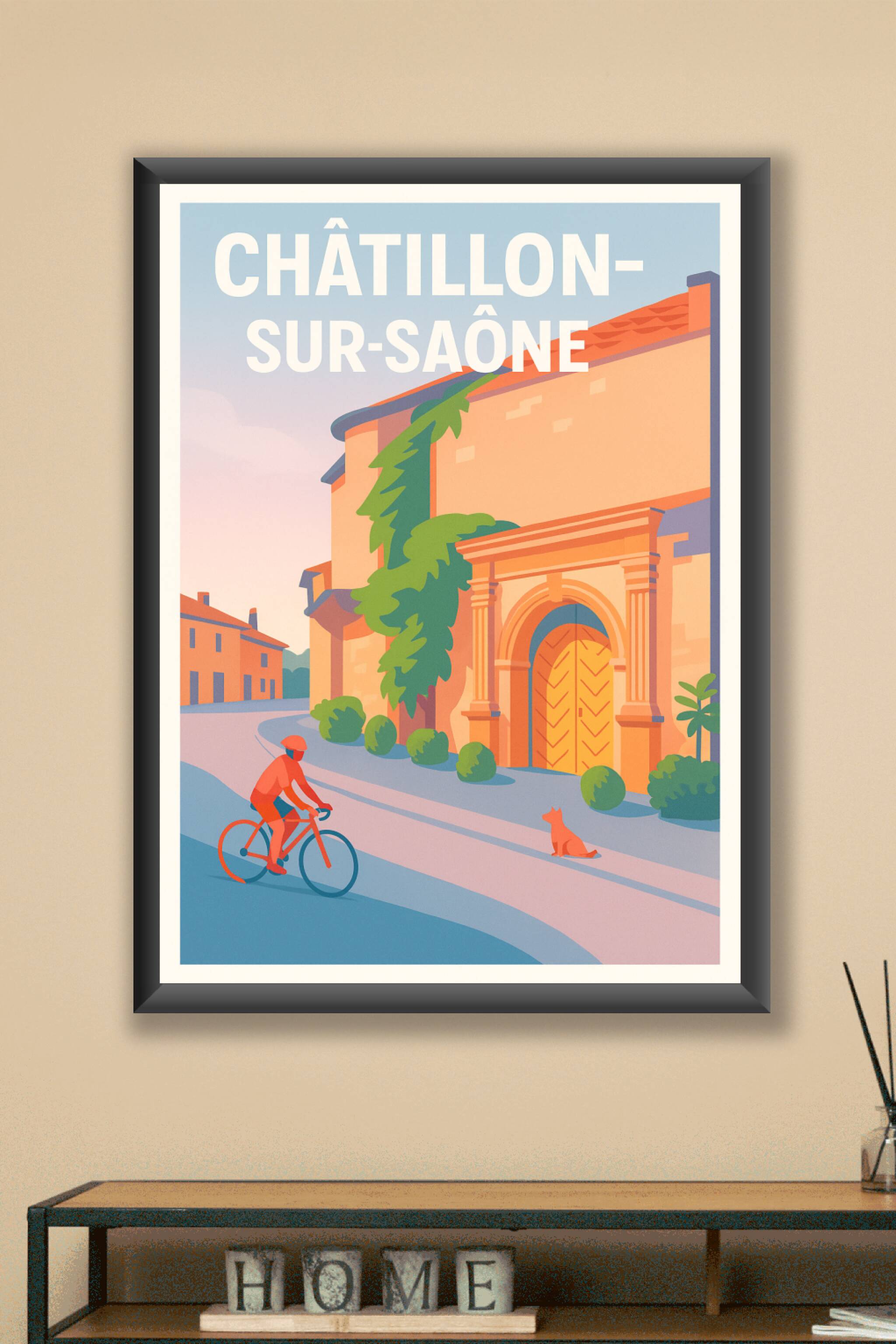 Découvrez l'élégance paisible de Châtillon-sur-Saône à travers ce poster illustré mettant en scène un cycliste traversant les ruelles baignées d'un...