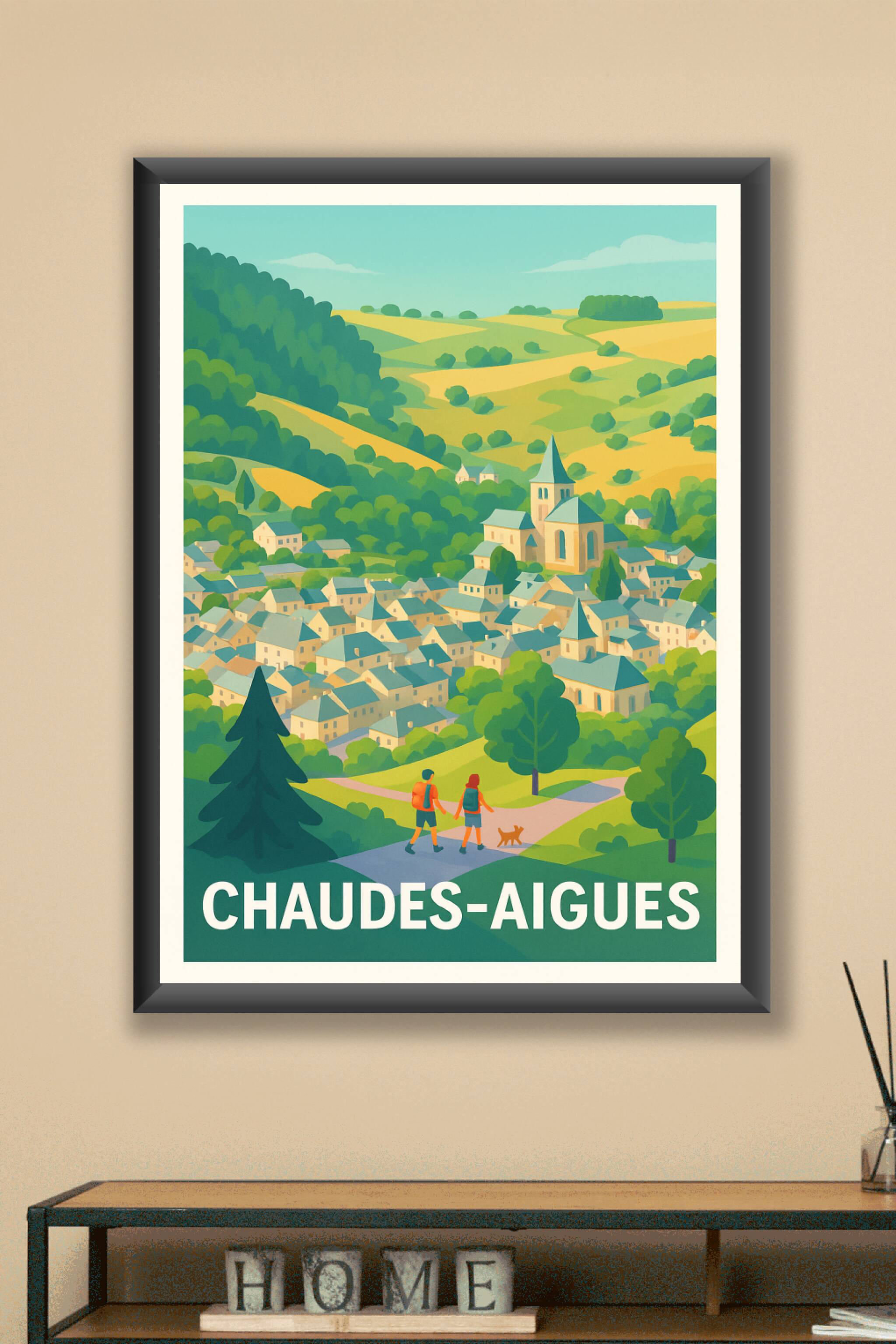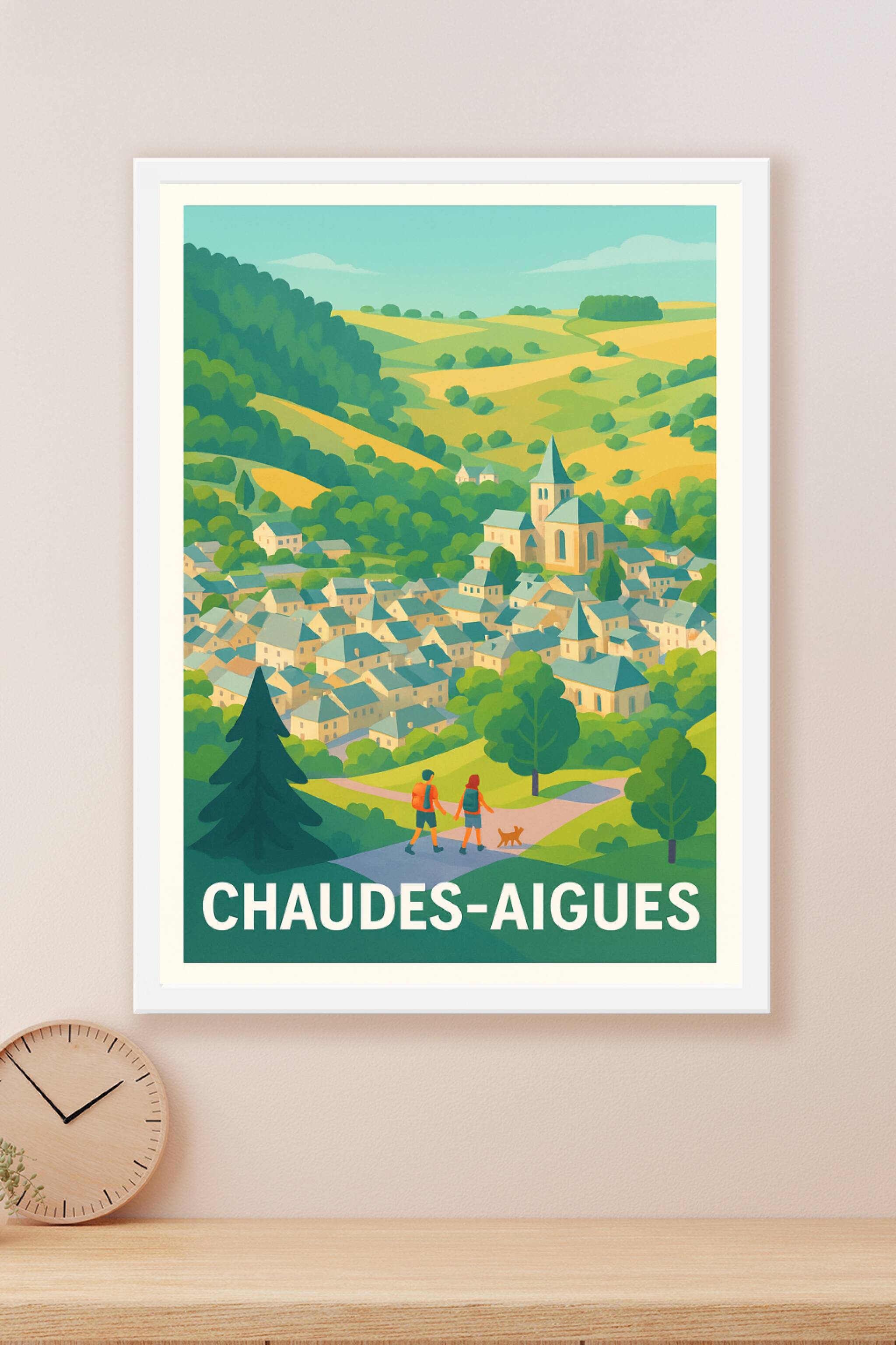 Découvrez la douceur de vivre de Chaudes-Aigues avec cette affiche au style illustratif lumineux, qui révèle le charme authentique de ce village pi...