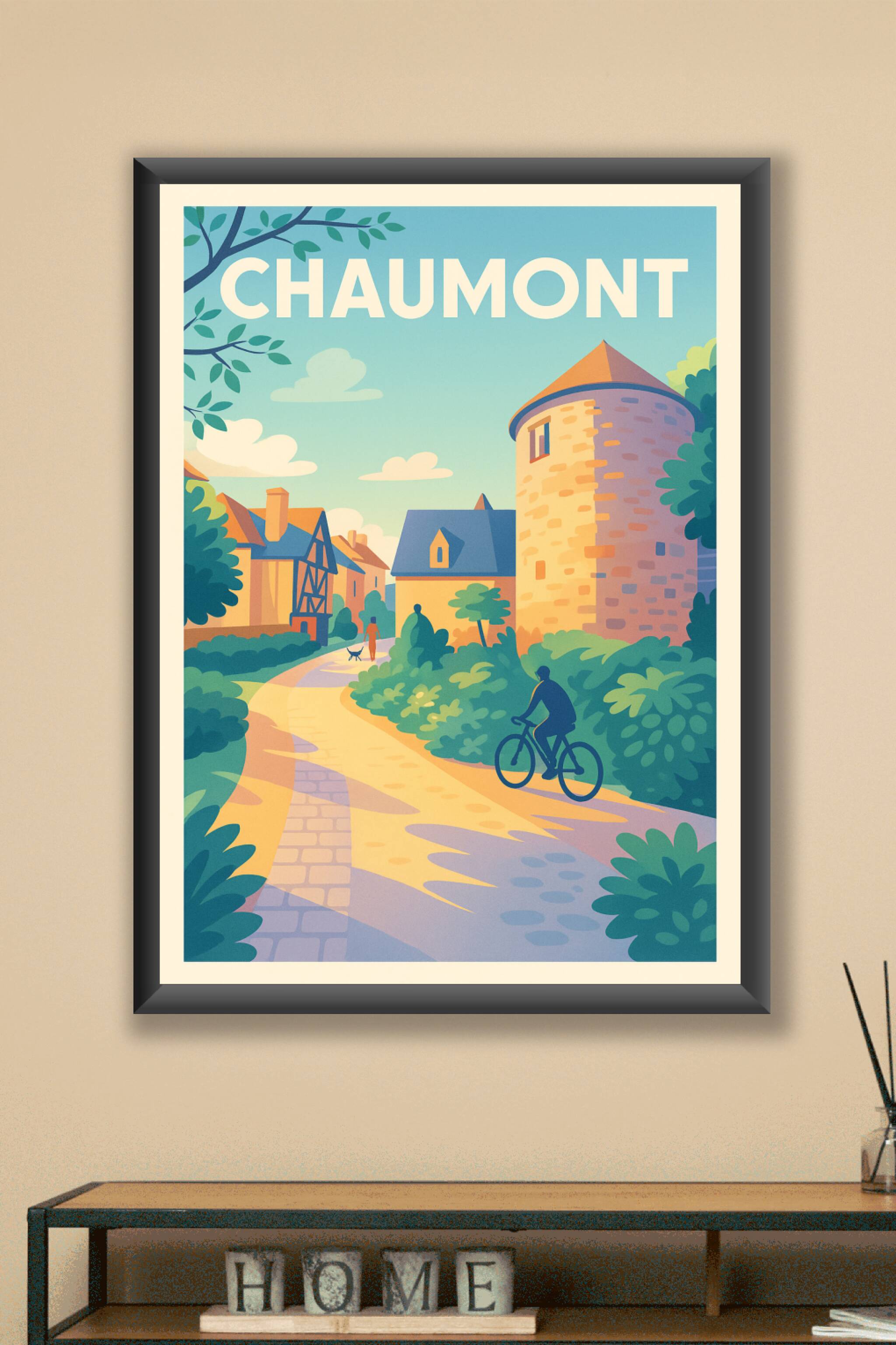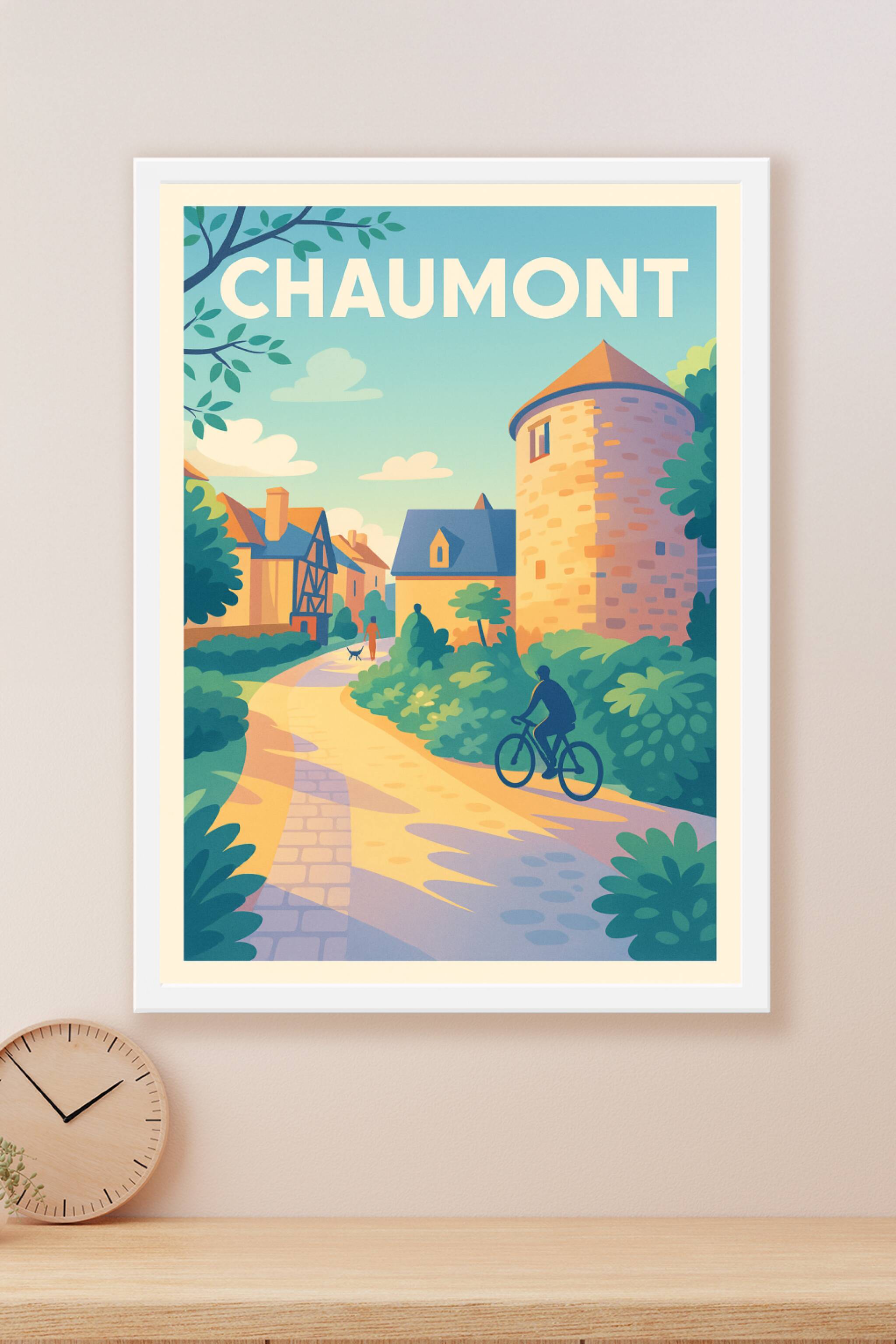 Découvrez le charme authentique de Chaumont avec cette affiche illustrée au style doux et lumineux. Ce poster met en scène une promenade paisible e...