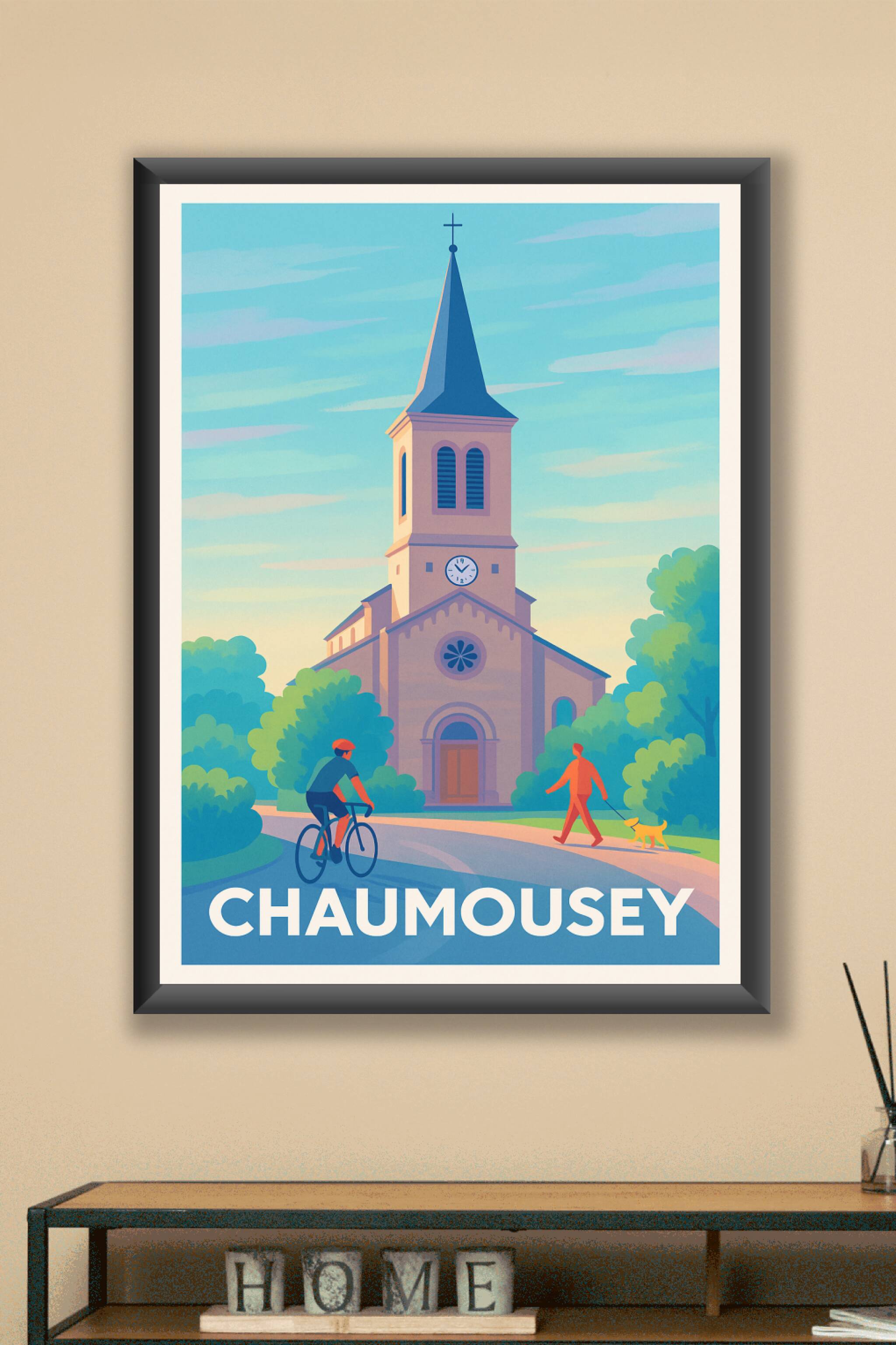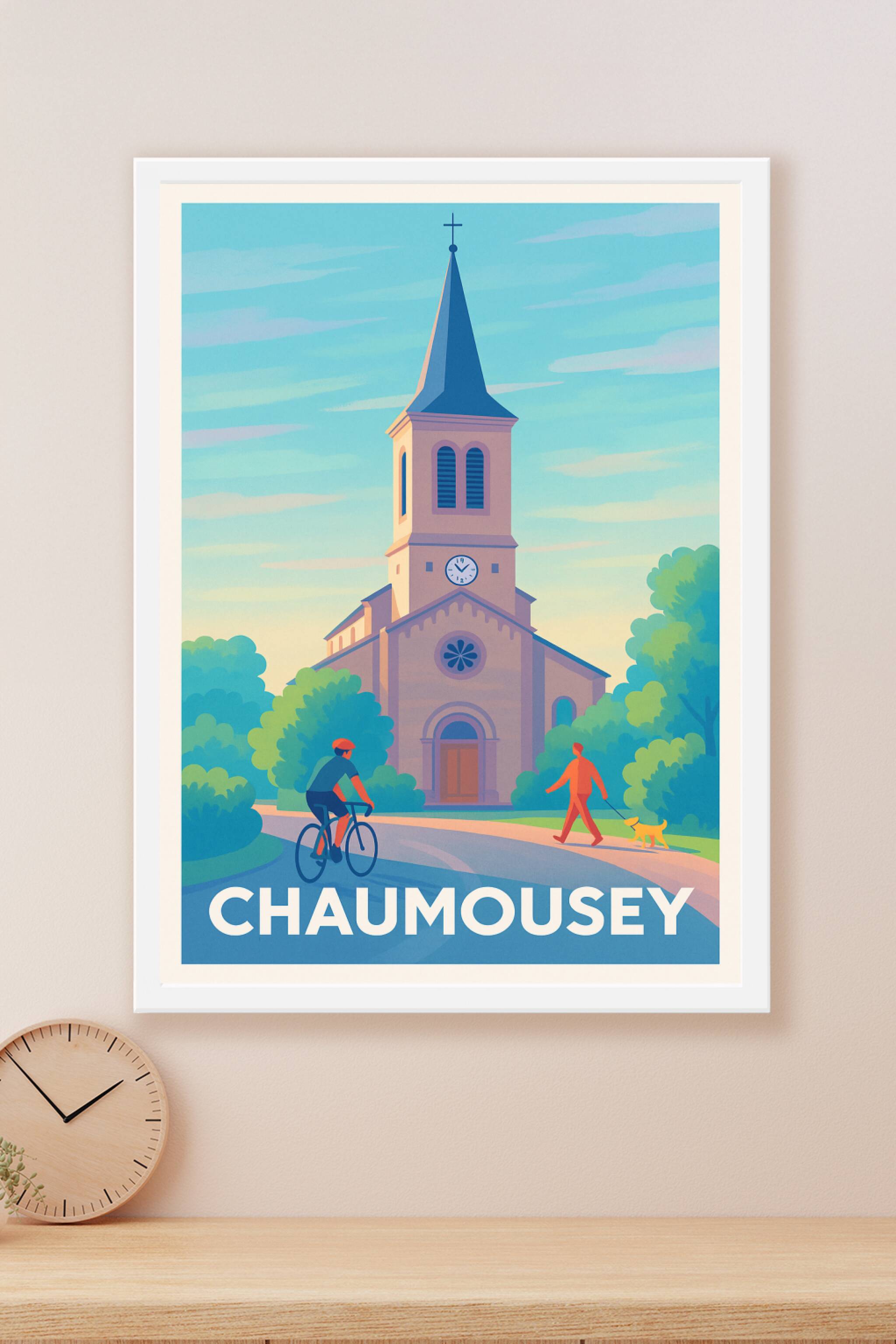 Découvrez le charme tranquille de Chaumousey avec cette affiche illustrée qui capture l'essence d'un village paisible, rythmé par la flèche embléma...