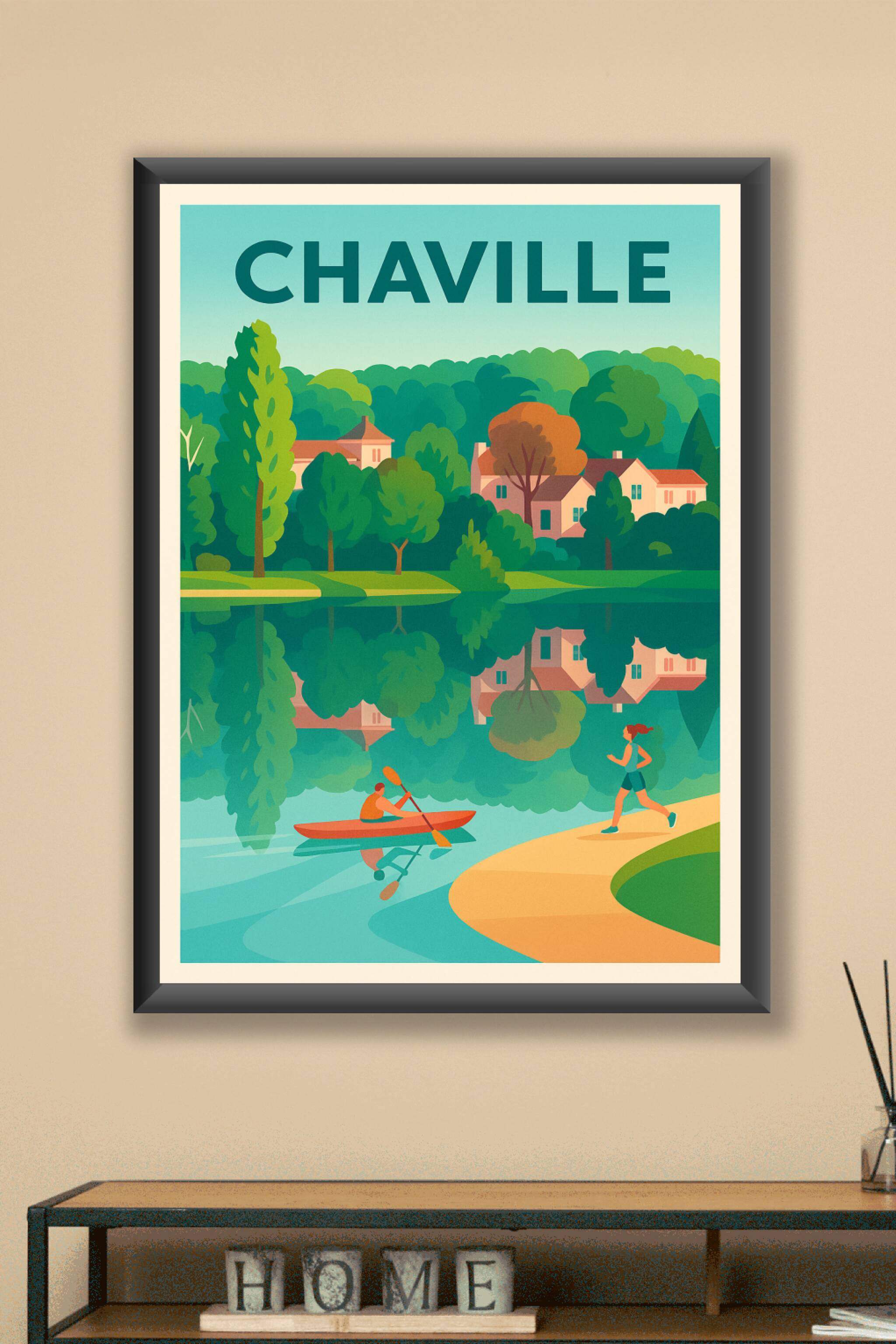 Découvrez l'atmosphère paisible de Chaville avec cette affiche illustrée qui met en scène un paysage verdoyant et un lac calme où se mêlent promenade et kayak. Cette image capture l'équilibre parfait entre nature et vie citadine, idéale pour apporter une touche de fraîcheur à votre décoration intérieure. Ce poster est imprimé en tirage "Fine Art" sur un papier 305g coton, garantissant une qualité d'impression exceptionnelle et une durabilité remarquable. Disponible en formats A1 à A4, avec ou sans cadre, il s'adapte parfaitement à tous les espaces. Profitez de cette création imprimée en France pour embellir votre maison ou offrir un souvenir unique de Chaville.