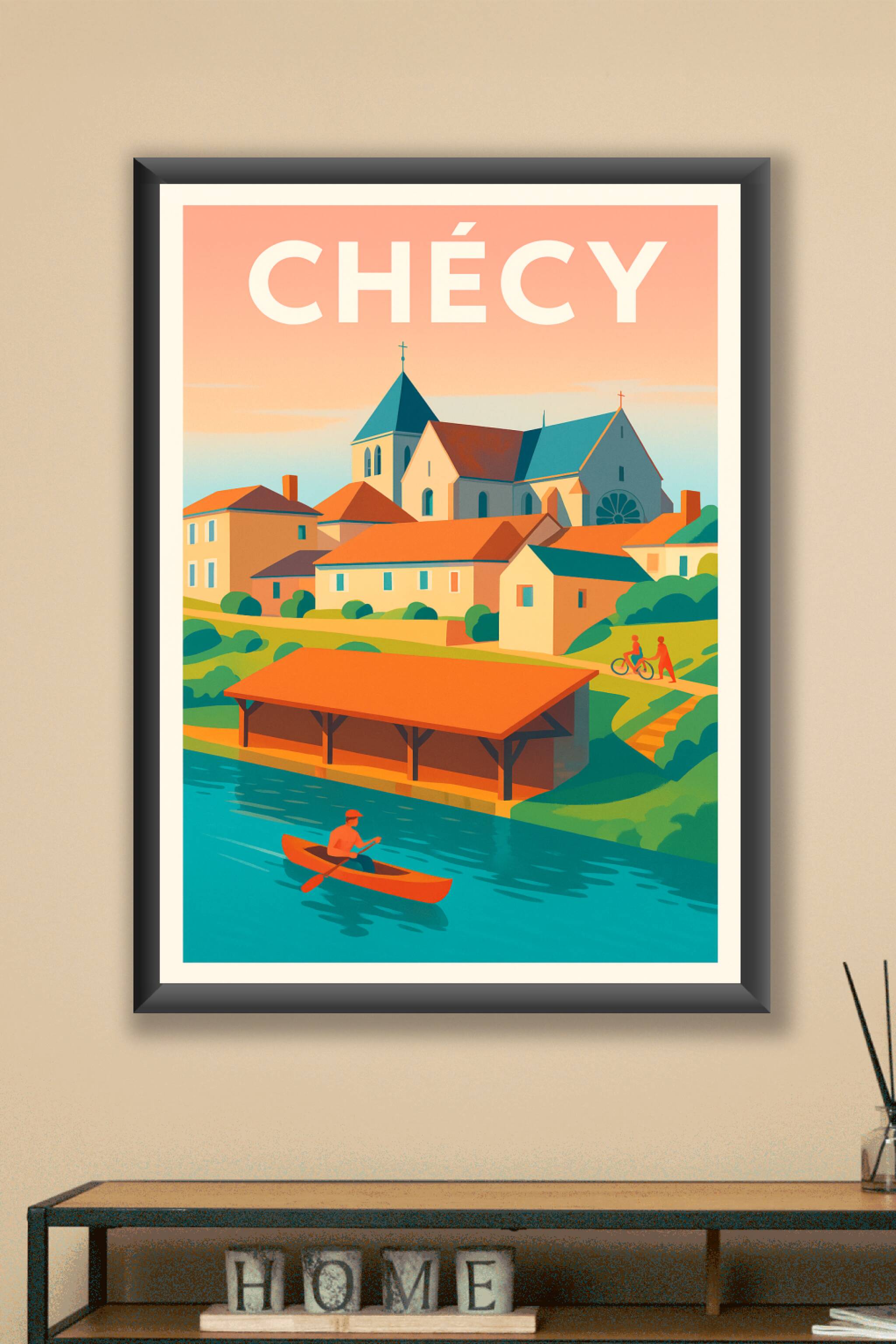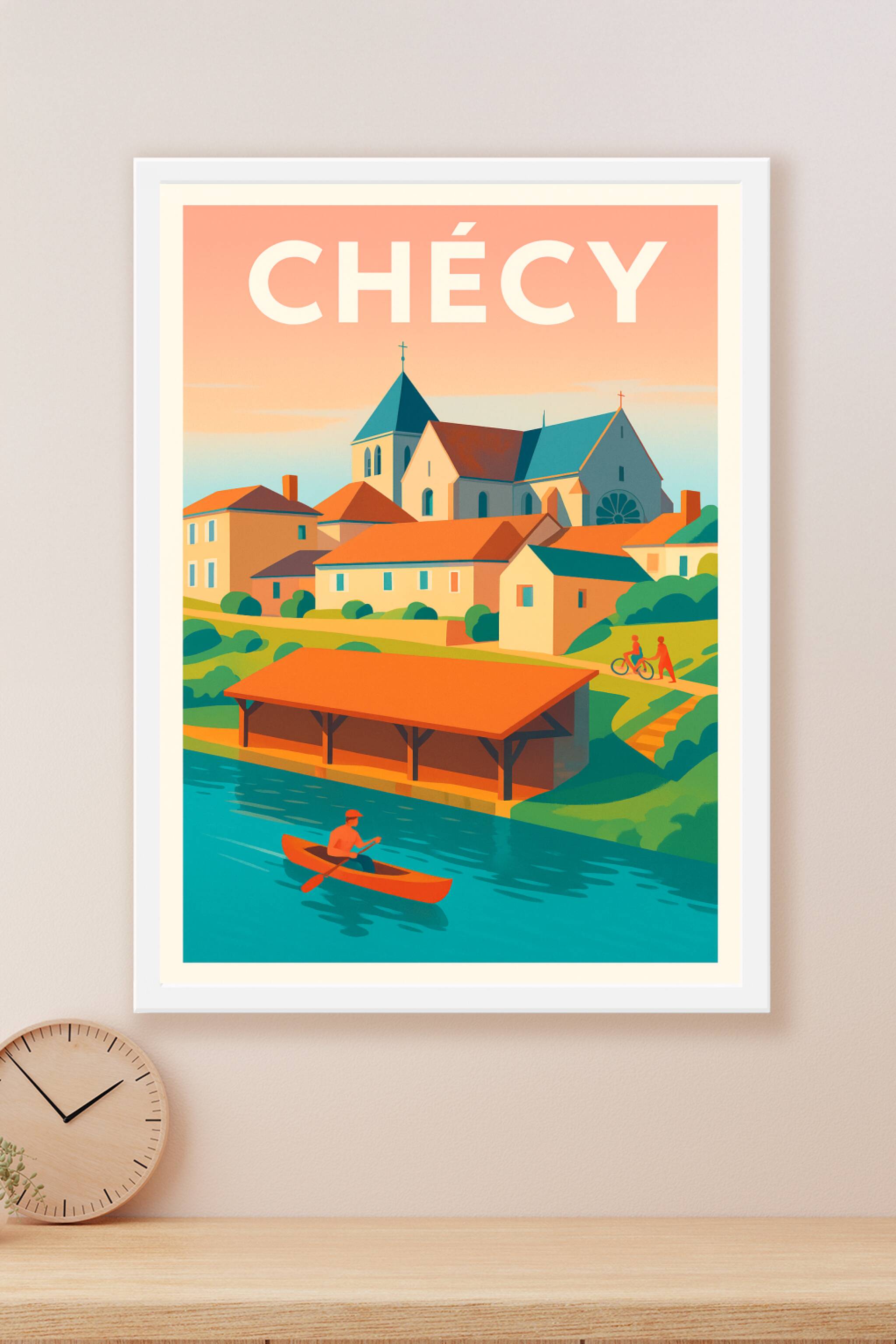 Découvrez l'atmosphère paisible de Chécy à travers cette affiche illustrée qui capture les charmes de cette ville au bord de l'eau, avec ses maison...