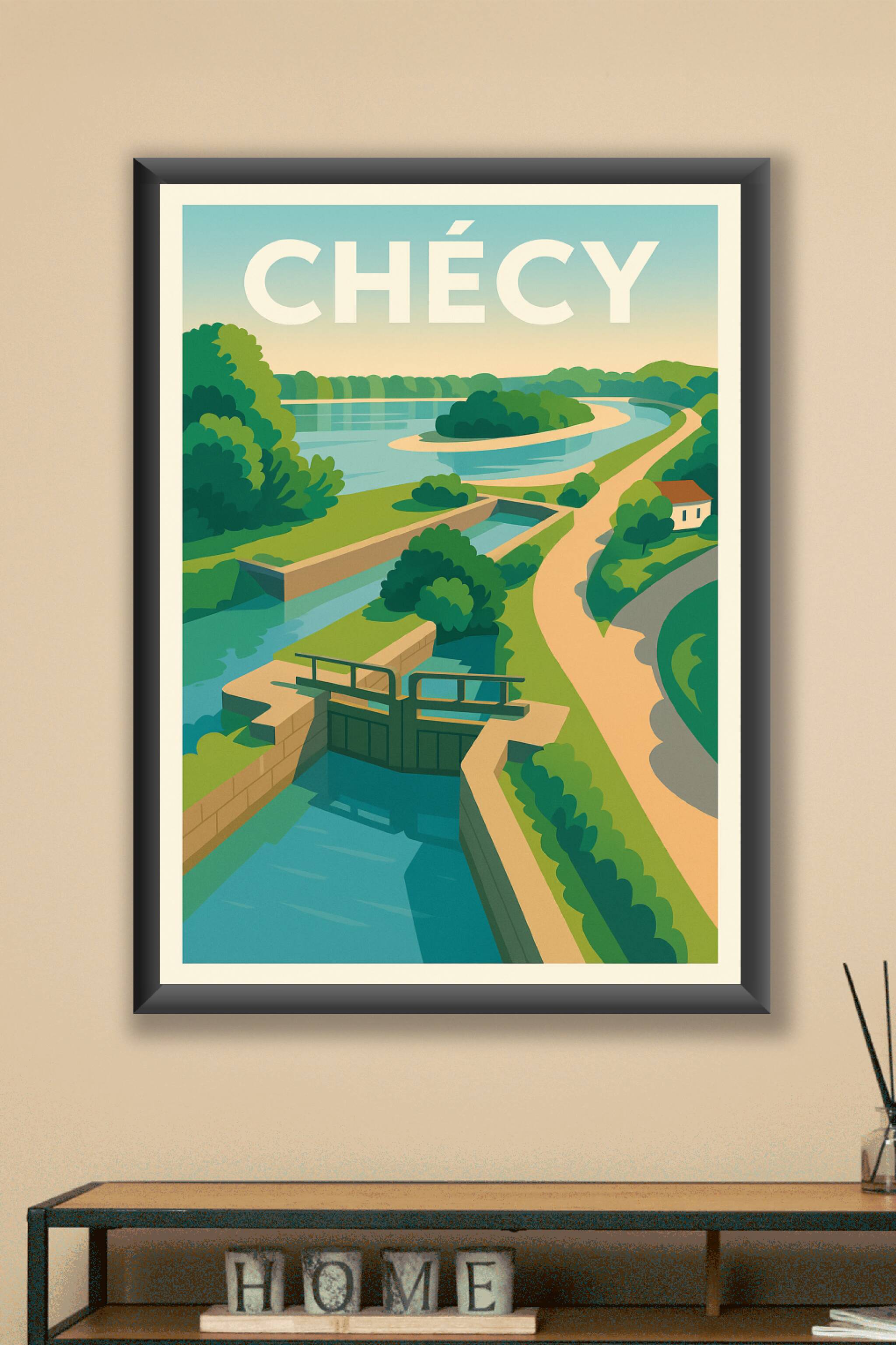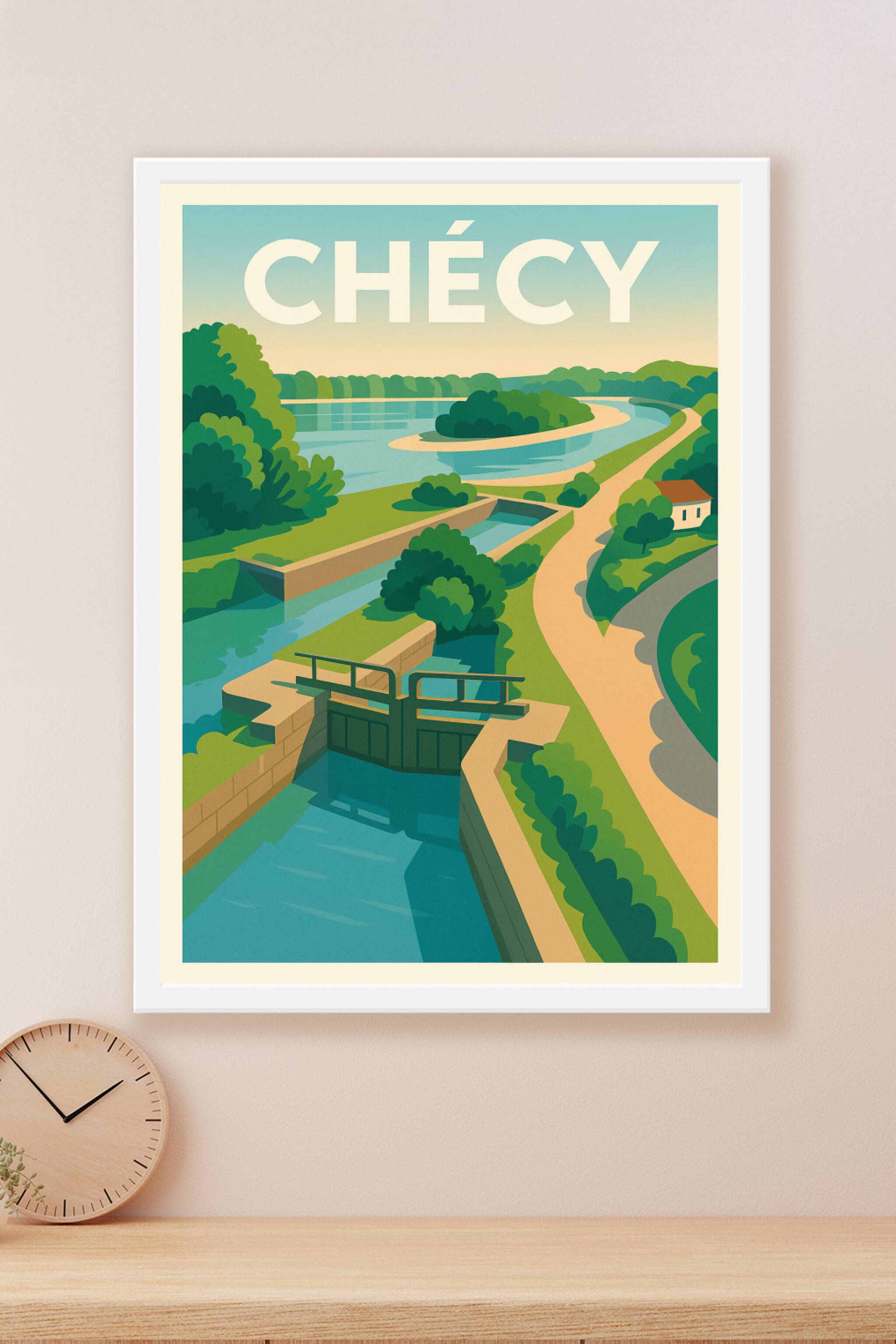 Découvrez la sérénité et la beauté naturelle de Chécy à travers cette affiche délicatement illustrée, qui met en lumière ses voies navigables sinue...
