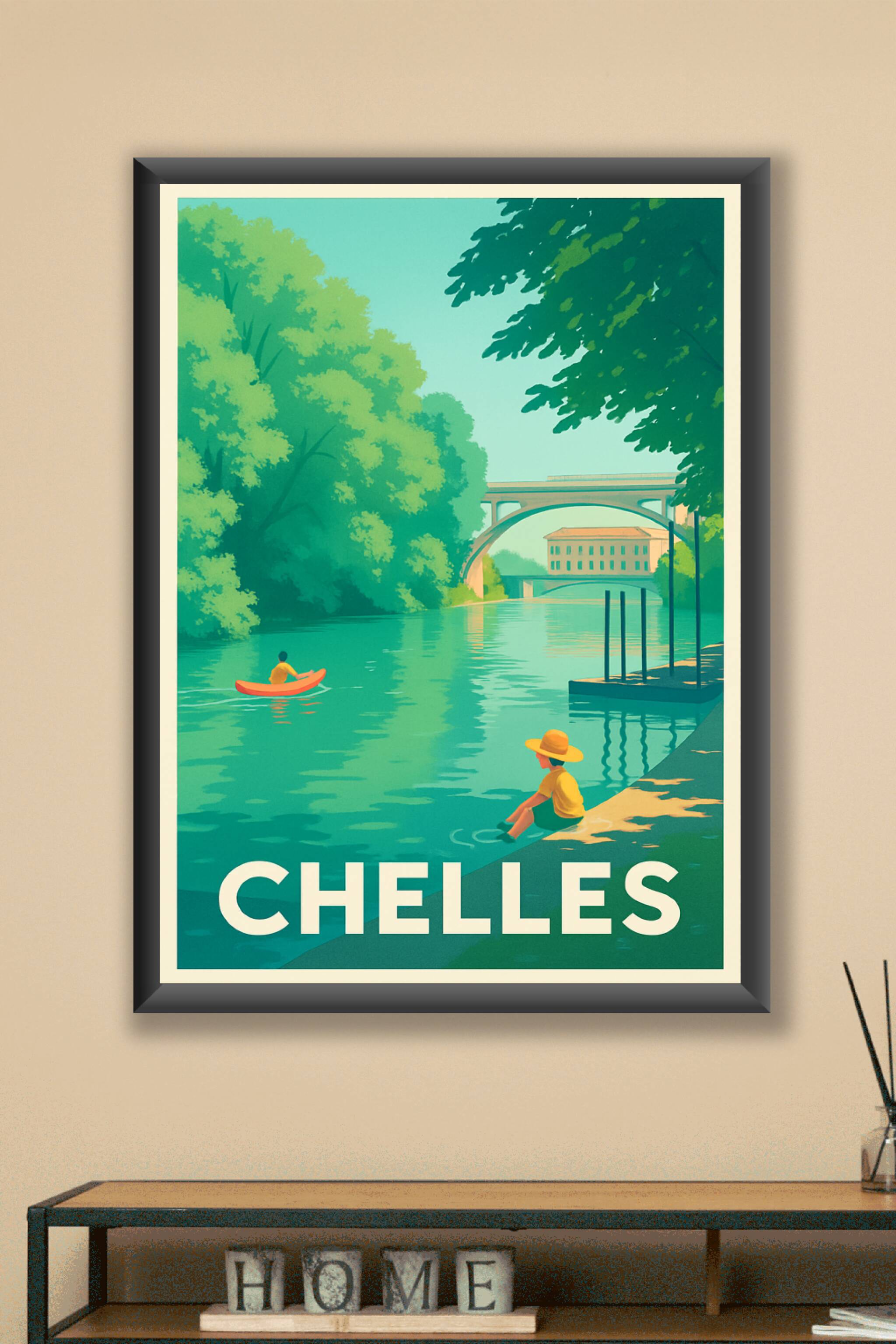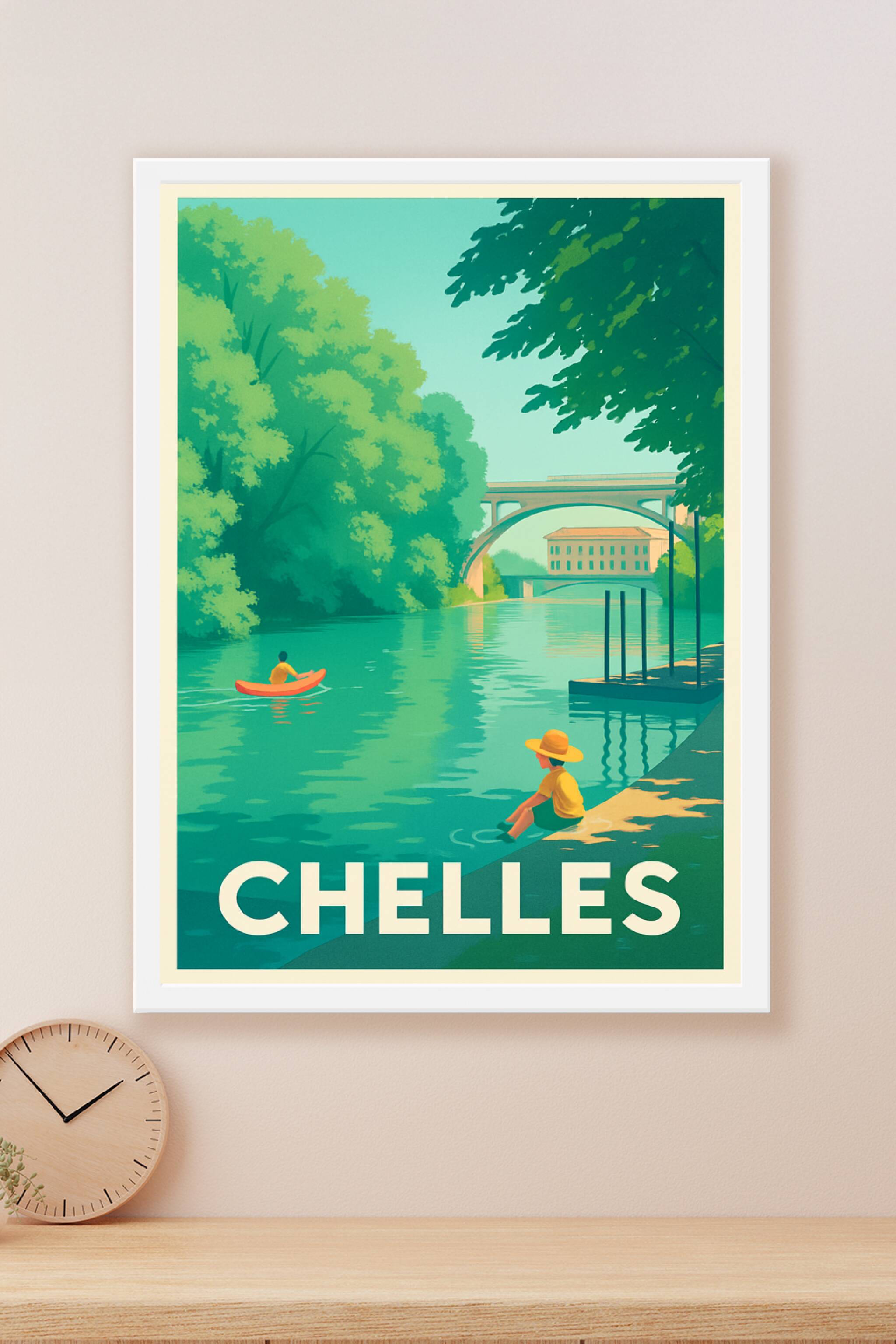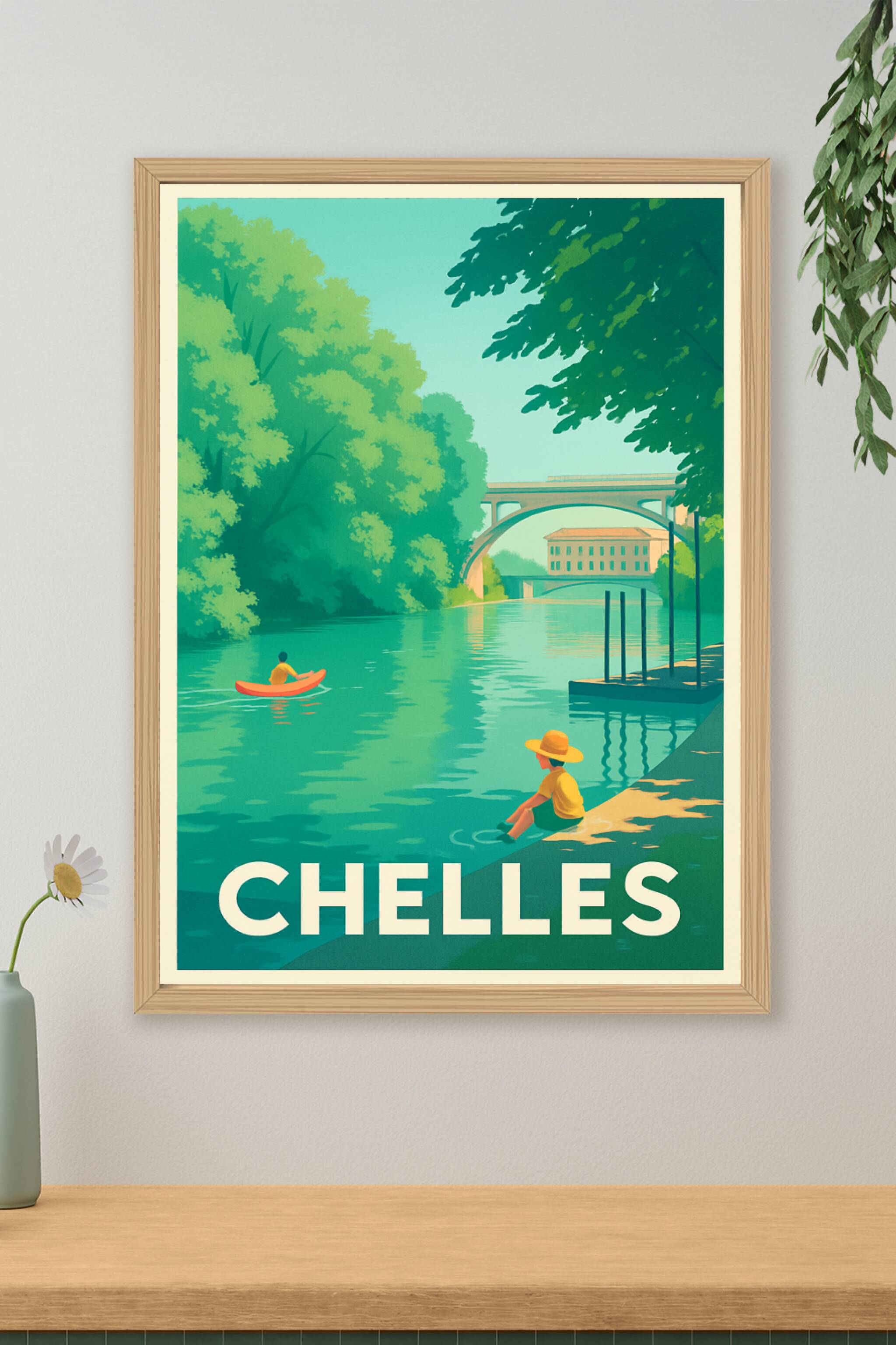 Découvrez l'élégance paisible de Chelles à travers cette affiche illustrée qui capture parfaitement la quiétude des rives verdoyantes et des ponts ...