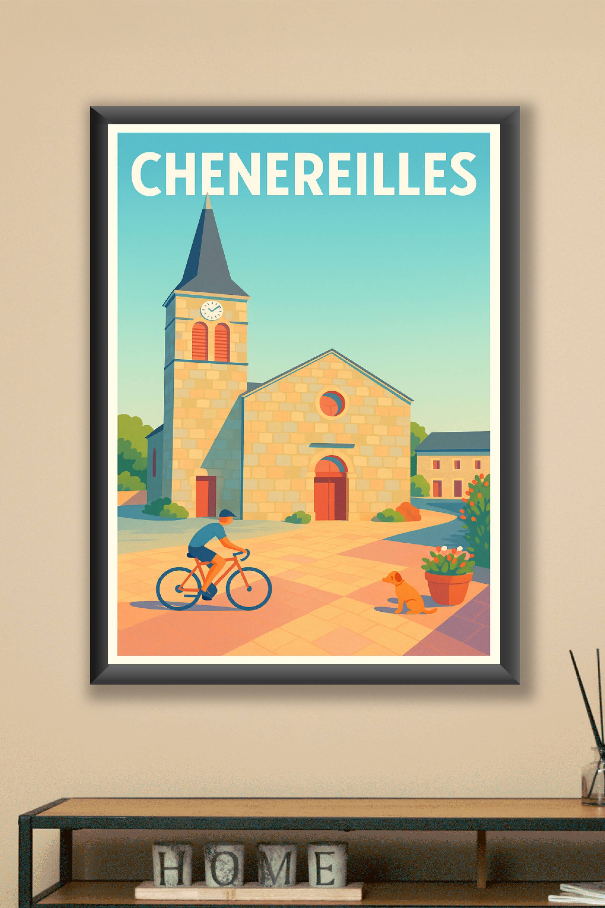 Découvrez l'ambiance tranquille et lumineuse de Cheneireilles à travers cette affiche illustrée avec des couleurs douces et un style contemporain. Le poster met en scène un village typique avec son église en pierre, un cycliste et un chien, symbolisant l'art de vivre serein. Imprimée en tirage Fine Art sur papier 305g coton, cette affiche vous garantit une qualité d'impression exceptionnelle et une tenue dans le temps irréprochable. Disponible en formats A1 à A4, avec ou sans cadre, elle s'intègre harmonieusement à tout intérieur ou bureau. Offrez-vous ou à vos proches ce poster authentique qui évoque la beauté discrète des petits villages français.