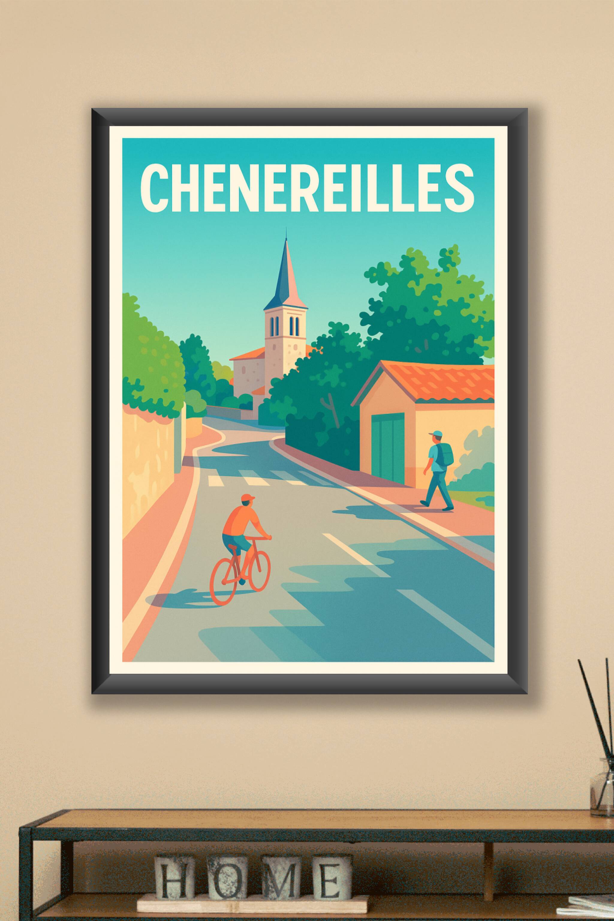 Découvrez l'atmosphère paisible et lumineuse de Chéneireilles avec cette affiche illustrée aux couleurs chaudes et apaisantes. Cette scène de rue, ...