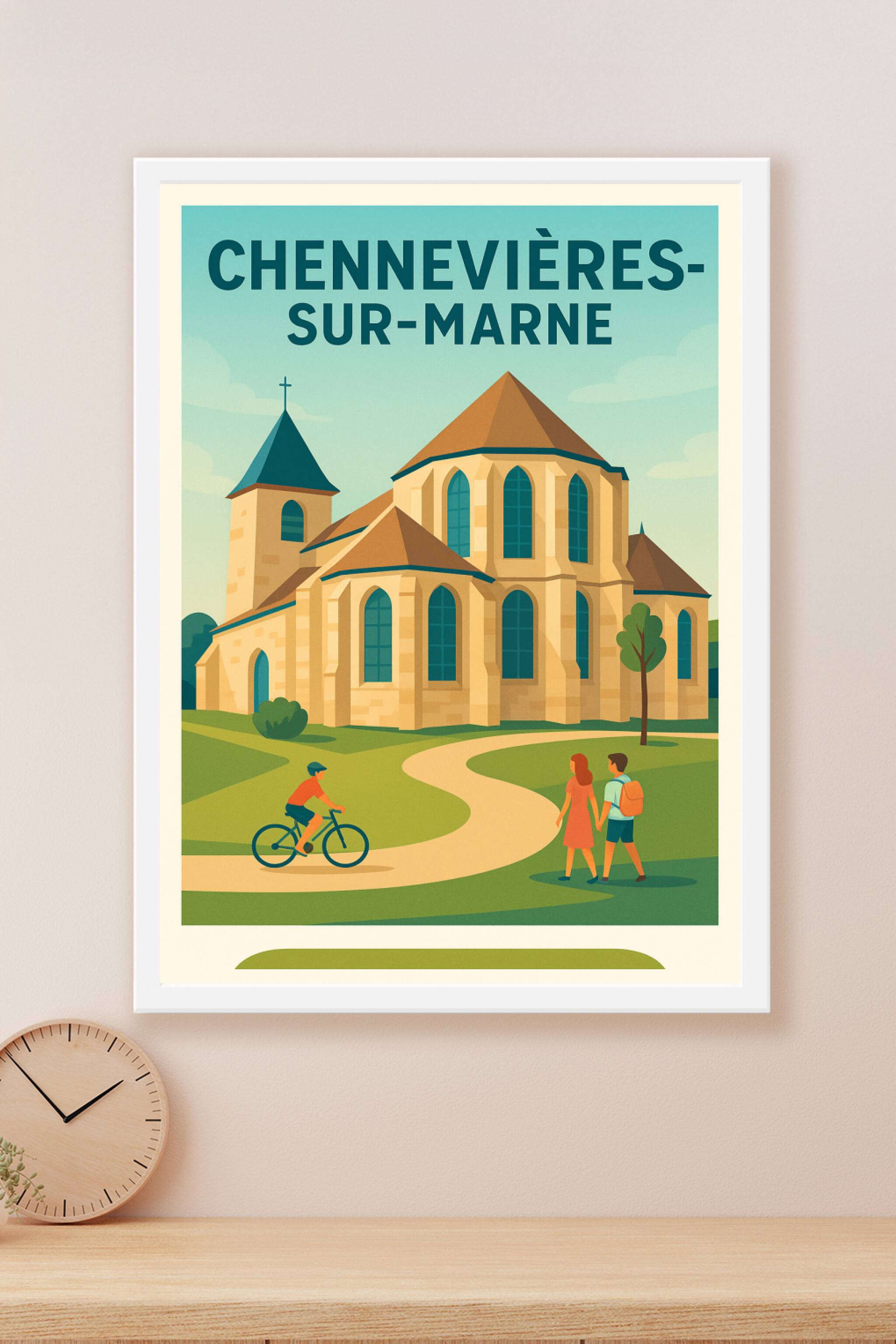 Découvrez l'ambiance paisible et accueillante de Chennevières-sur-Marne à travers cette affiche illustrative mettant en scène l'architecture remarq...