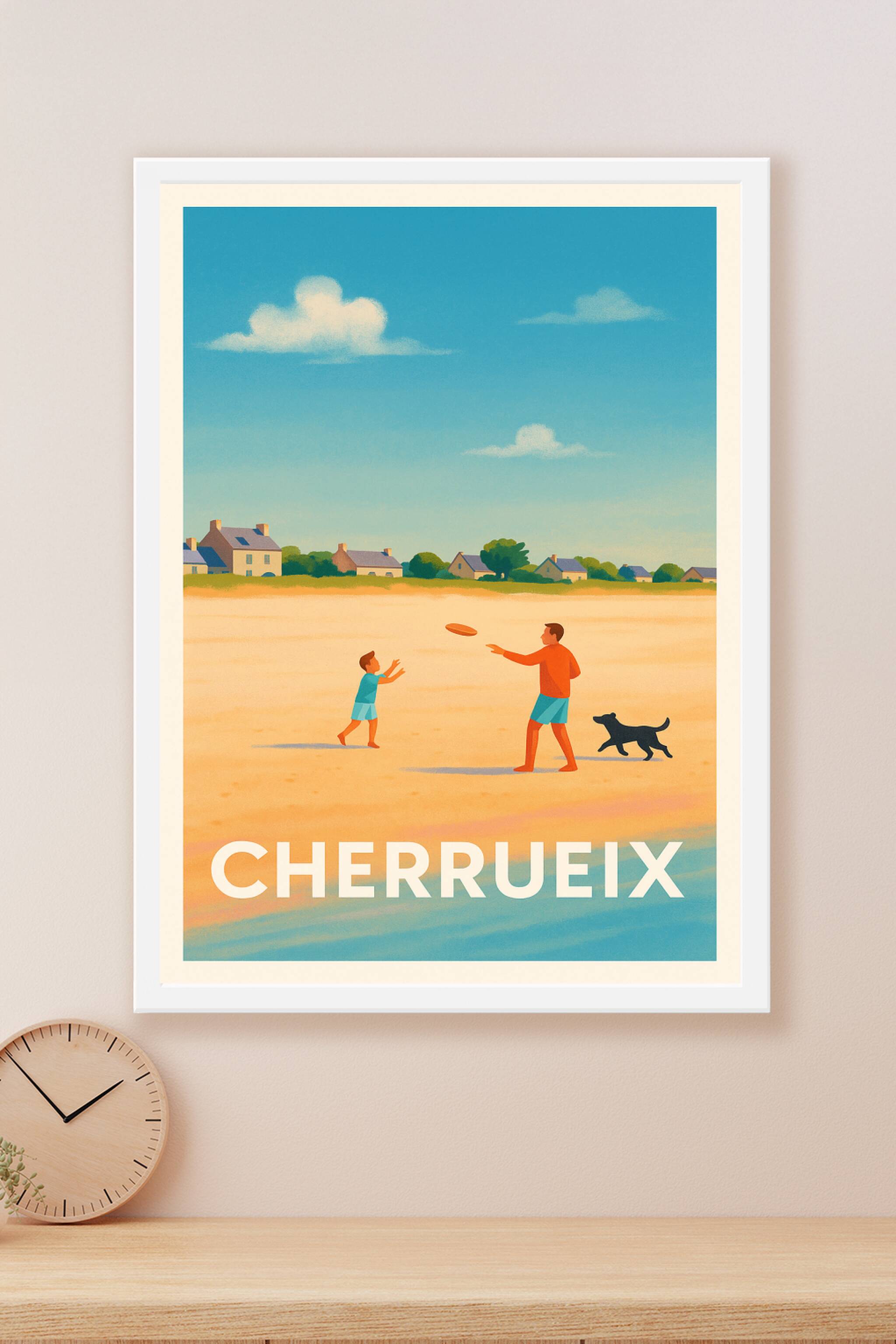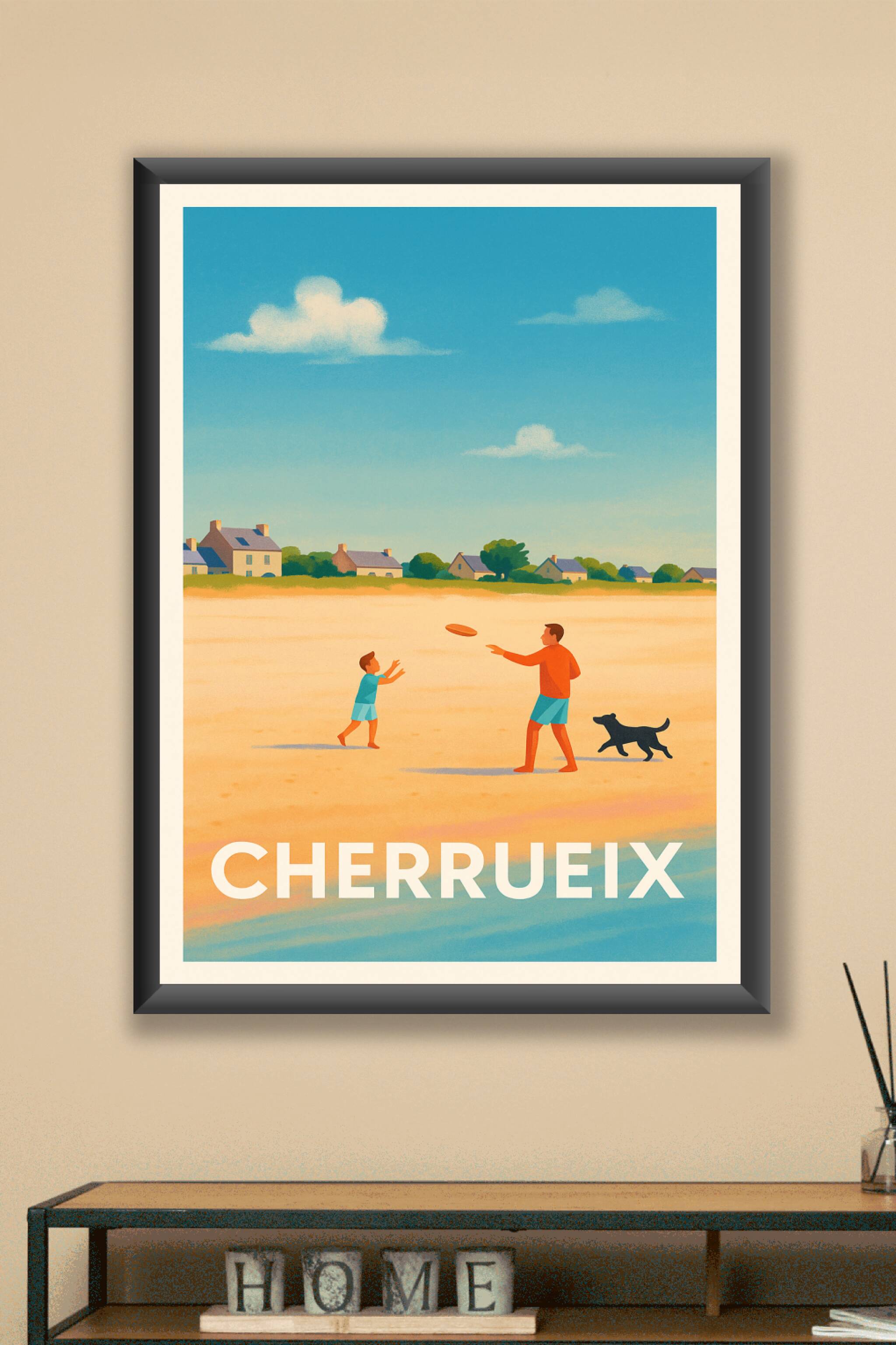 Laissez-vous séduire par cette affiche illustrant un moment de complicité sur la plage de Cherrueix, avec un père, son enfant et leur chien profitant d'une partie de frisbee sous un ciel clair. Ce poster respire la sérénité et la douceur de vivre en bord de mer, à travers des couleurs lumineuses et un style épuré.Affiche imprimée en tirage "Fine Art" sur un papier 305g coton premium assurant une qualité d'impression exceptionnelle et une durabilité optimale. Disponible en formats A1 à A4, avec ou sans cadre, ce poster est idéal pour habiller votre intérieur d'une atmosphère apaisante et authentique. Offrez ou adoptez cette représentation poétique de Cherrueix pour enrichir votre décoration avec raffinement.