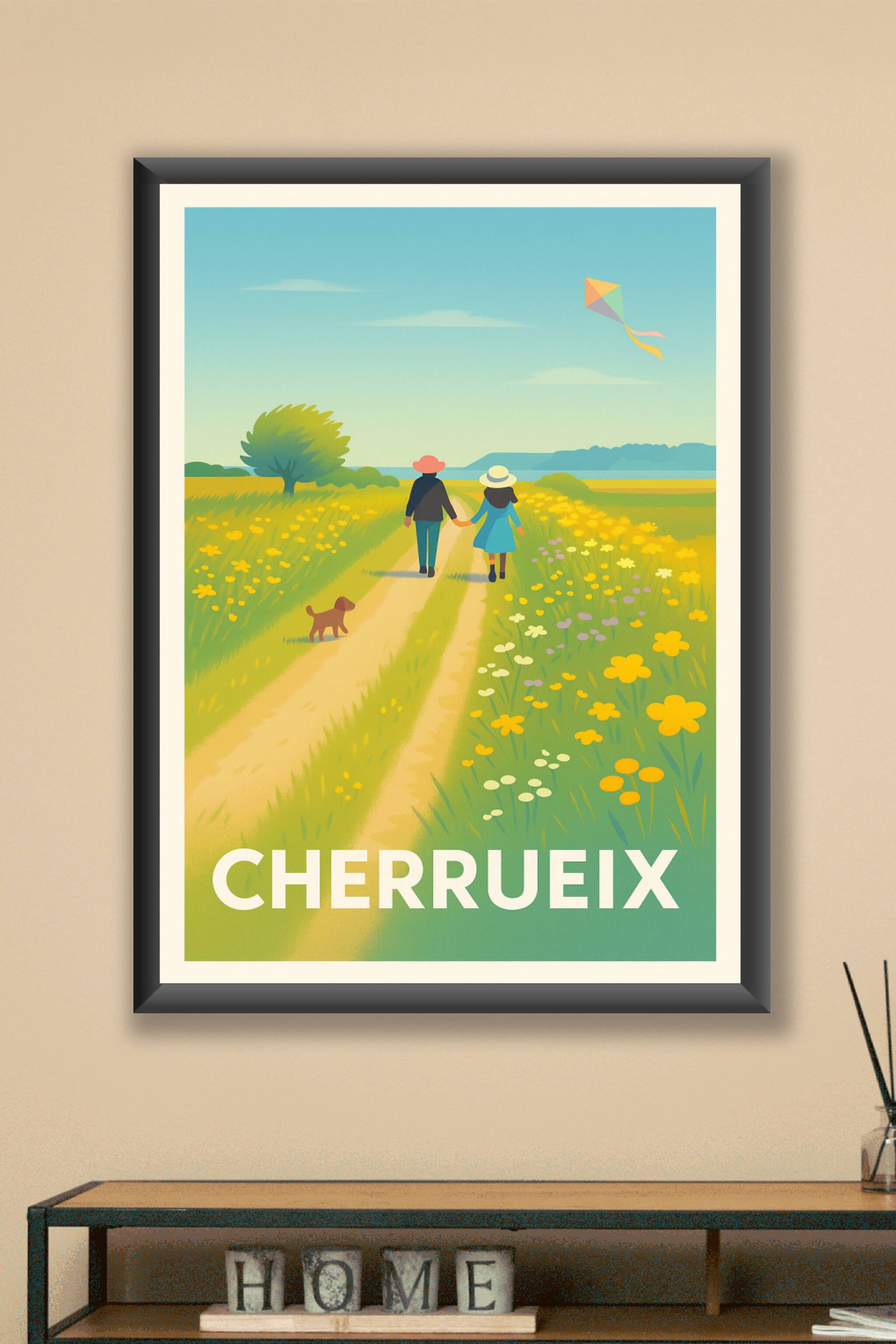 Découvrez le charme paisible de Cherrueix à travers cette affiche illustrée représentant une balade ensoleillée entre champs de fleurs et ciel azuré, accompagnée d'un chien et d'un cerf-volant coloré. Ce poster évoque harmonie et simplicité dans un décor naturel apaisant. Imprimé en tirage Fine Art sur papier 305g coton, ce poster garantit une qualité d'impression exceptionnelle pour sublimer votre intérieur. Disponible en formats A1 à A4, avec ou sans cadre, cette affiche est idéale pour apporter une touche de douceur champêtre à votre décoration ou pour offrir un cadeau authentique aux amoureux de la nature et des paysages bretons.