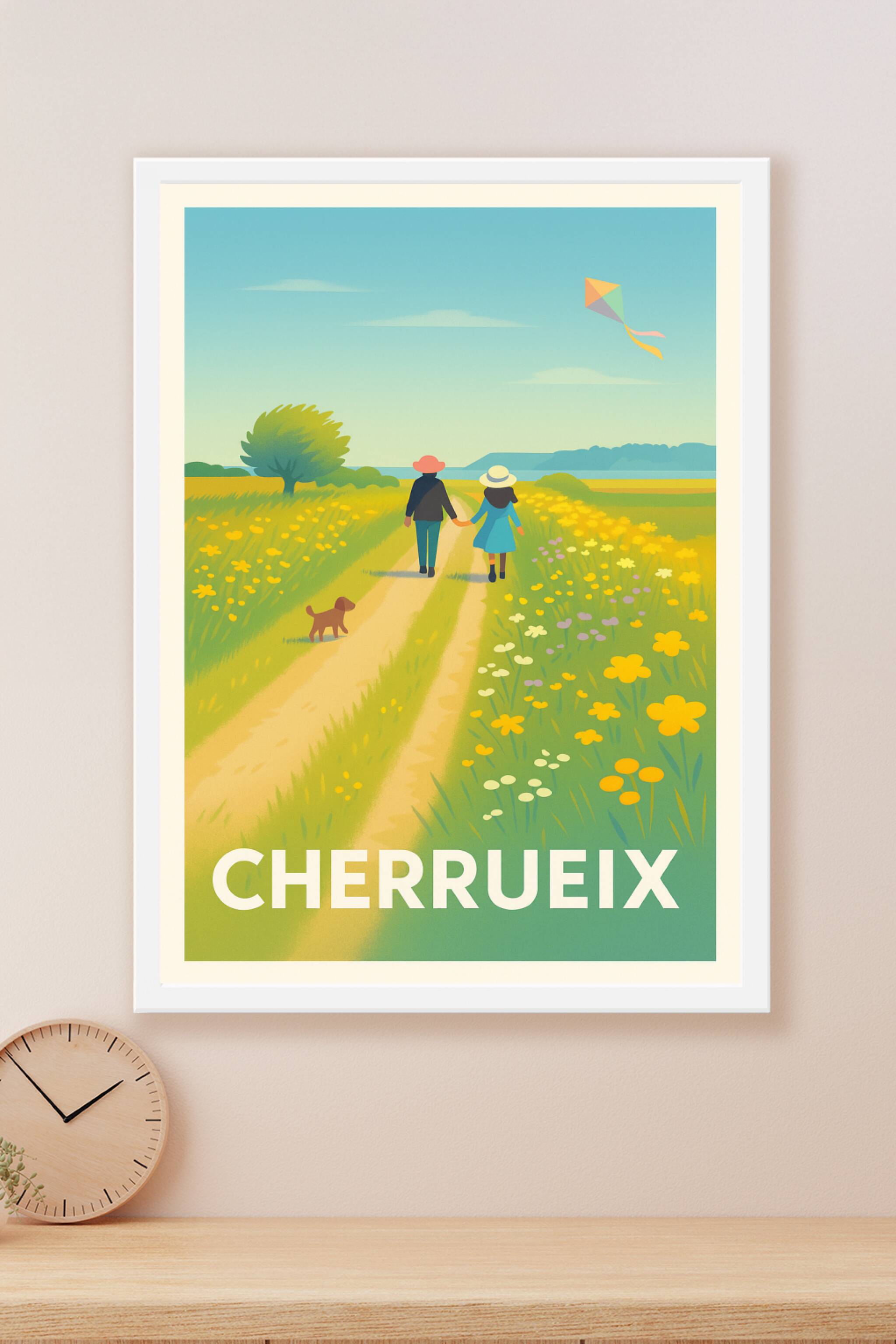 Découvrez le charme paisible de Cherrueix à travers cette affiche illustrée représentant une balade ensoleillée entre champs de fleurs et ciel azur...