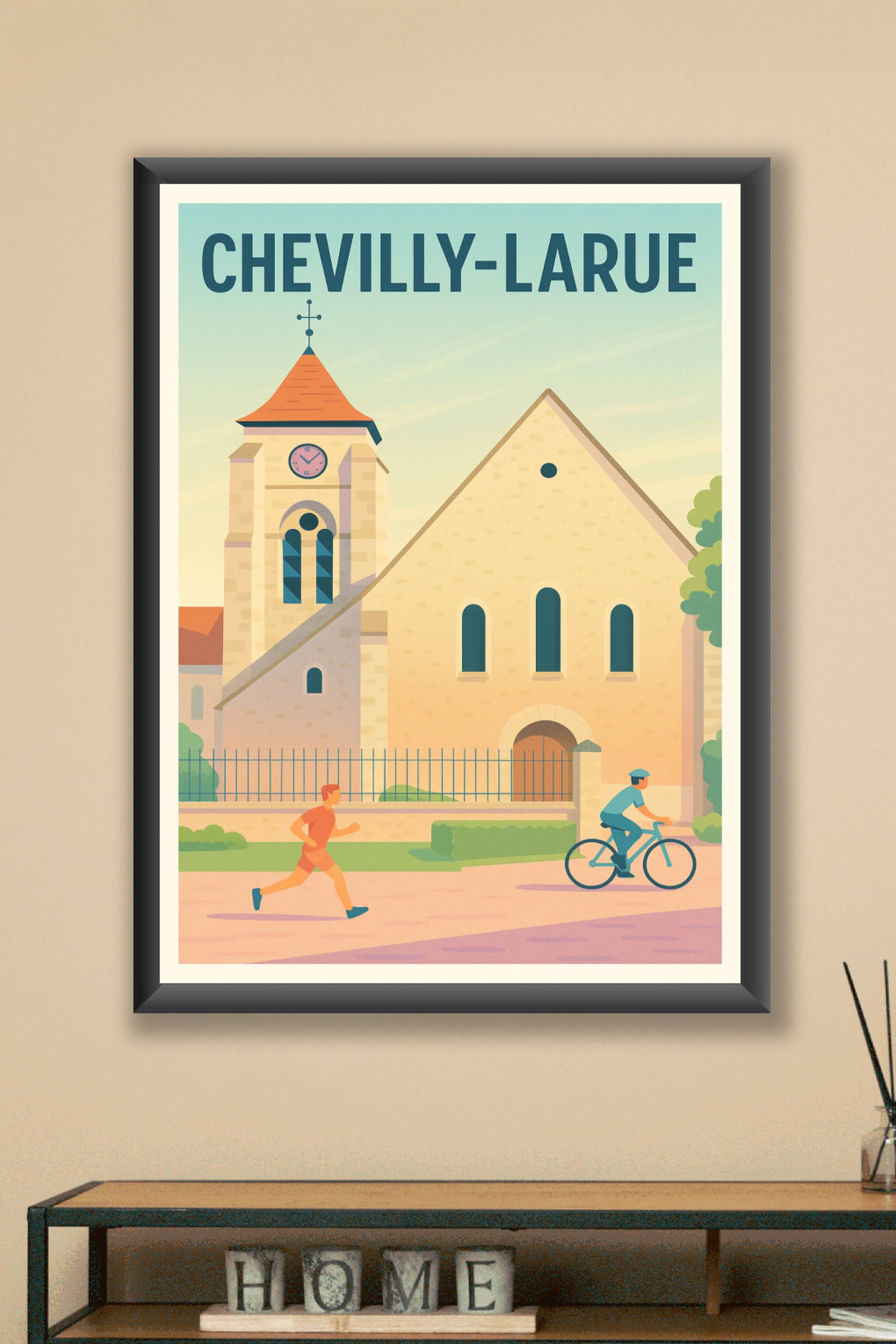 Découvrez l'atmosphère tranquille et accueillante de Chevilly-Larue avec cette affiche illustrée montrant une scène de vie quotidienne devant une é...
