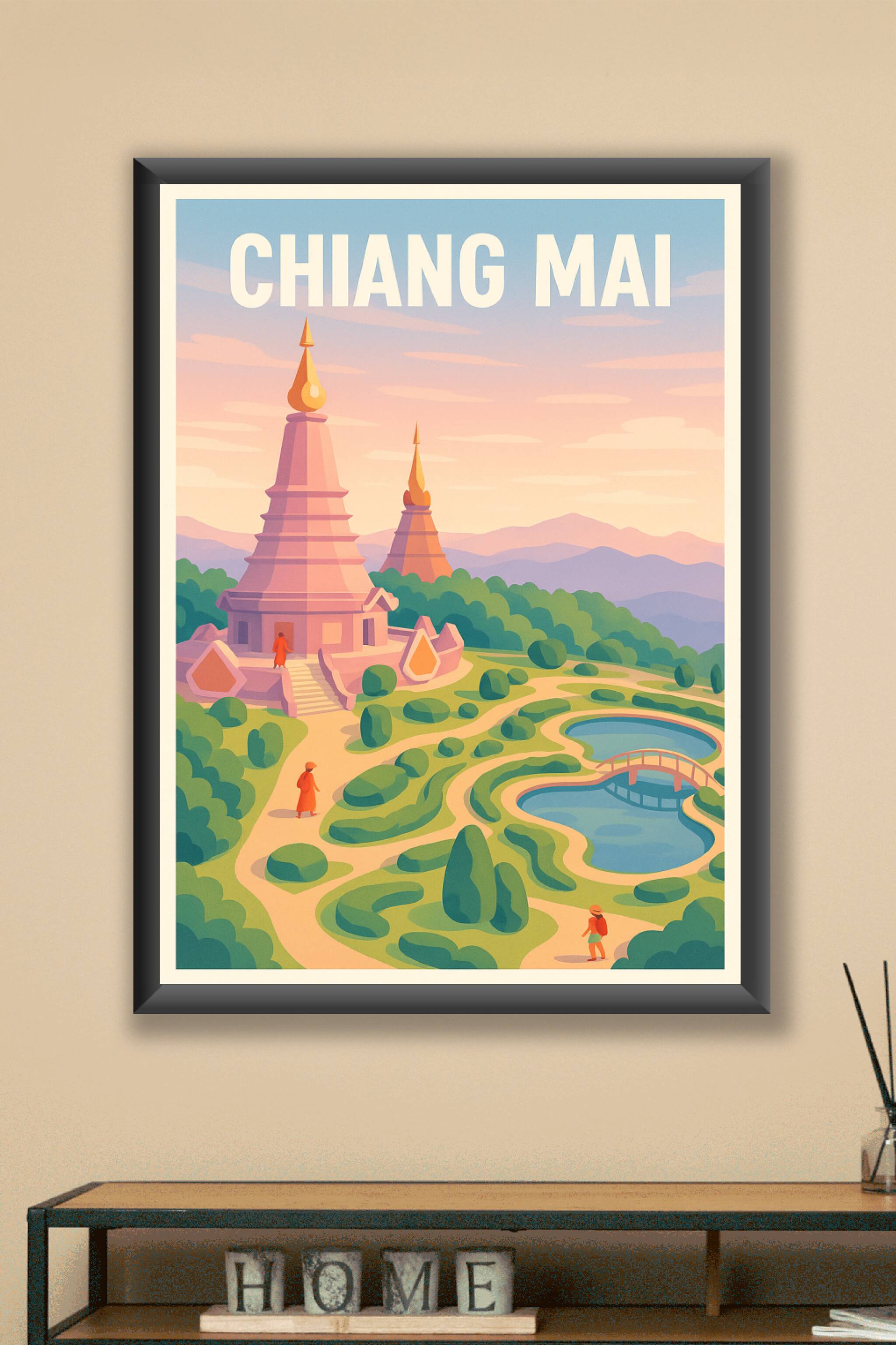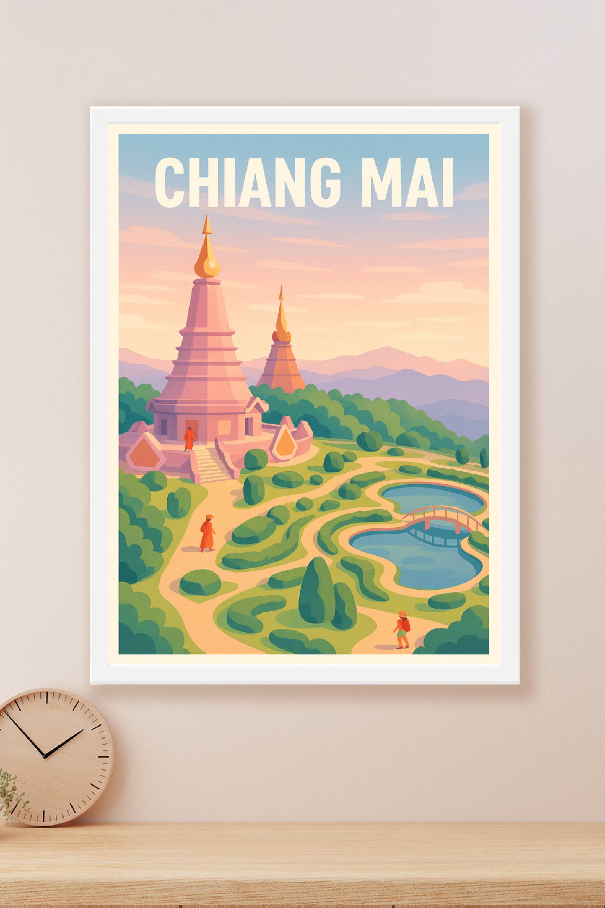 Découvrez la beauté paisible de Chiang Mai avec cette affiche aux teintes douces et apaisantes, évoquant la spiritualité des temples et la nature l...
