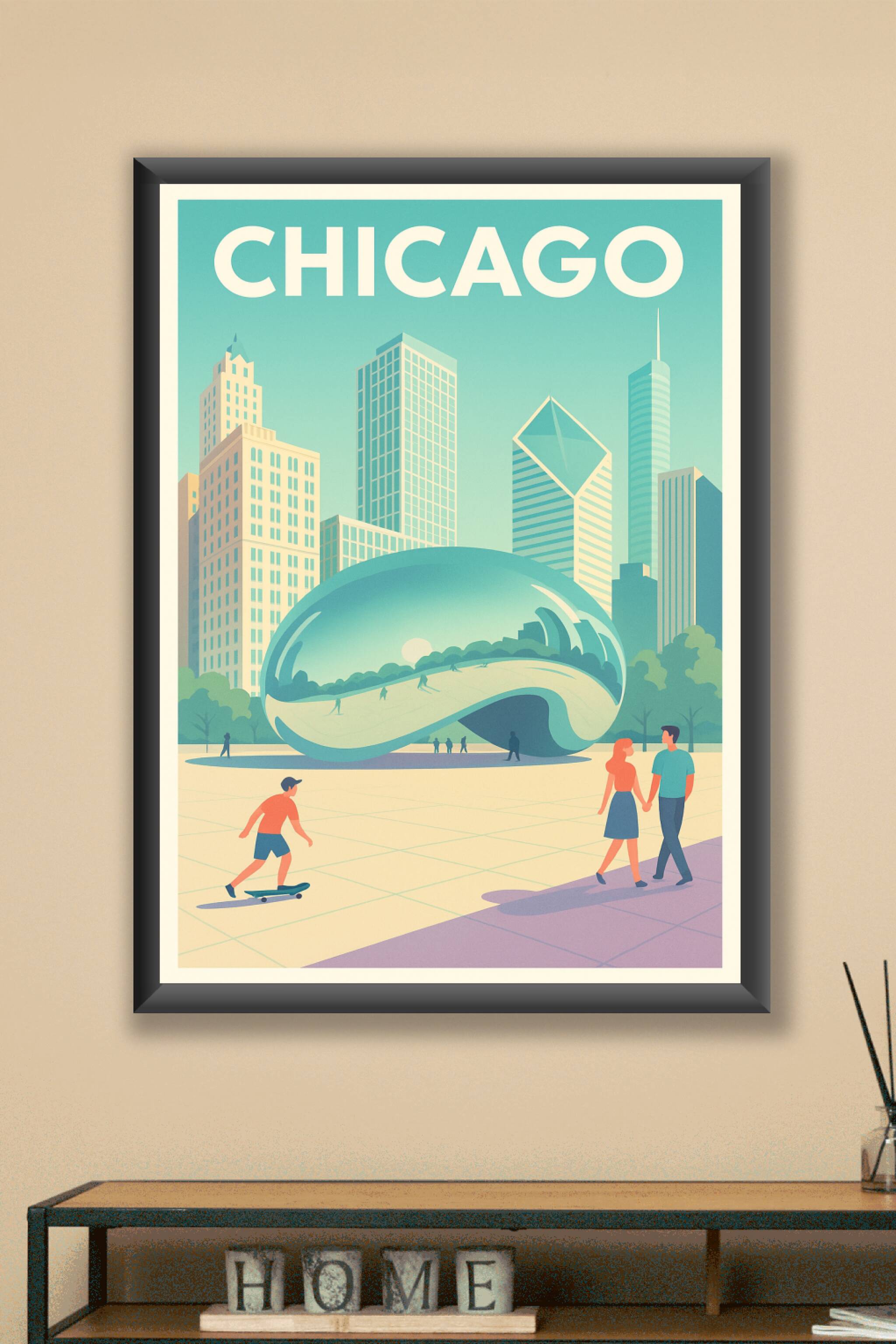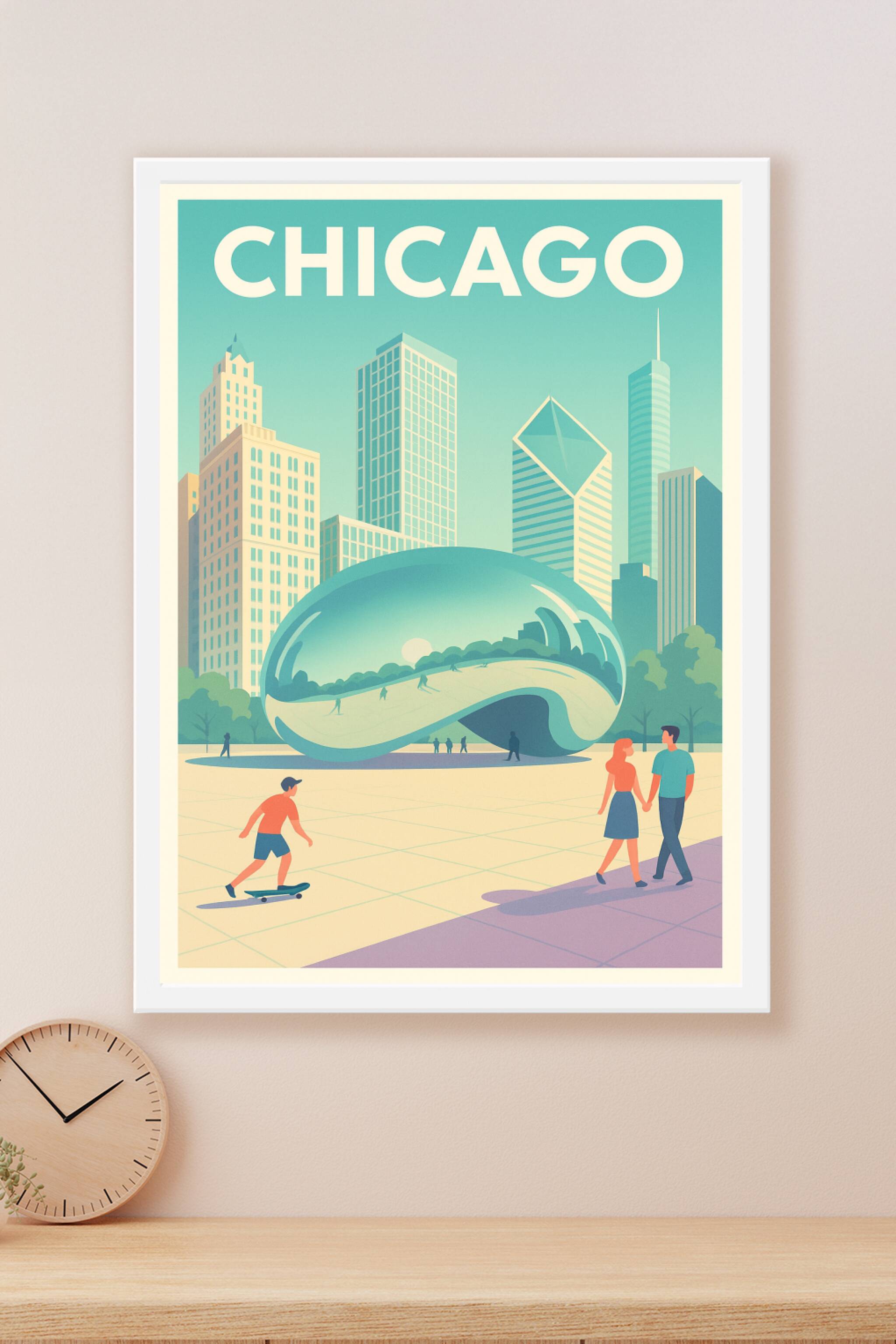Découvrez cette affiche au design épuré mettant en valeur l'emblématique sculpture Cloud Gate dans le parc Millennium de Chicago. Ce poster capture l'énergie dynamique de la ville avec ses gratte-ciels stylisés et ses habitants en pleine activité, dans une palette de couleurs douces et lumineuses. Disponible en tirage "Fine Art" sur papier 305g coton, cette affiche garantit une qualité d'impression exceptionnelle et des détails précis. Proposée en formats A1 à A4, avec ou sans cadre, elle s'accordera parfaitement à votre intérieur pour une décoration moderne et raffinée, ou comme cadeau original pour les amoureux de Chicago.