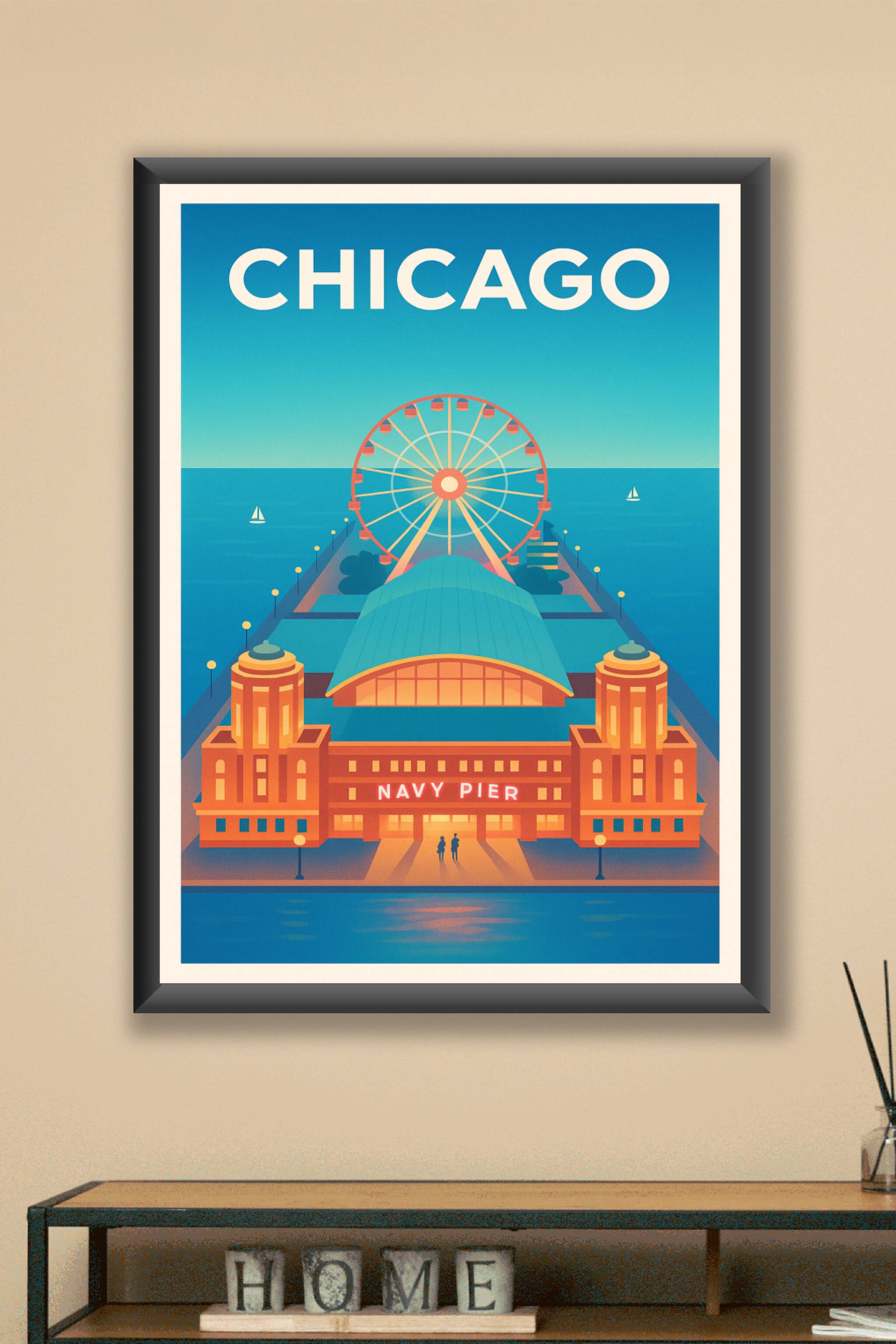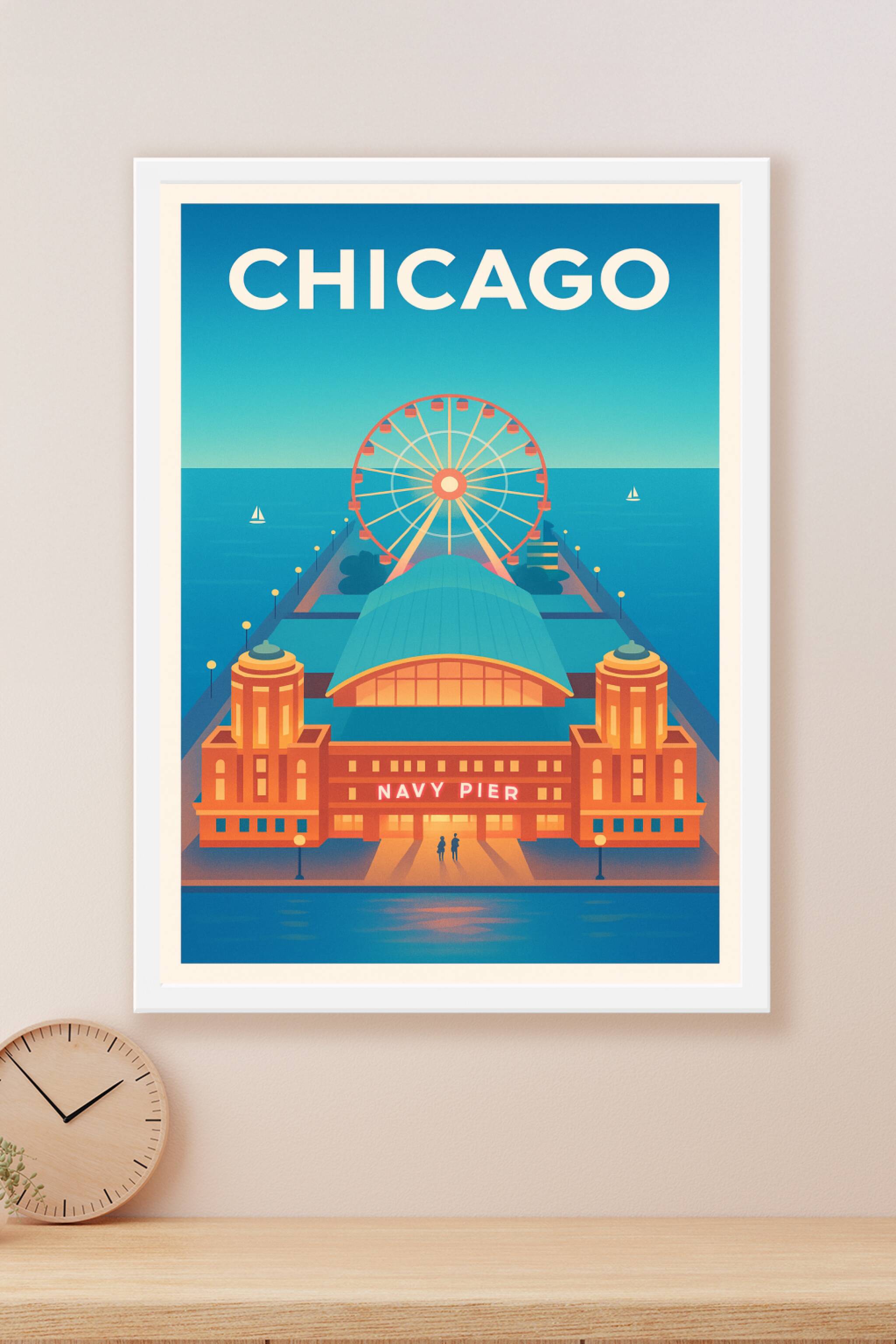 Découvrez le Navy Pier de Chicago à travers cette affiche au style rétro moderne, qui célèbre ce lieu emblématique au bord du lac Michigan. Le post...