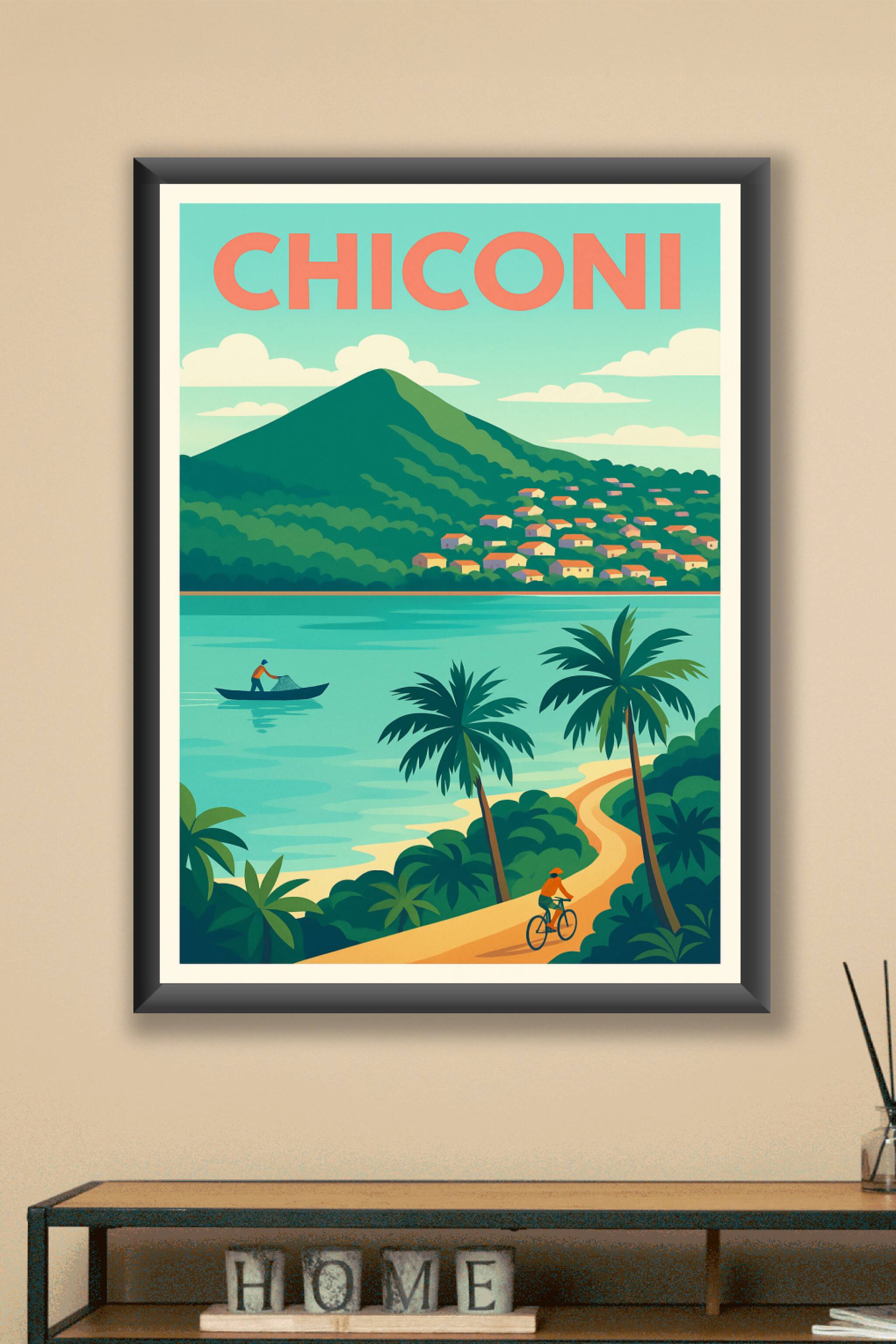 Découvrez la sérénité de Chiconi avec cette magnifique affiche illustrée qui met en avant ses paysages tropicaux et son cadre naturel idyllique. Ce...