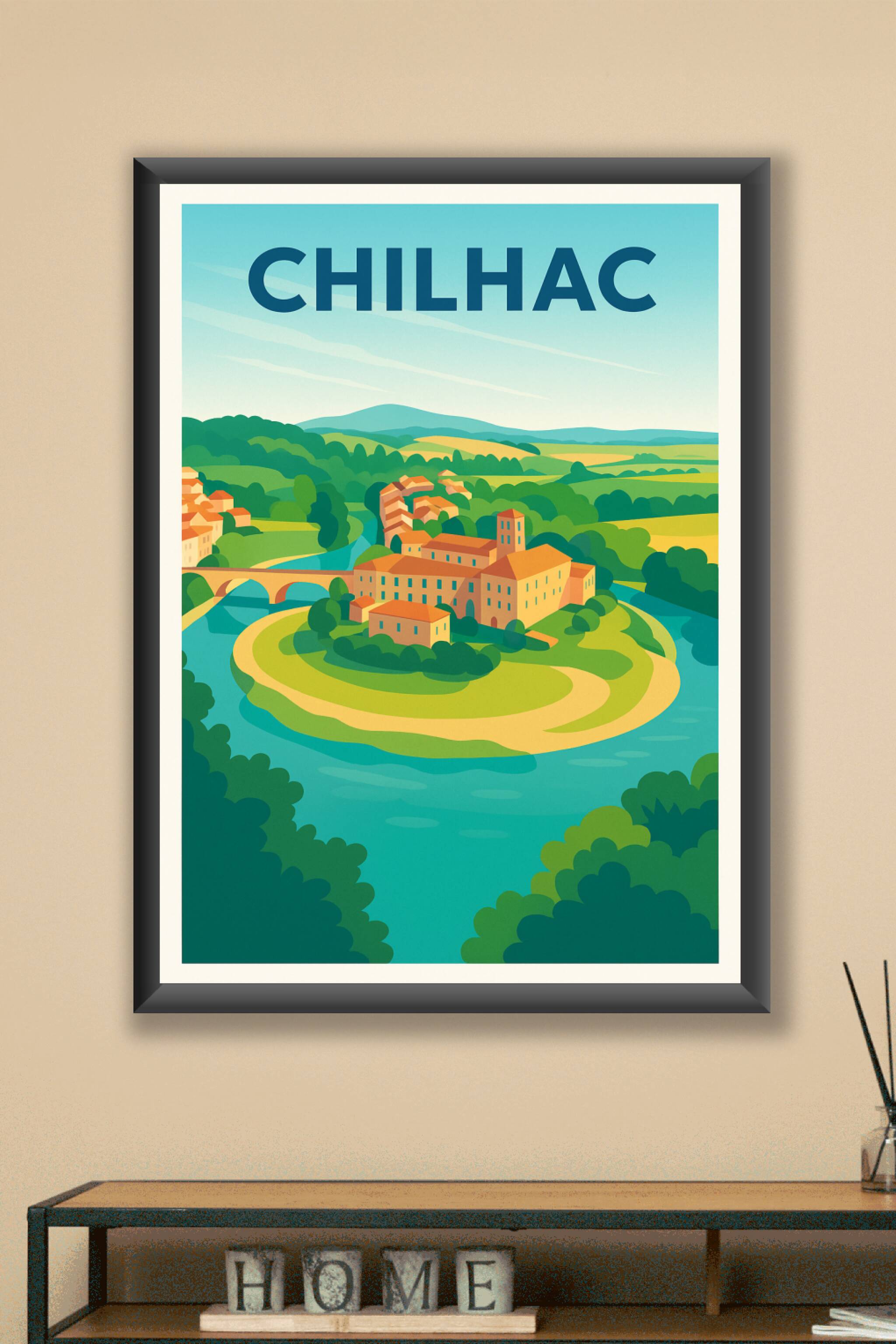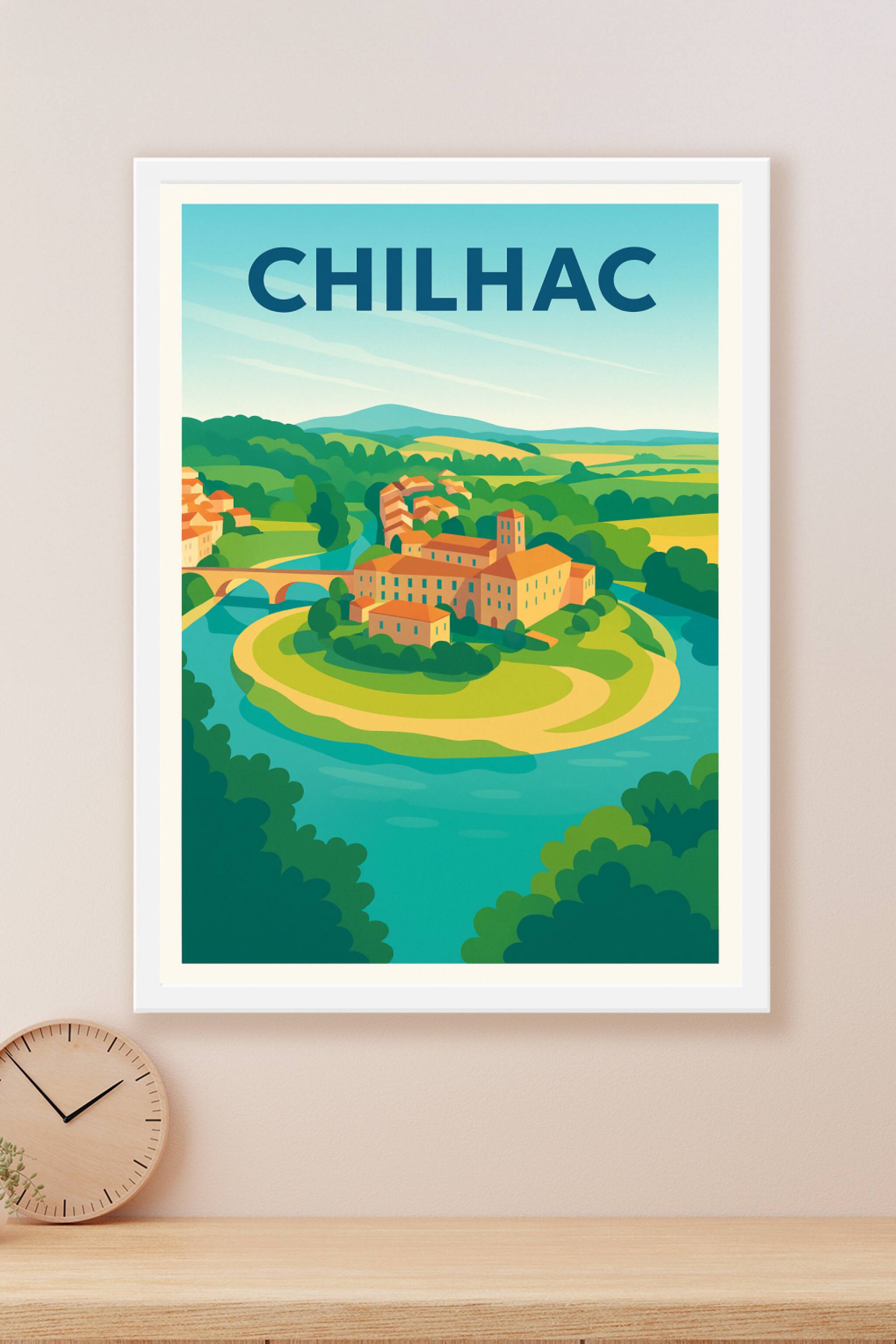 Découvrez la douceur de vivre en Auvergne avec cette affiche illustrée qui met en lumière le charmant village de Chilhac, niché dans une boucle apa...