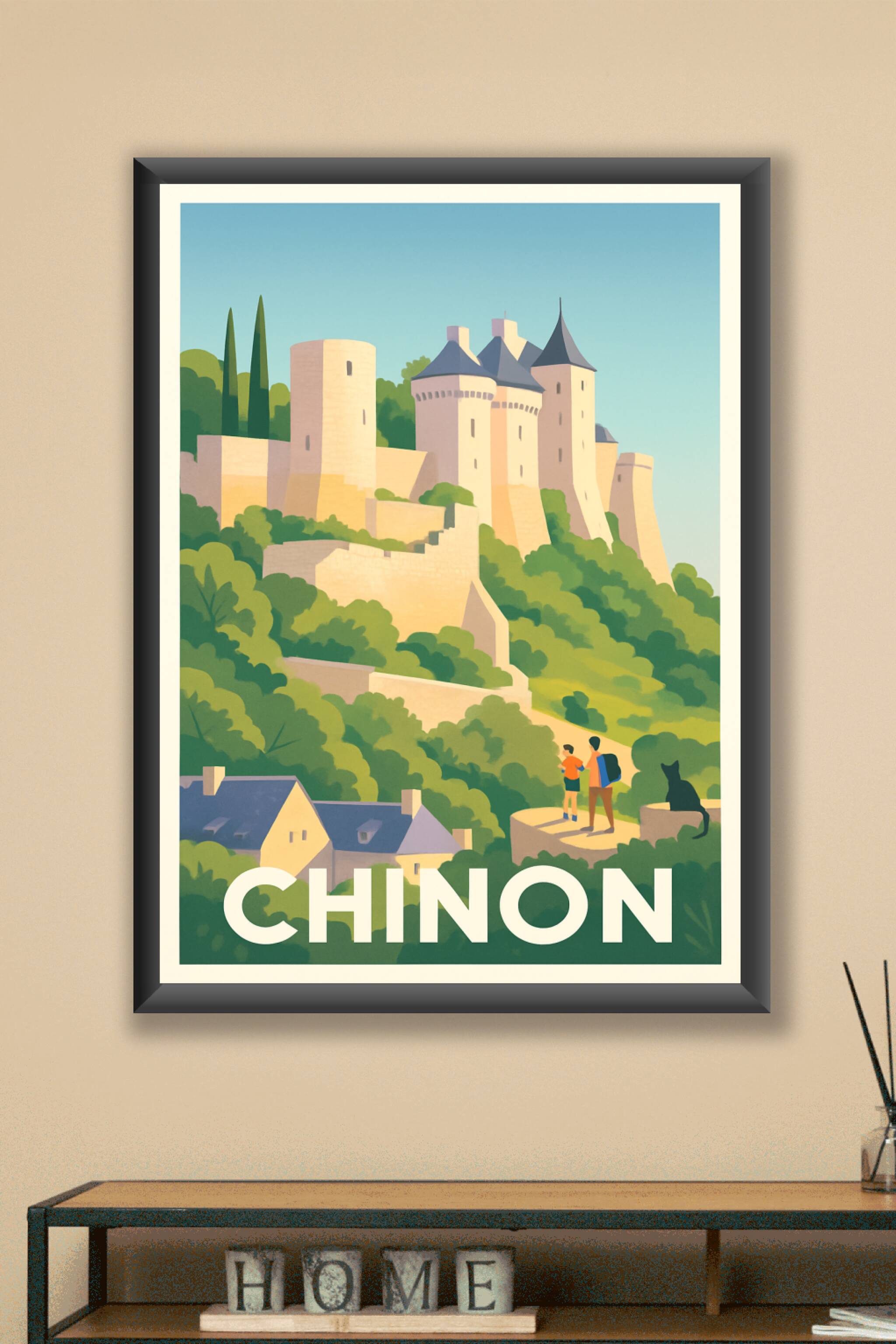 Découvrez la majesté du château de Chinon à travers cette affiche au style vintage qui capture l'essence médiévale de la ville. L'illustration met en valeur les tours imposantes et les remparts entourés de verdure, offrant une atmosphère pleine de charme et de mystère.Ce poster est imprimé en tirage "Fine Art" sur papier 305g coton, garantissant une qualité d'impression exceptionnelle et des couleurs éclatantes. Disponible en plusieurs formats, de A4 à A1, avec ou sans cadre, cette affiche s'adapte parfaitement à tous les espaces de votre intérieur.Offrez-vous un morceau d'histoire avec ce poster d'exception, 100% fabriqué en France, idéal pour décorer votre maison ou faire un cadeau raffiné aux passionnés de patrimoine.
