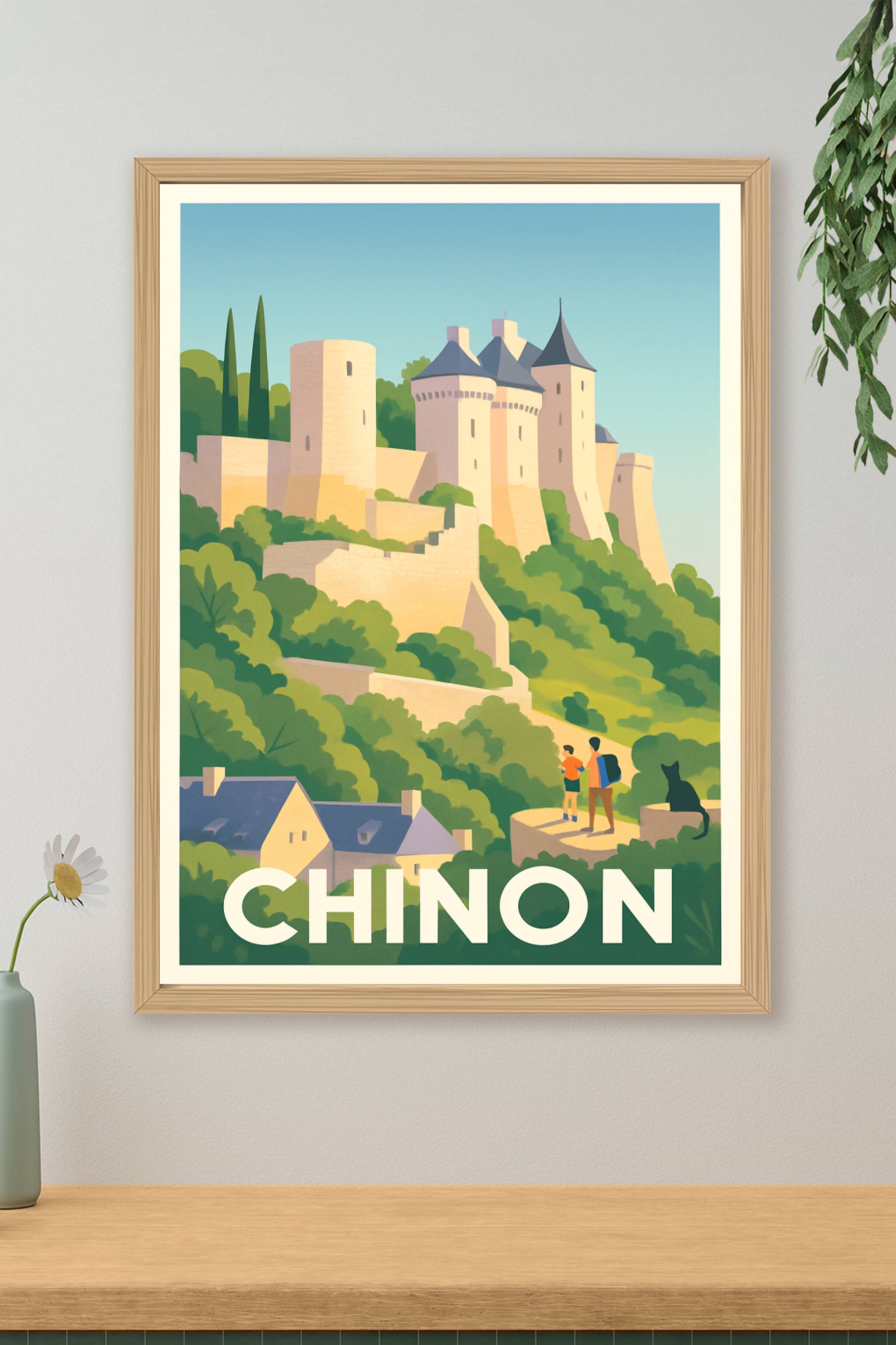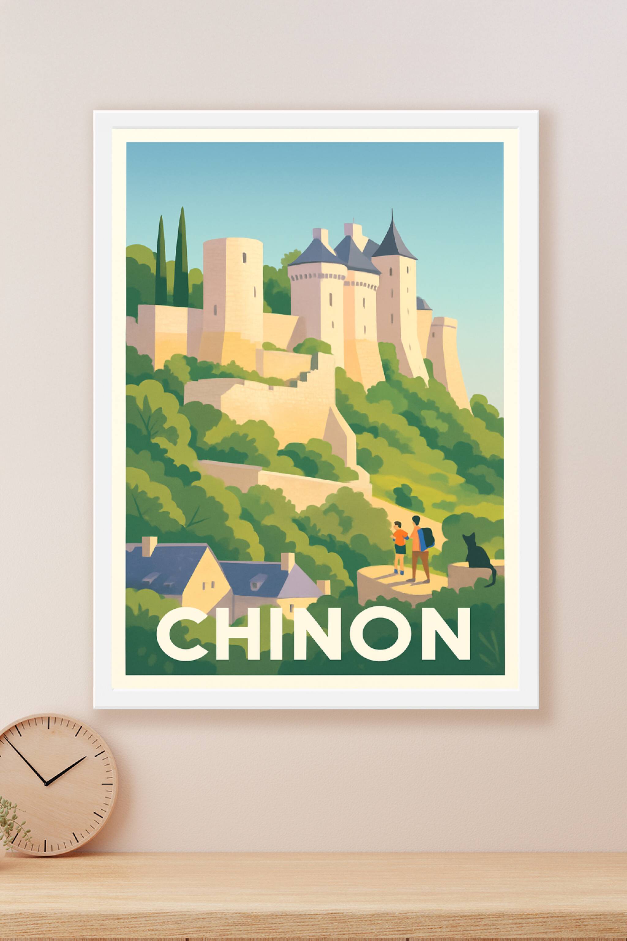 Découvrez la majesté du château de Chinon à travers cette affiche au style vintage qui capture l'essence médiévale de la ville. L'illustration met ...