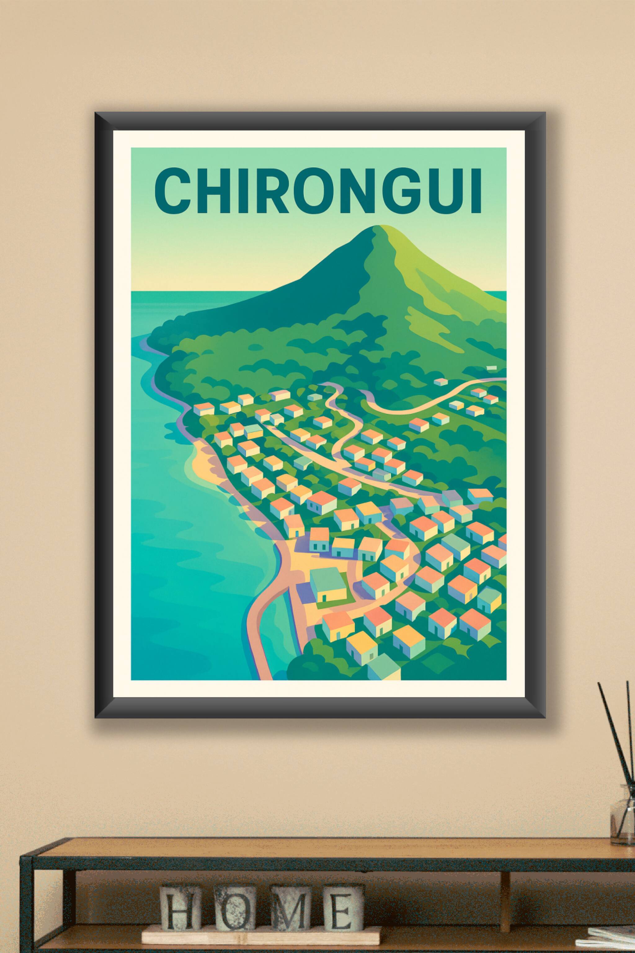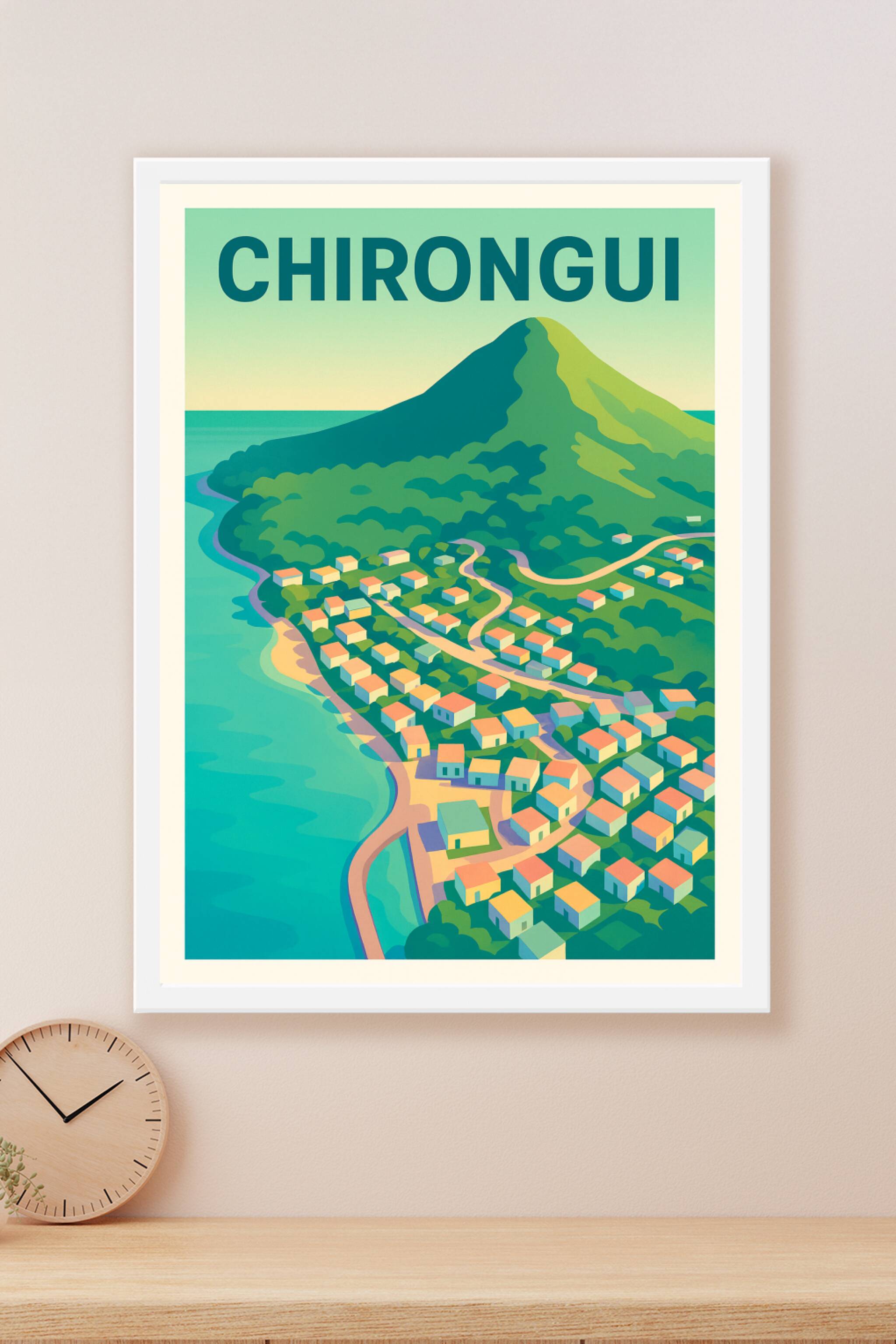 Découvrez Chirongui à travers cette affiche au style graphique et coloré mettant en valeur la beauté naturelle et l'architecture locale. La côte bo...