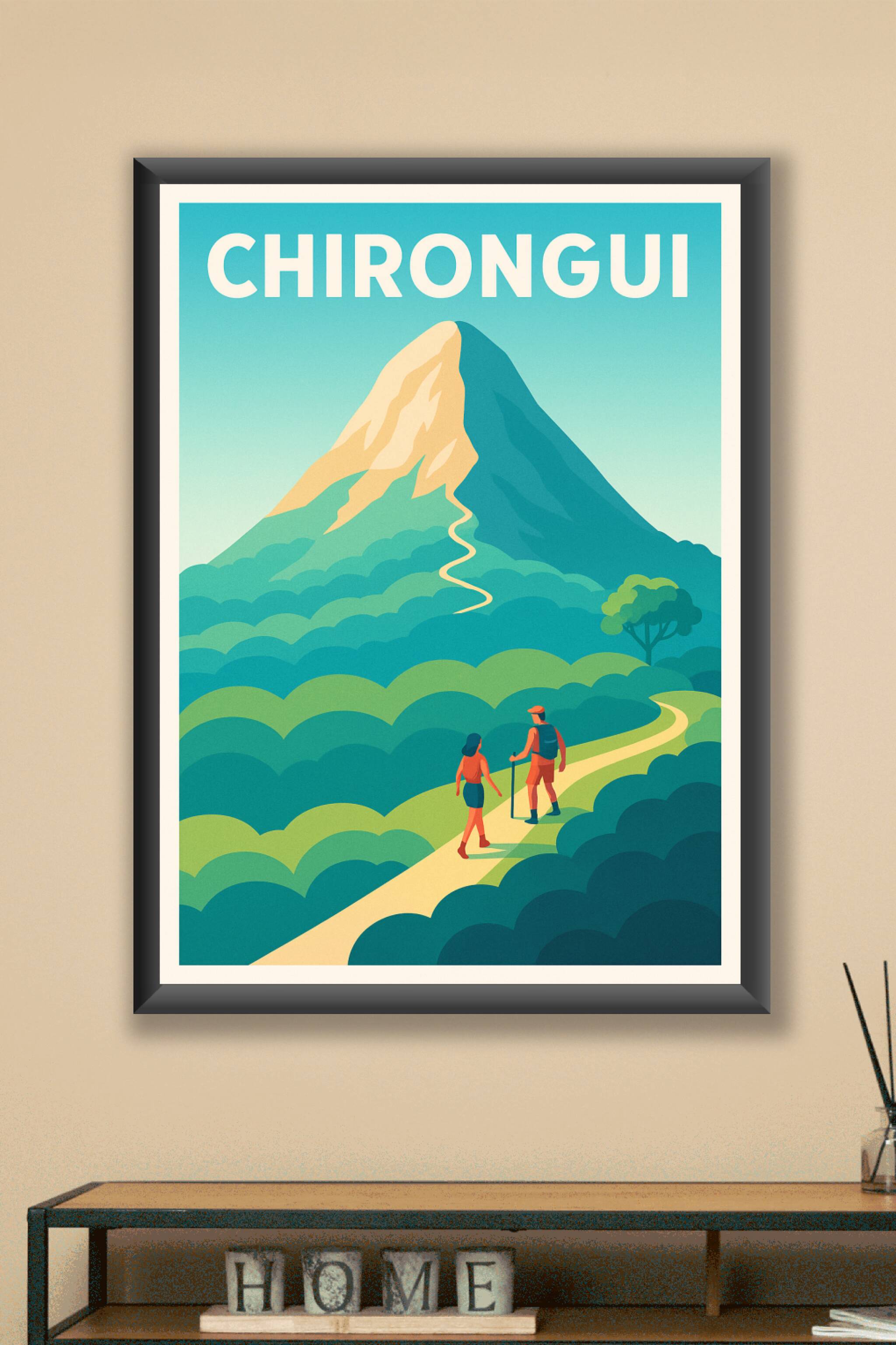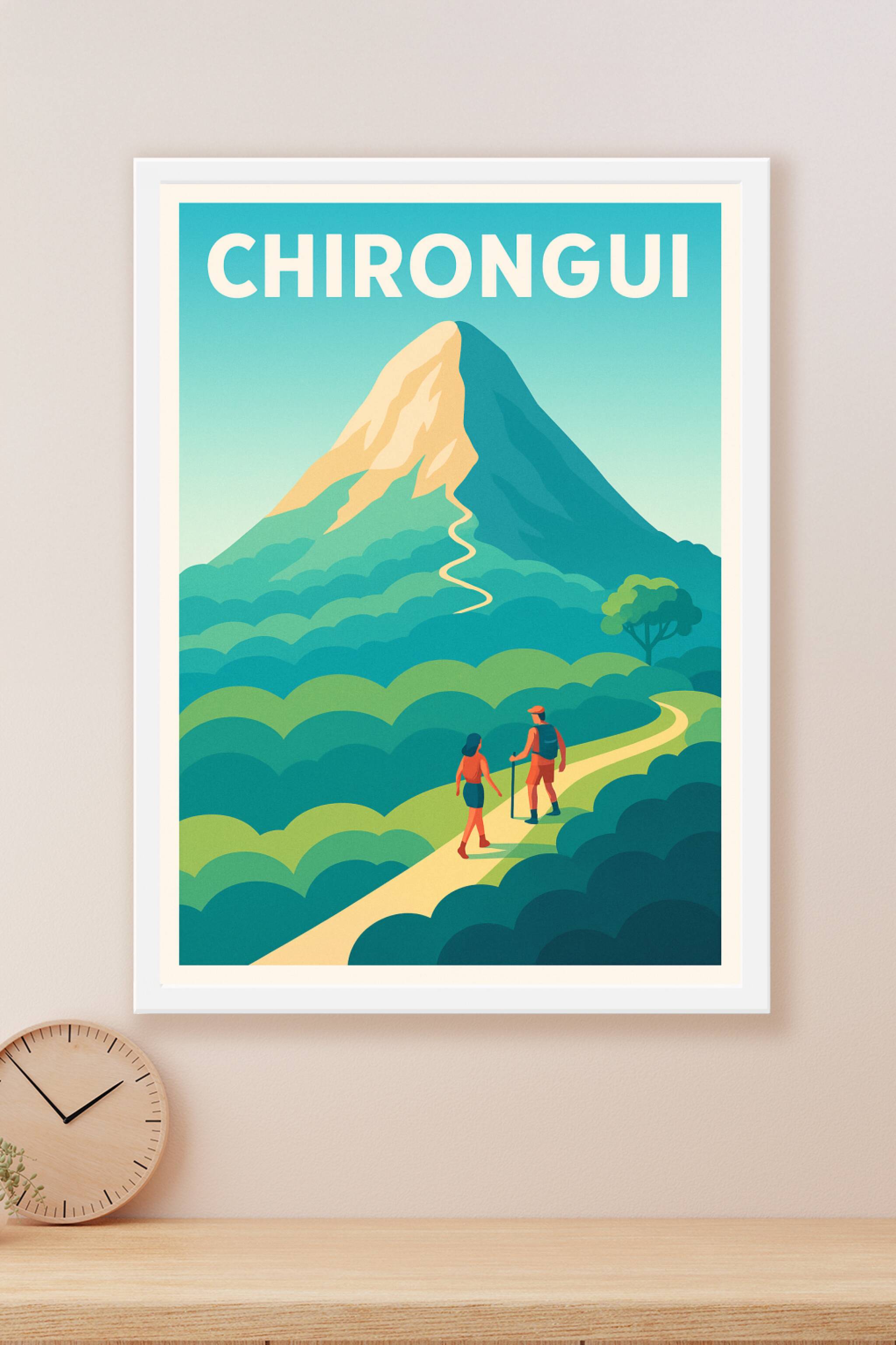 Découvrez la beauté sauvage de Chirongui à travers cette affiche illustrée mettant en scène une randonnée en pleine nature vers un sommet emblémati...