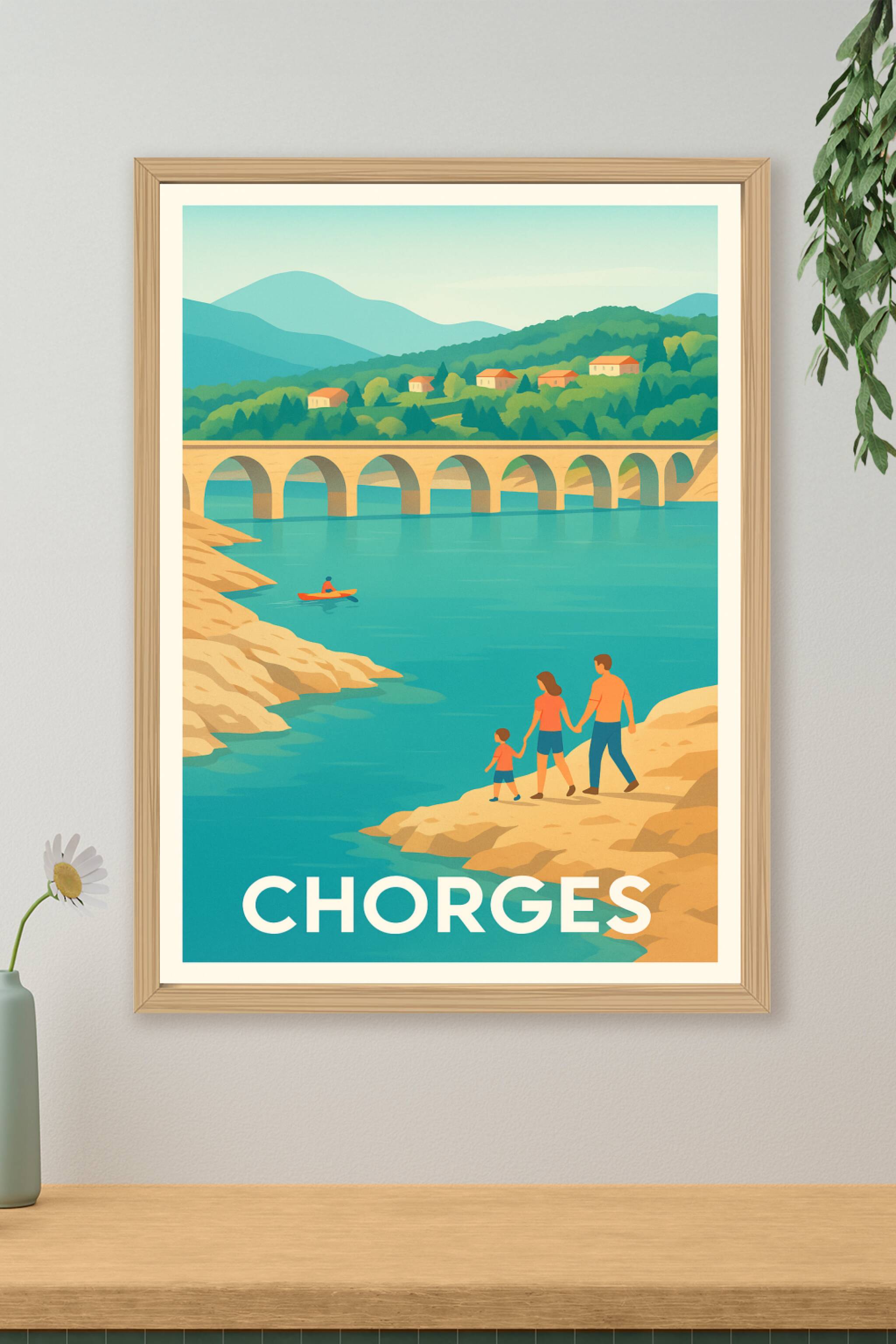 Découvrez la sérénité et la beauté naturelle de Chorges avec cette affiche illustrée mettant en scène une famille au bord d'une rivière aux eaux tu...