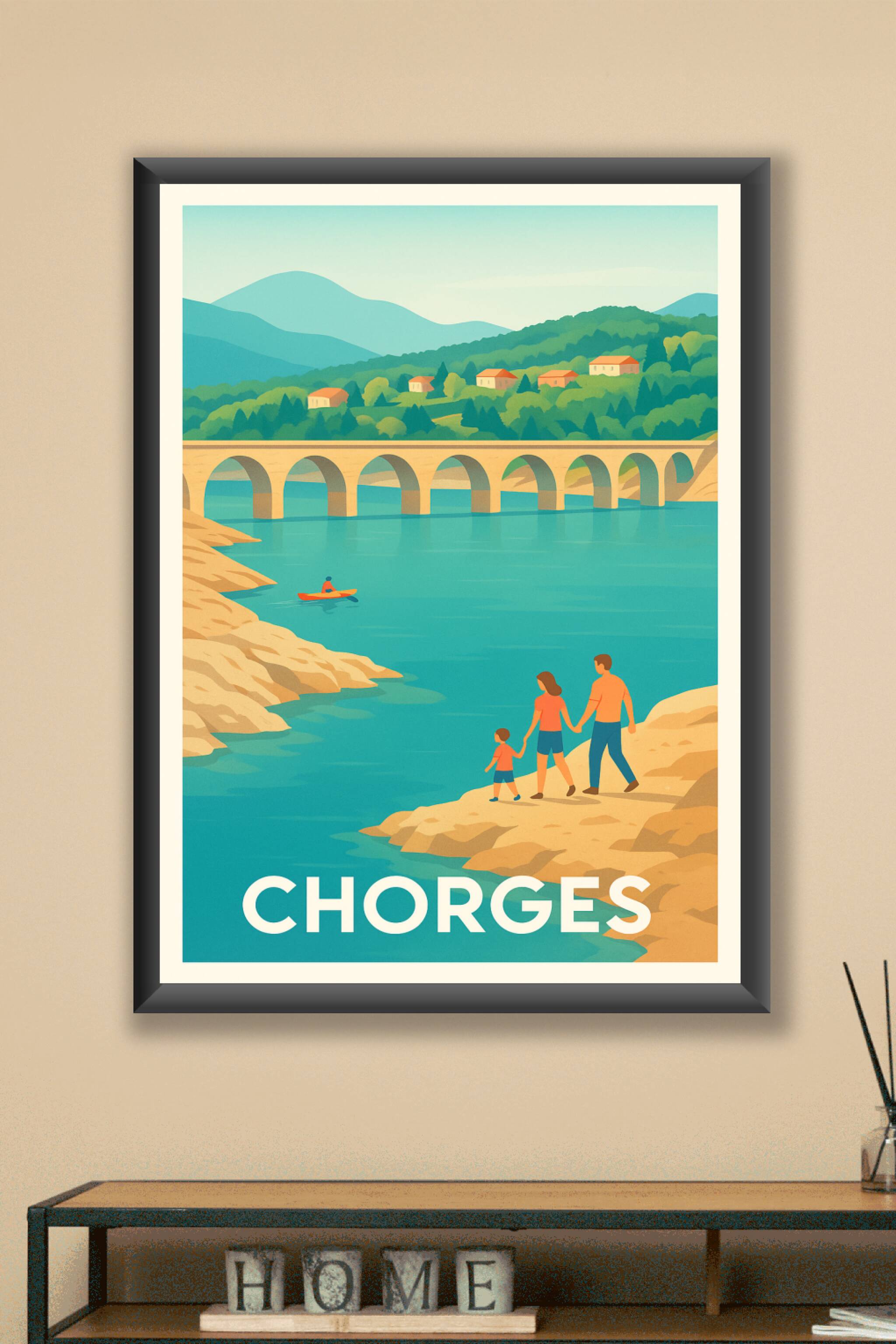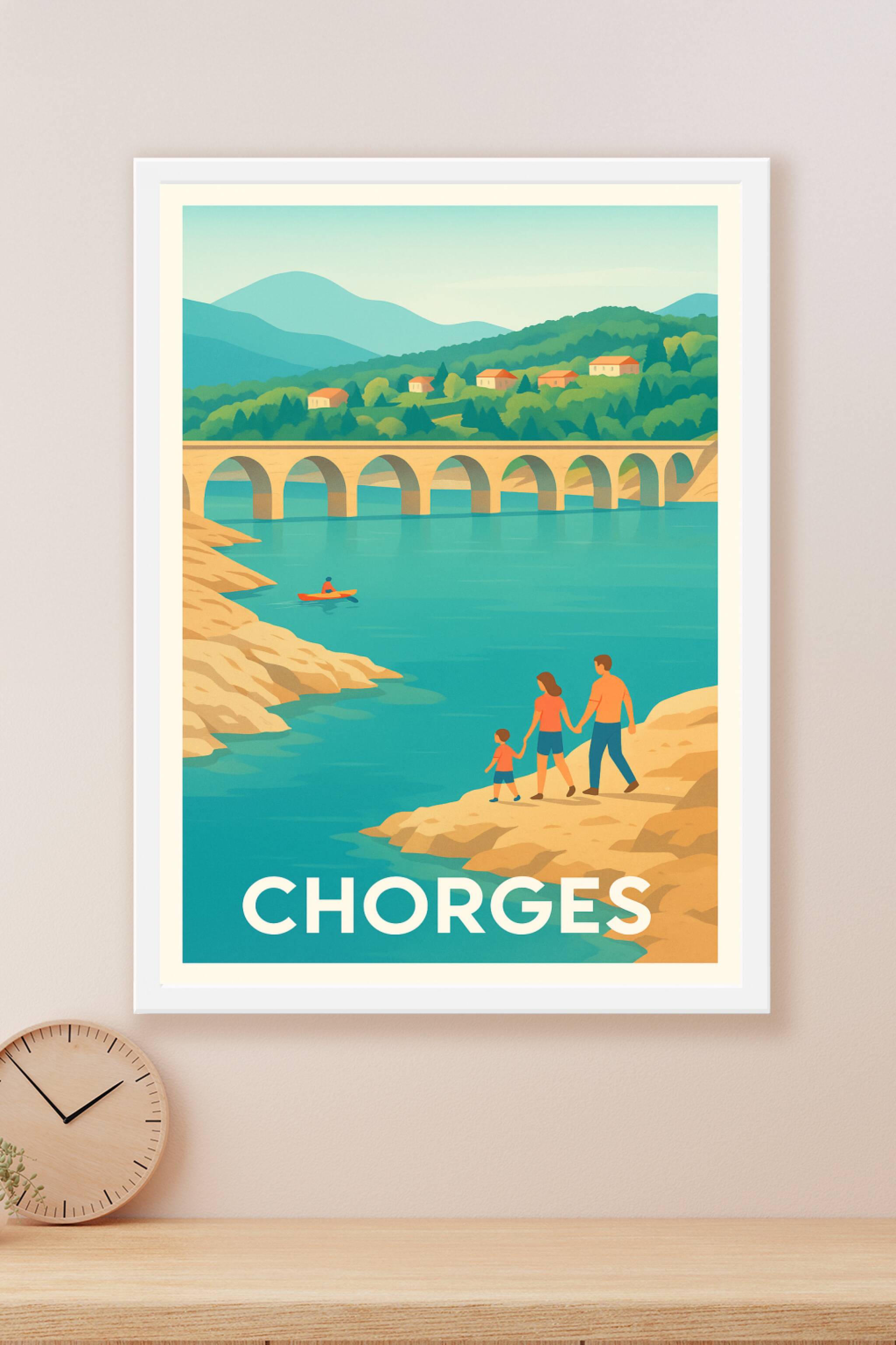 Découvrez la sérénité et la beauté naturelle de Chorges avec cette affiche illustrée mettant en scène une famille au bord d'une rivière aux eaux turquoise, avec un pont en pierres et de douces collines en arrière-plan. Ce poster apporte une touche de calme et d'évasion à votre intérieur, évoquant les plaisirs simples de la vie en pleine nature. Disponible en tirage "Fine Art" de qualité exceptionnelle, ces affiches sont imprimées sur papier 305g coton pour garantir des couleurs vibrantes et une durabilité optimale. Choisissez parmi les formats A1 à A4, avec ou sans cadre, pour parfaitement s'adapter à votre décoration. Offrez-vous ou offrez un souvenir unique de Chorges grâce à une impression 100% française et une finition premium.