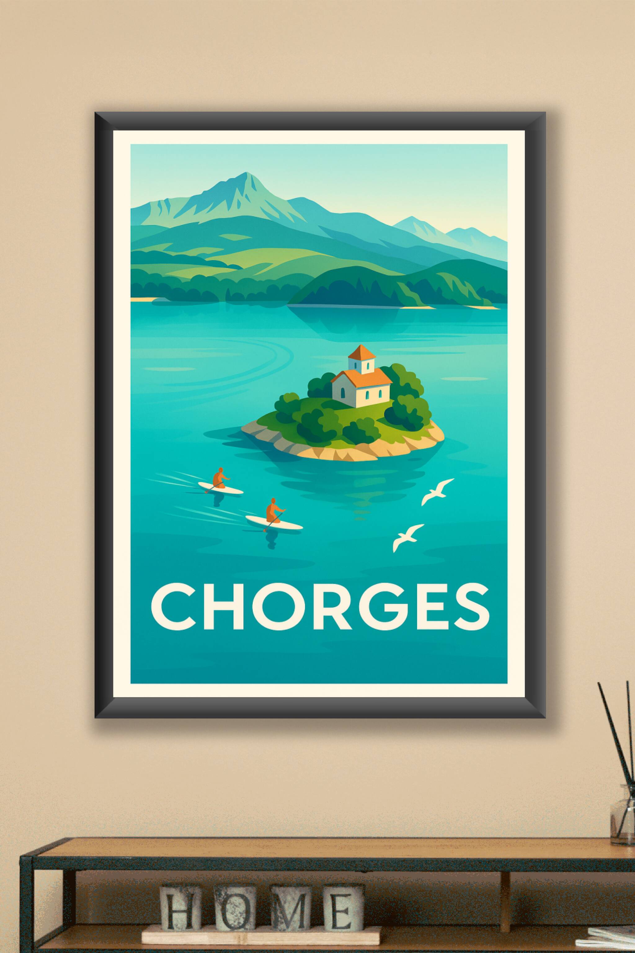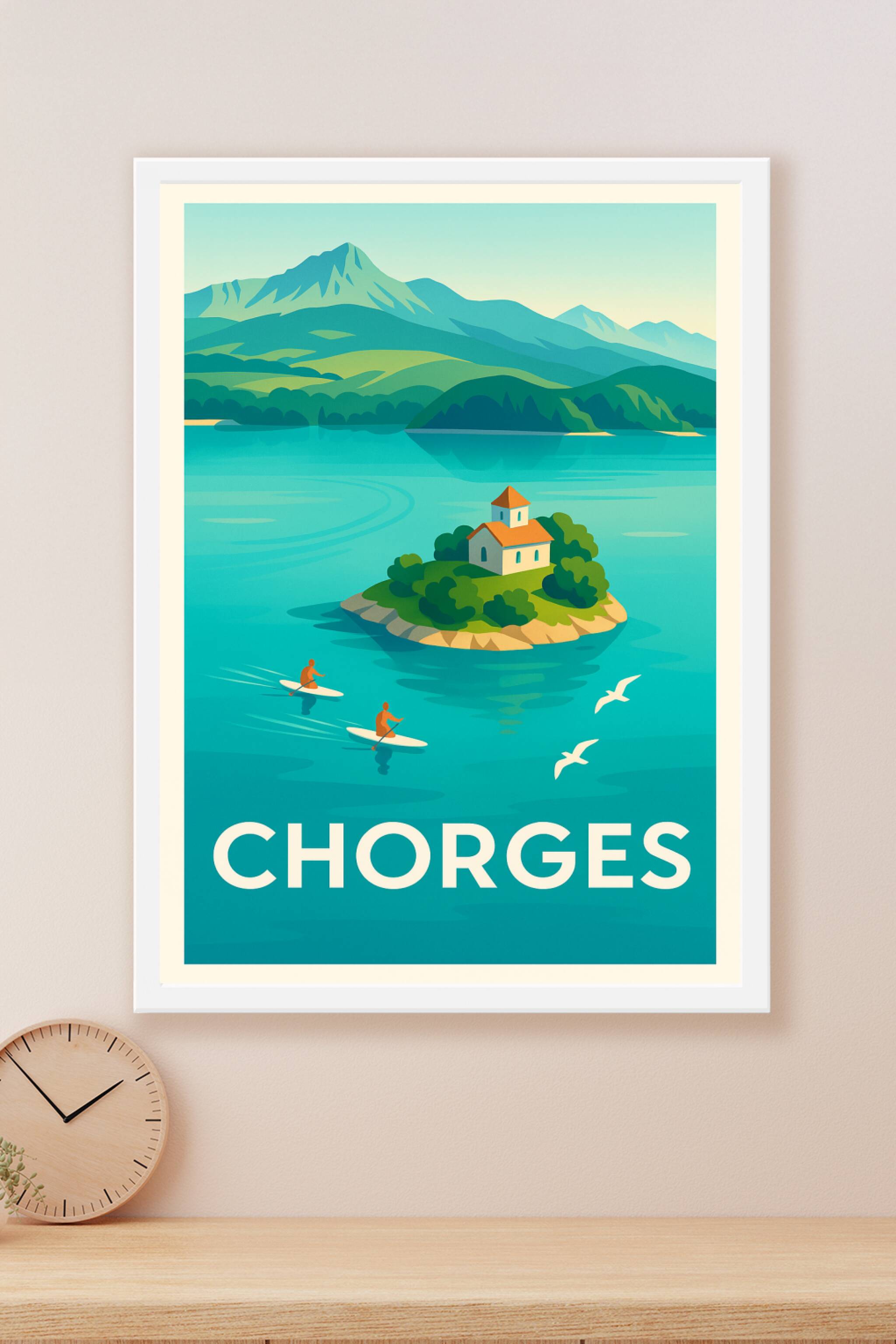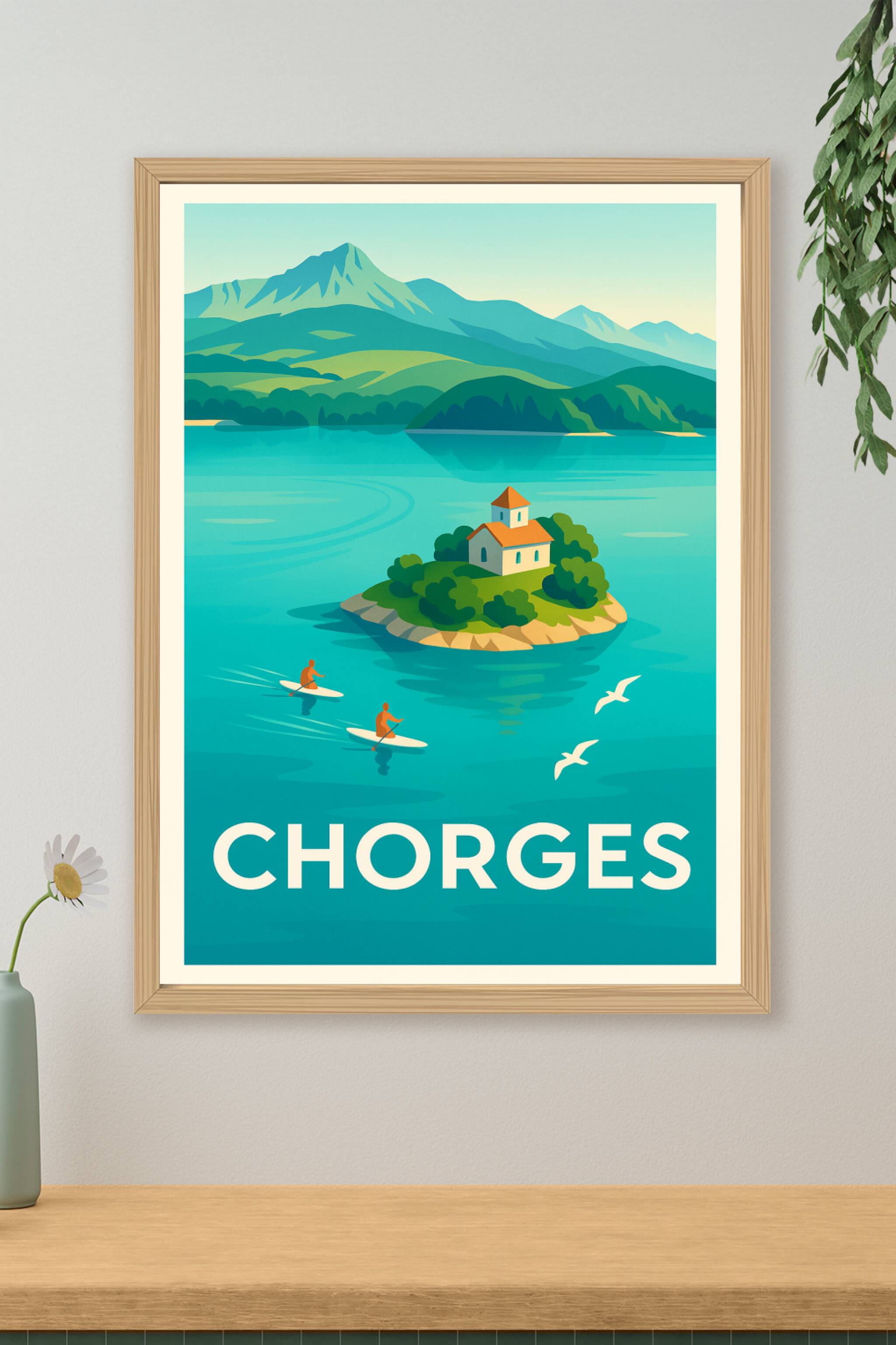 Découvrez la beauté paisible de Chorges à travers cette affiche illustrée, où un petit îlot sur un lac turquoise se détache devant les majestueuses...