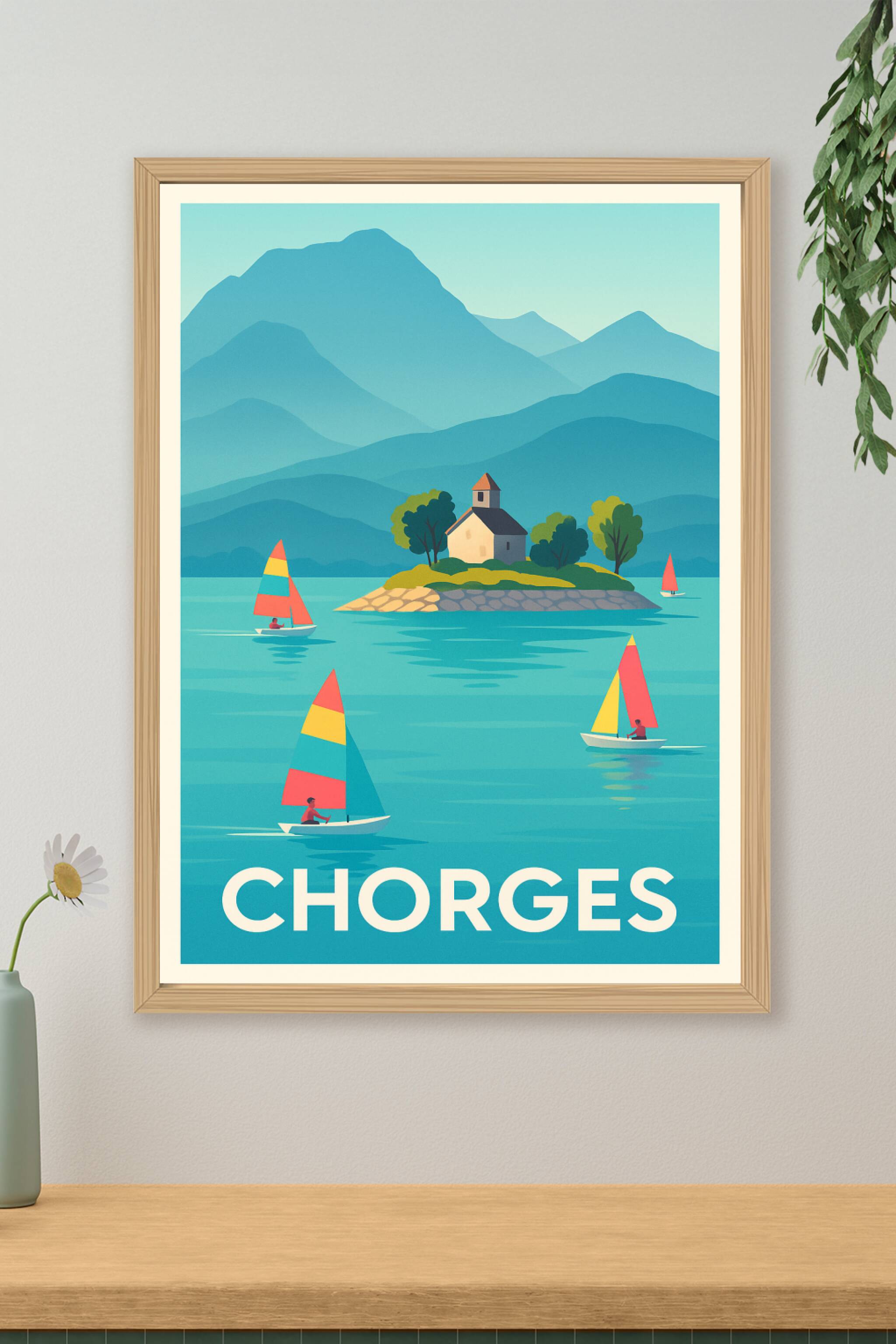 Découvrez la sérénité de Chorges à travers cette affiche illustrée mettant en scène des voiliers colorés glissant sur des eaux calmes, avec une pet...