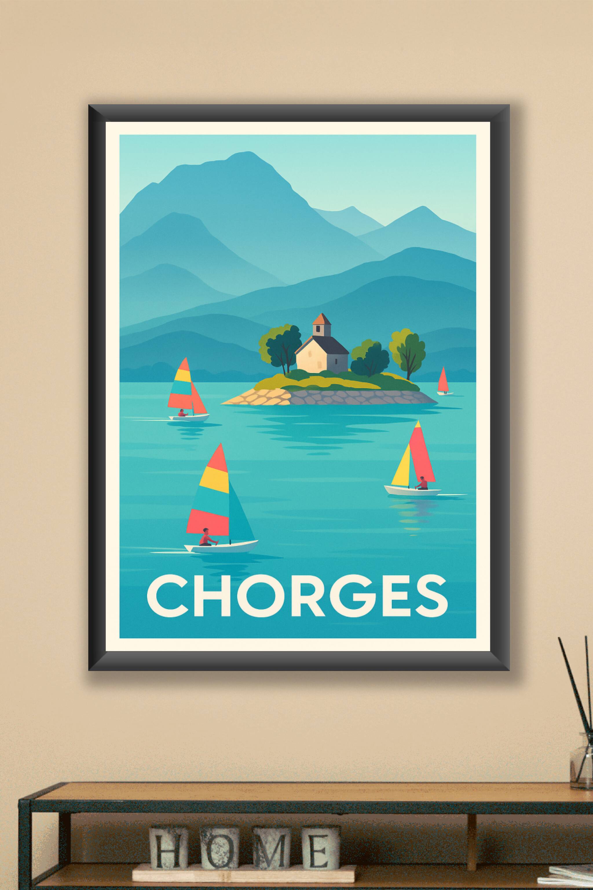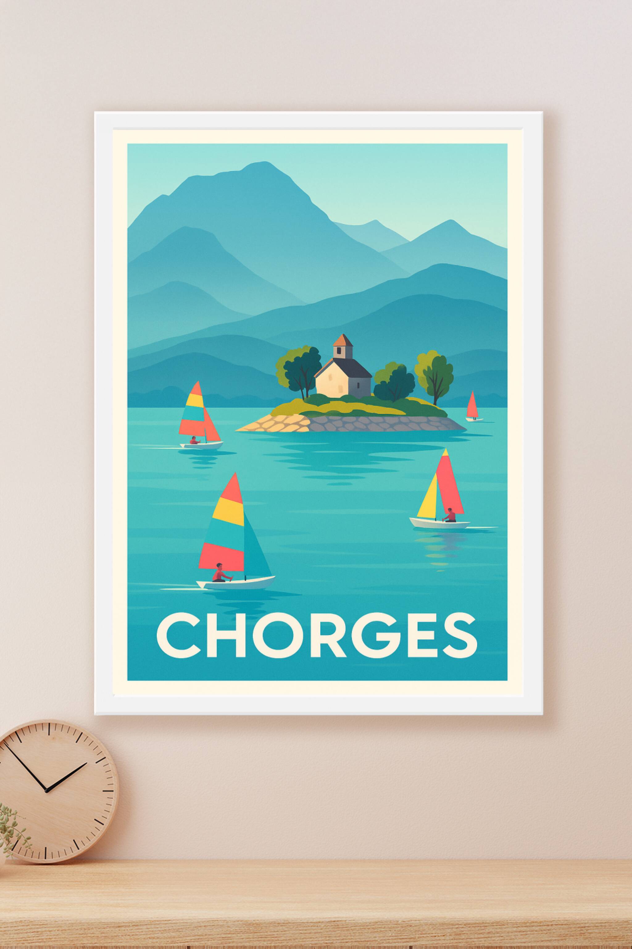 Découvrez la sérénité de Chorges à travers cette affiche illustrée mettant en scène des voiliers colorés glissant sur des eaux calmes, avec une petite île et son édifice traditionnel en toile de fond. Cette ambiance paisible et montagnarde apportera une touche de fraîcheur et d'élégance à votre intérieur.Ce poster est disponible en tirage "Fine Art" sur papier 305g coton pour une qualité d'impression exceptionnelle, garantissant des couleurs vibrantes et une durabilité optimale. Choisissez parmi les formats A1 à A4, avec ou sans cadre, pour s'adapter parfaitement à votre espace.Profitez d'une impression 100% française, parfaite pour décorer votre maison ou offrir un souvenir raffiné aux passionnés de paysages alpins.