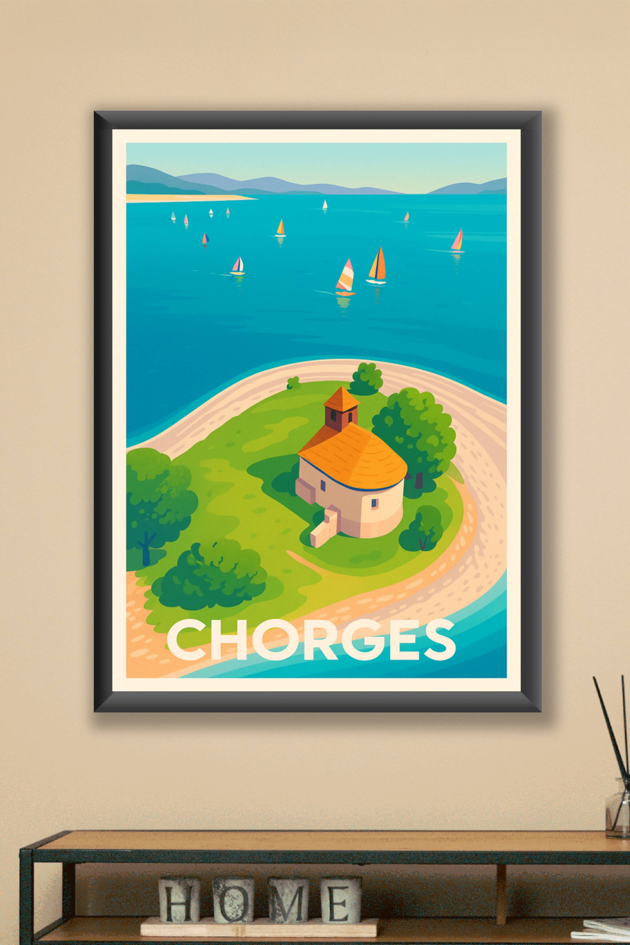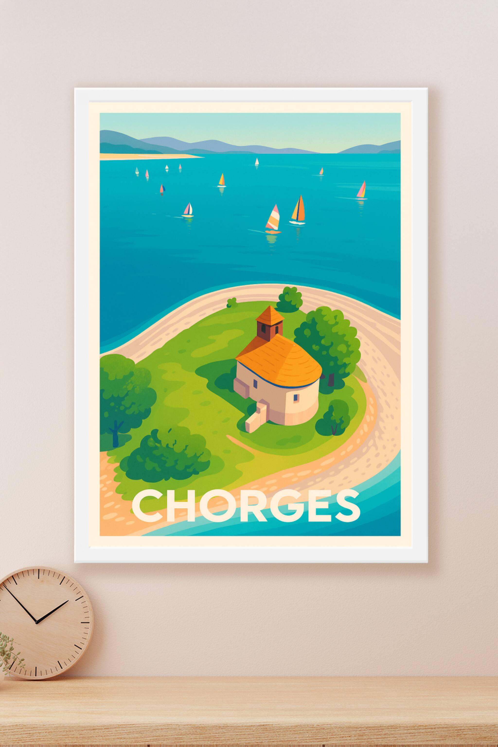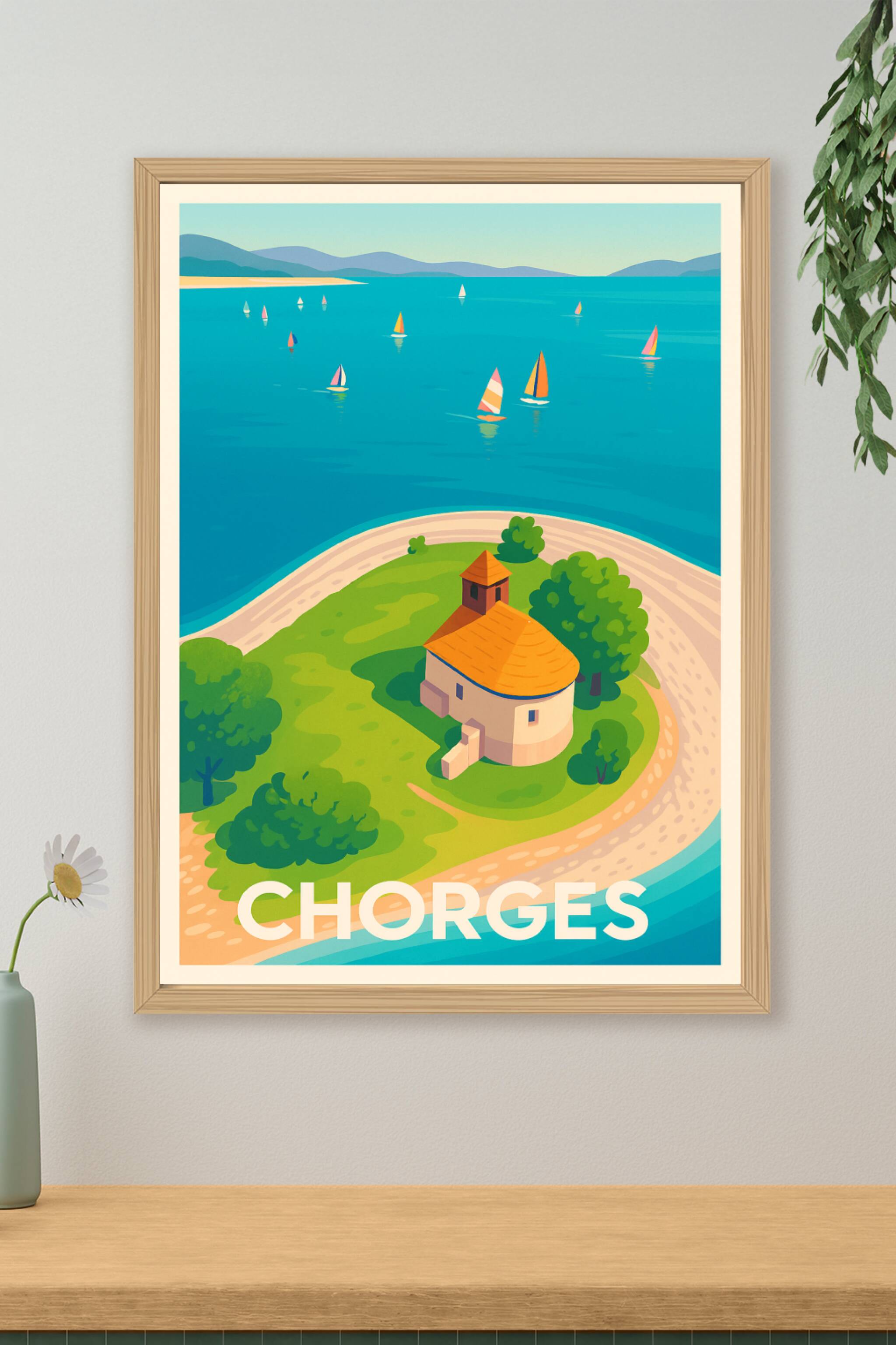 Découvrez la sérénité du lac de Chorges avec cette affiche au style graphique épuré et coloré. Ce poster présente une vue aérienne d’un petit édifi...