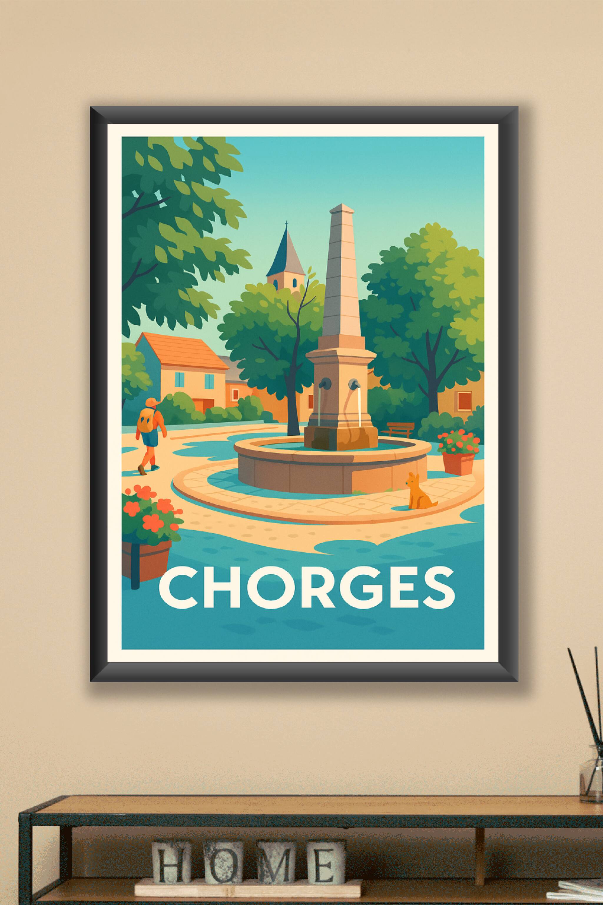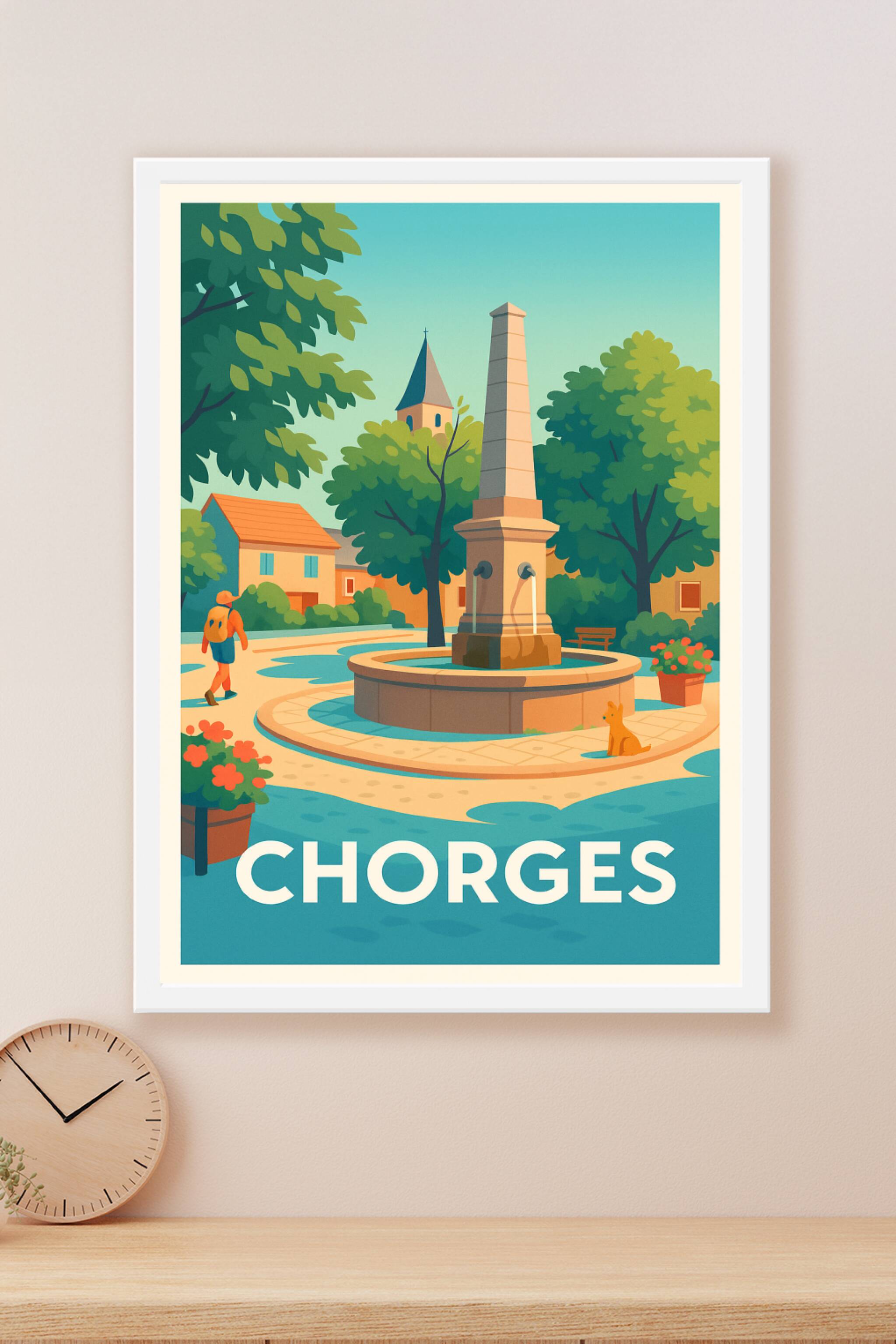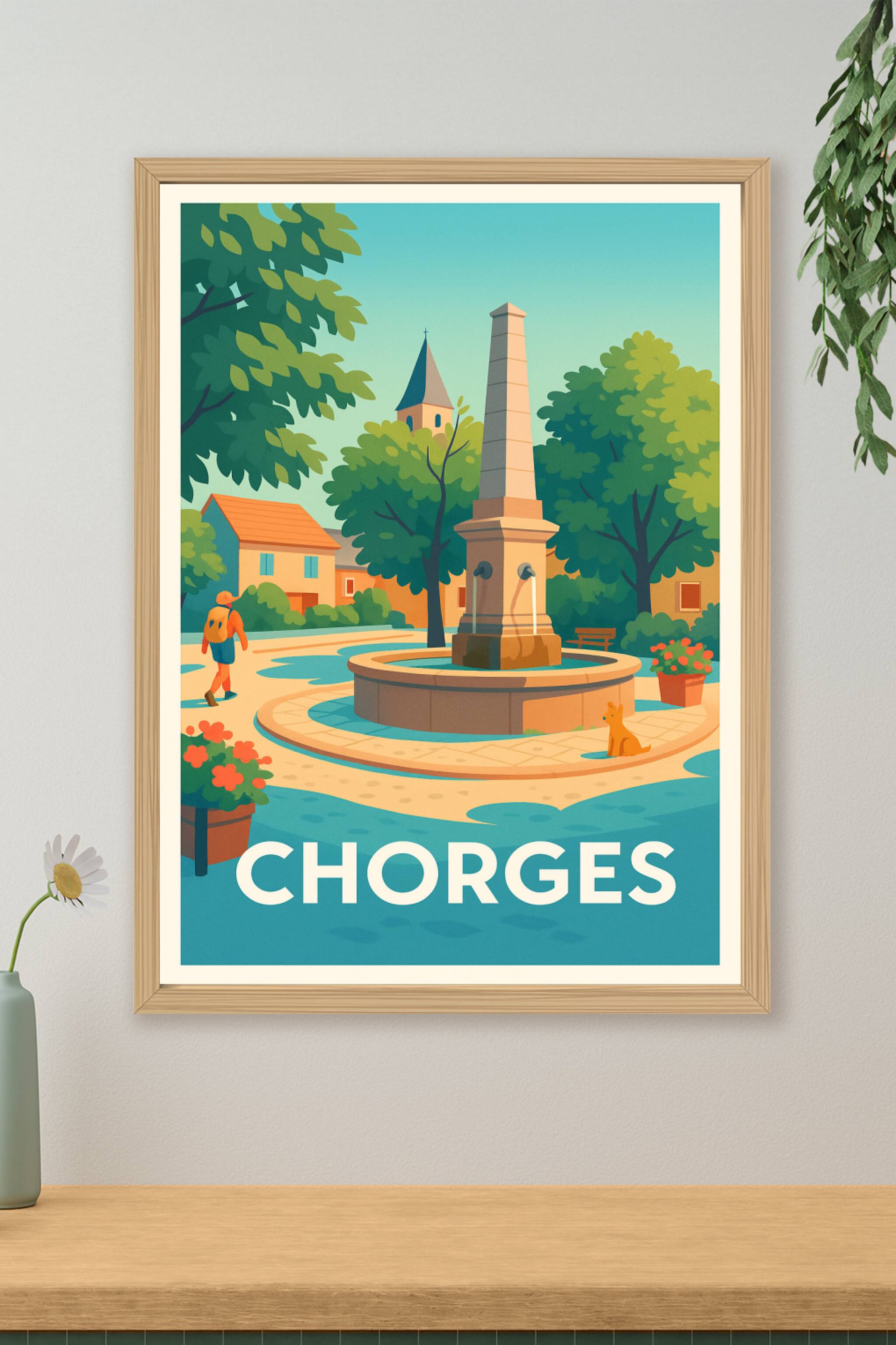 Découvrez la douceur de vivre à Chorges avec cette affiche illustrée, mettant en scène la place centrale et sa fontaine entourée d'arbres et de mai...