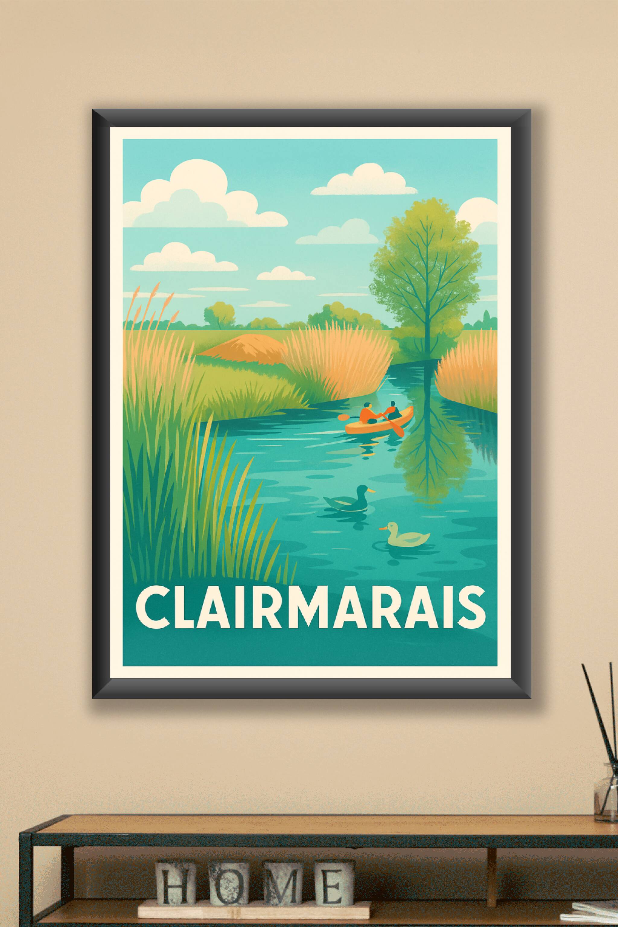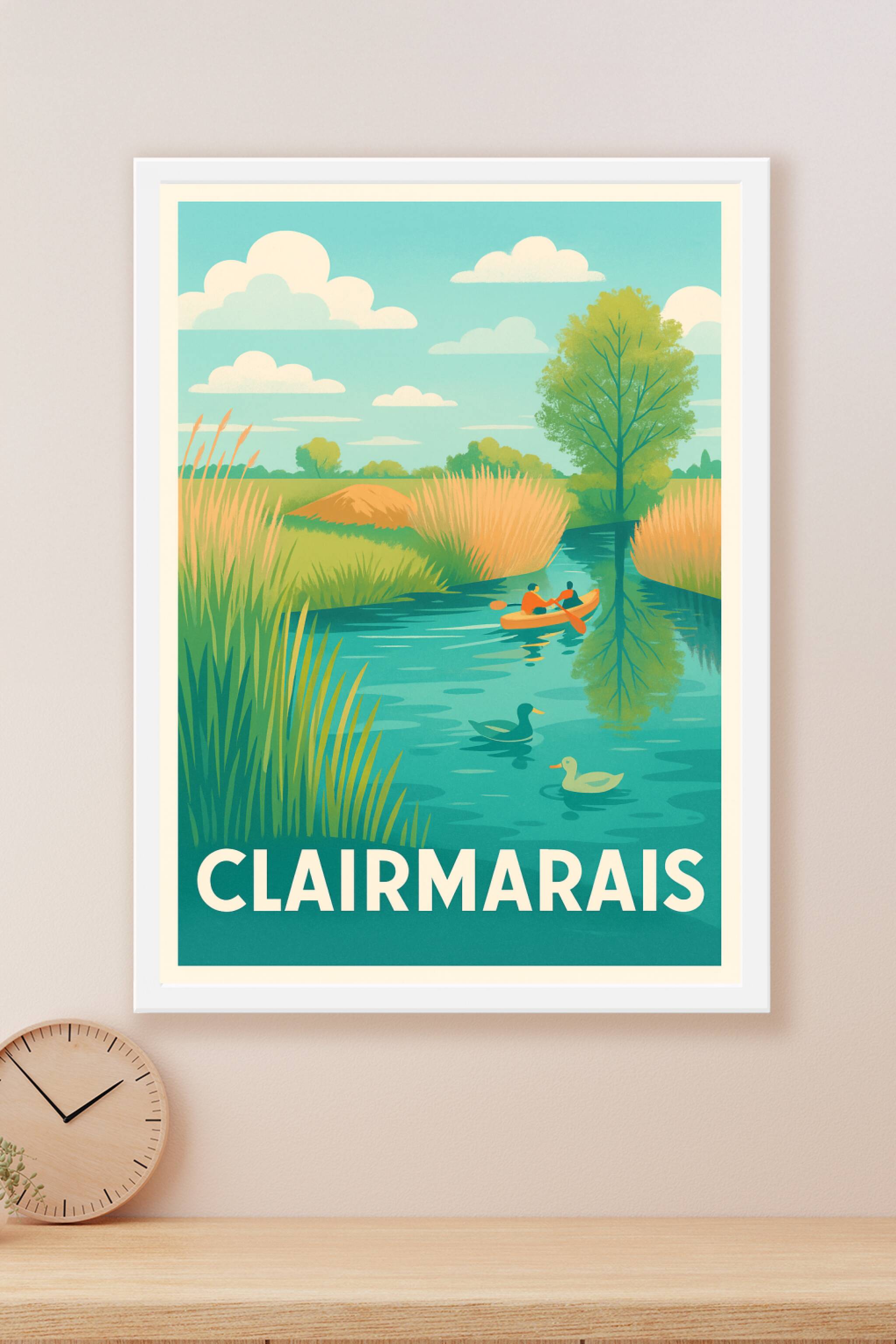 Découvrez la sérénité des marais de Clairmarais avec cette affiche au style vintage et aux couleurs apaisantes. Ce poster illustre une promenade pa...