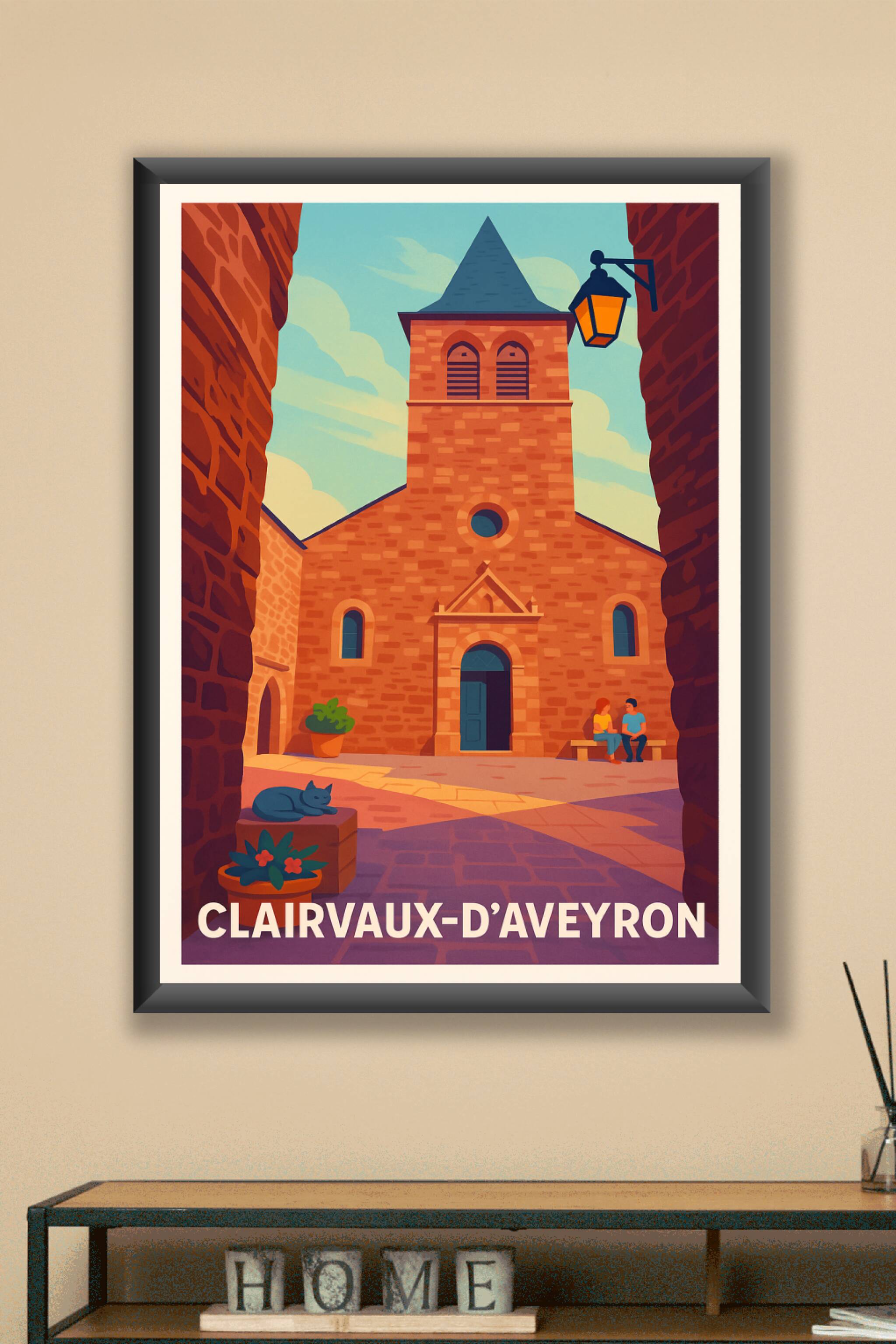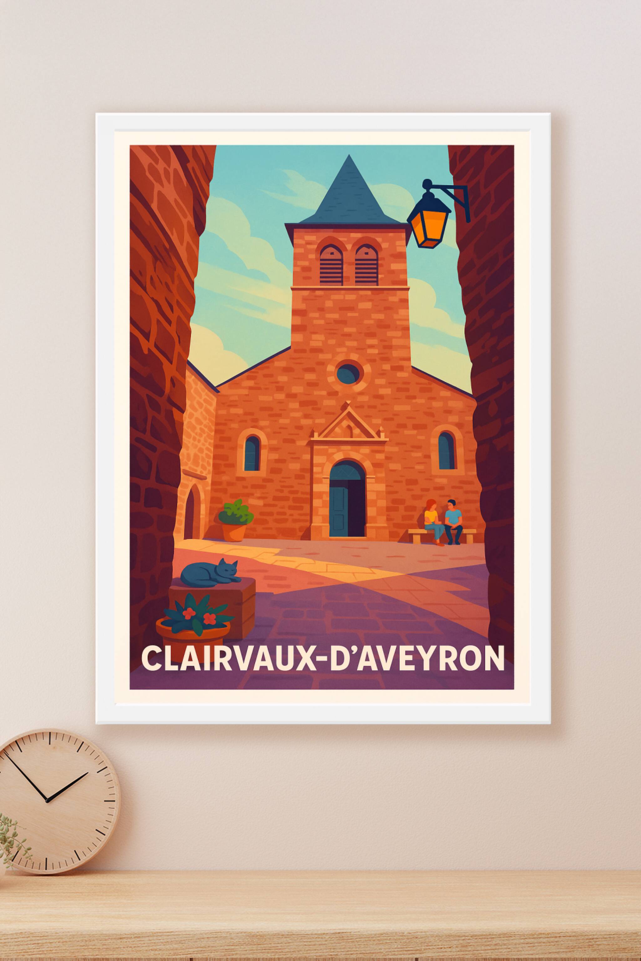Découvrez l’atmosphère paisible et authentique de Clairvaux-d’Aveyron avec cette affiche illustrée mettant en valeur l’architecture en pierre typique de ce village pittoresque. Sur ce poster, la lumière douce du soleil réchauffe les ruelles, avec une belle scène de vie locale où un chat somnole et deux habitants échangent sur un banc. Imprimée en tirage "Fine Art" sur papier 305g coton, cette affiche vous garantit une qualité d'impression irréprochable et des couleurs éclatantes, parfaitement adaptée pour sublimer votre décoration intérieure ou pour offrir un souvenir unique de cette région. Disponible en formats A1 à A4, avec ou sans cadre, ce poster s'adapte à toutes vos envies déco.