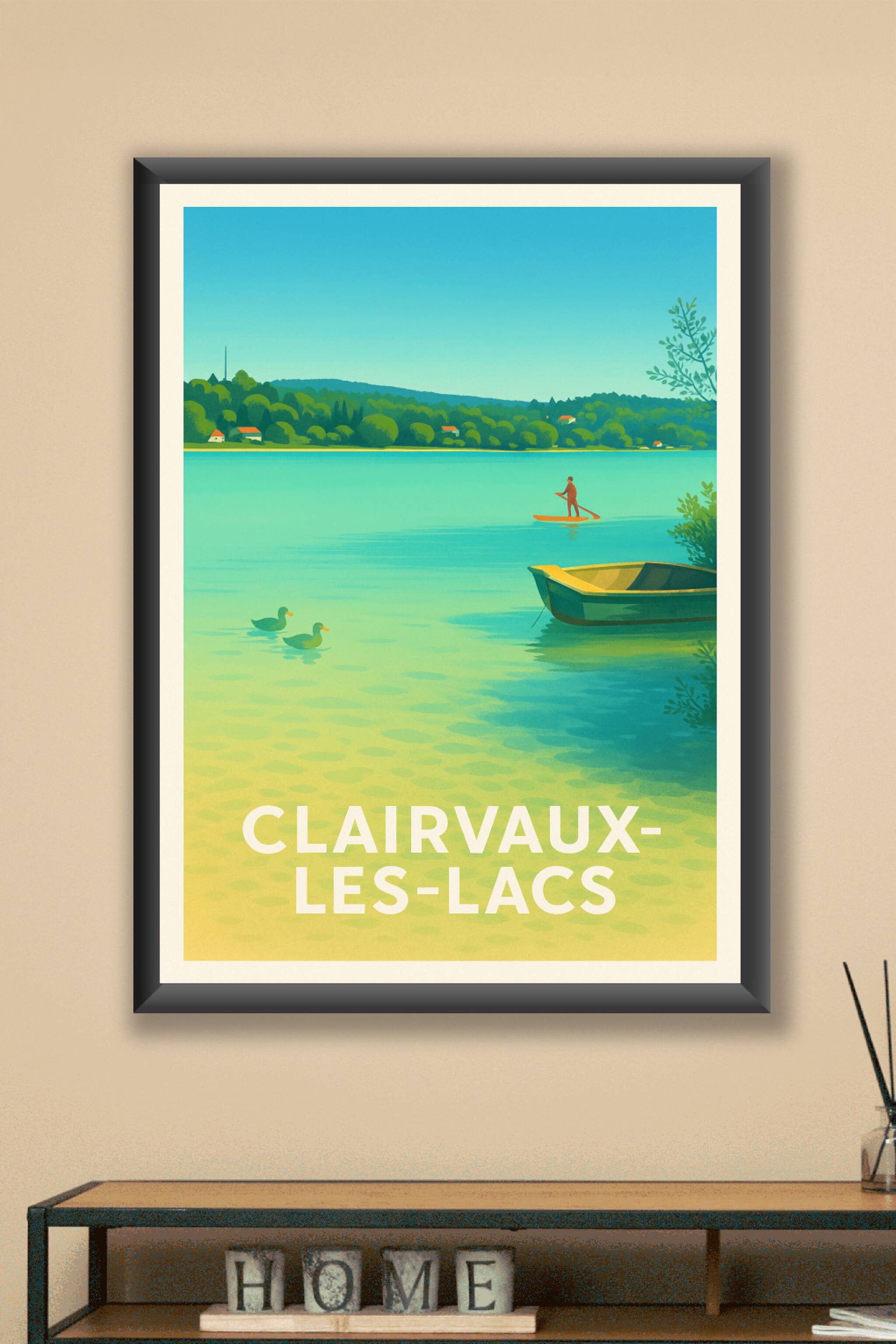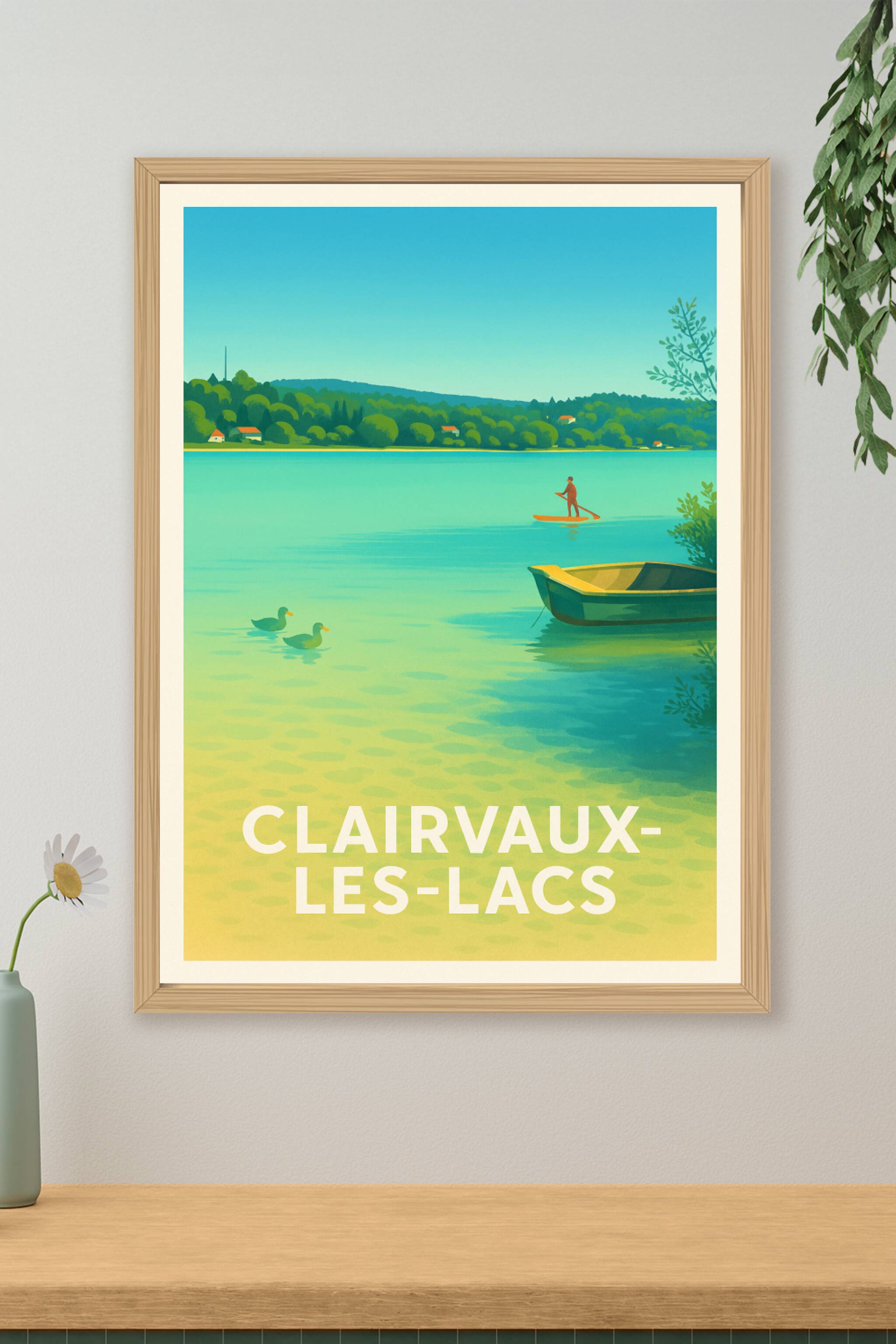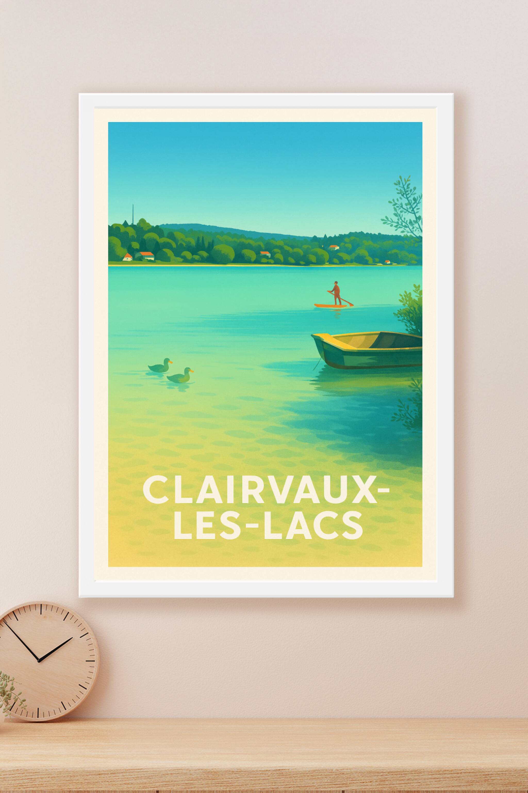 Découvrez la douceur et la tranquillité de Clairvaux-les-Lacs à travers cette affiche envoûtante qui capture l'essence paisible de ses lacs et pays...