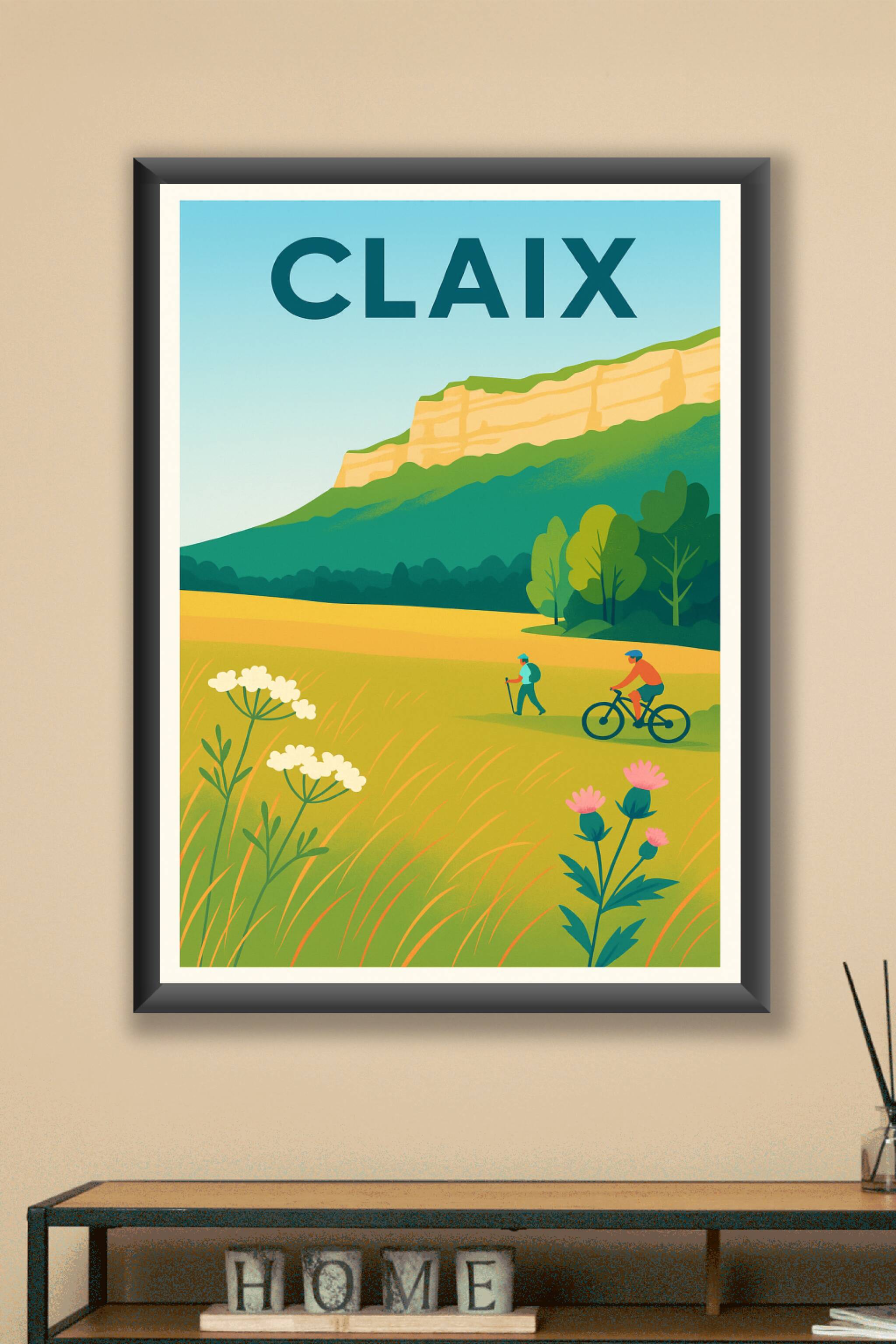 Découvrez la beauté paisible de Claix à travers cette affiche colorée et vivante qui capture l'essence des paysages champêtres et des activités de plein air. Ce poster illustre une scène bucolique avec randonneurs et cycliste évoluant au pied des falaises dorées, au cœur d'une nature verdoyante et apaisante. Imprimée en tirage Fine Art sur papier 305g coton, cette affiche garantit une qualité d'impression exceptionnelle, aux couleurs vives et durables. Disponible du format A1 à A4, avec ou sans cadre, elle s'adapte parfaitement à votre décoration intérieure ou à un cadeau élégant pour les amoureux des grands espaces. Fabriquée en France, cette affiche apporte une touche d'évasion et de fraîcheur à votre intérieur.